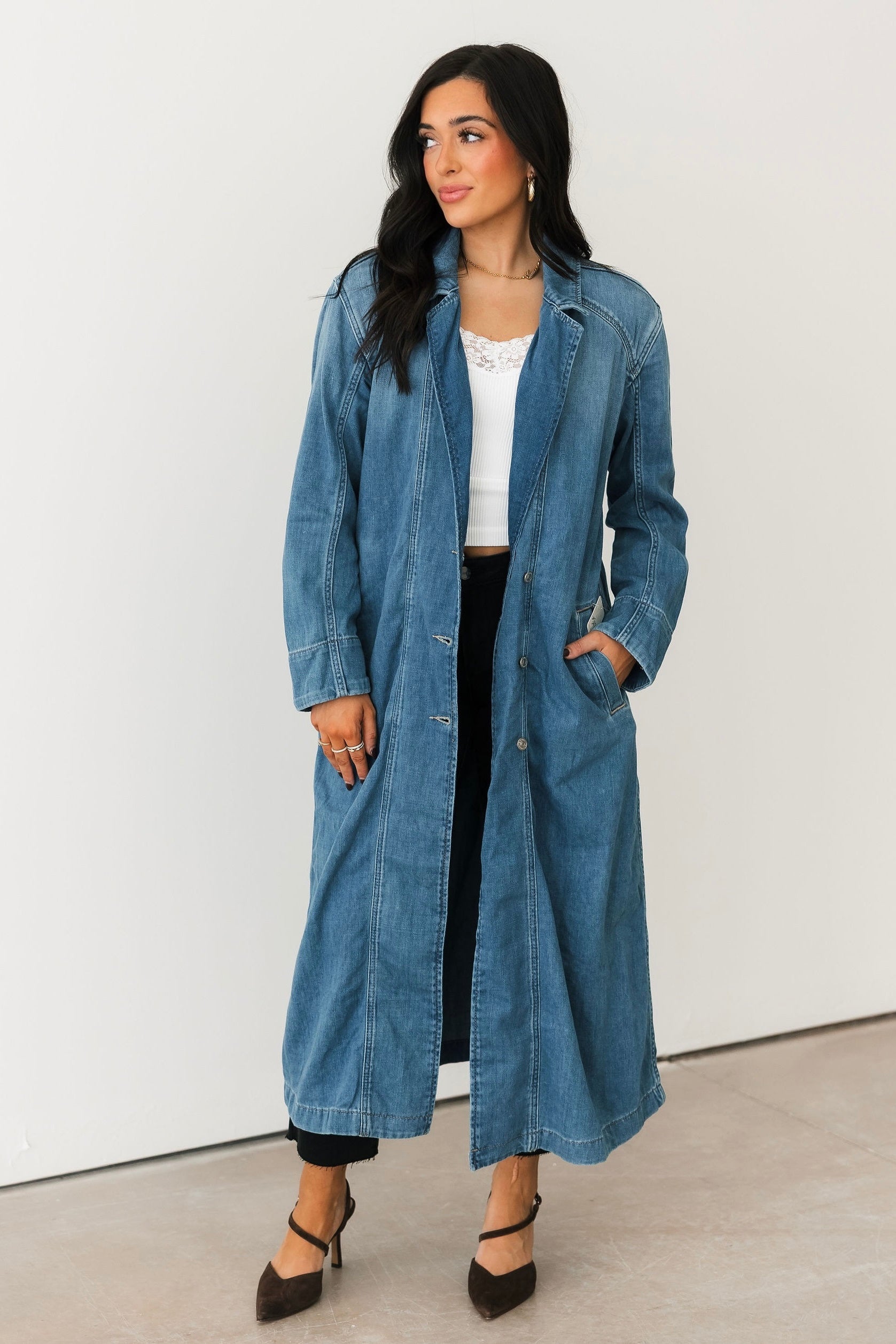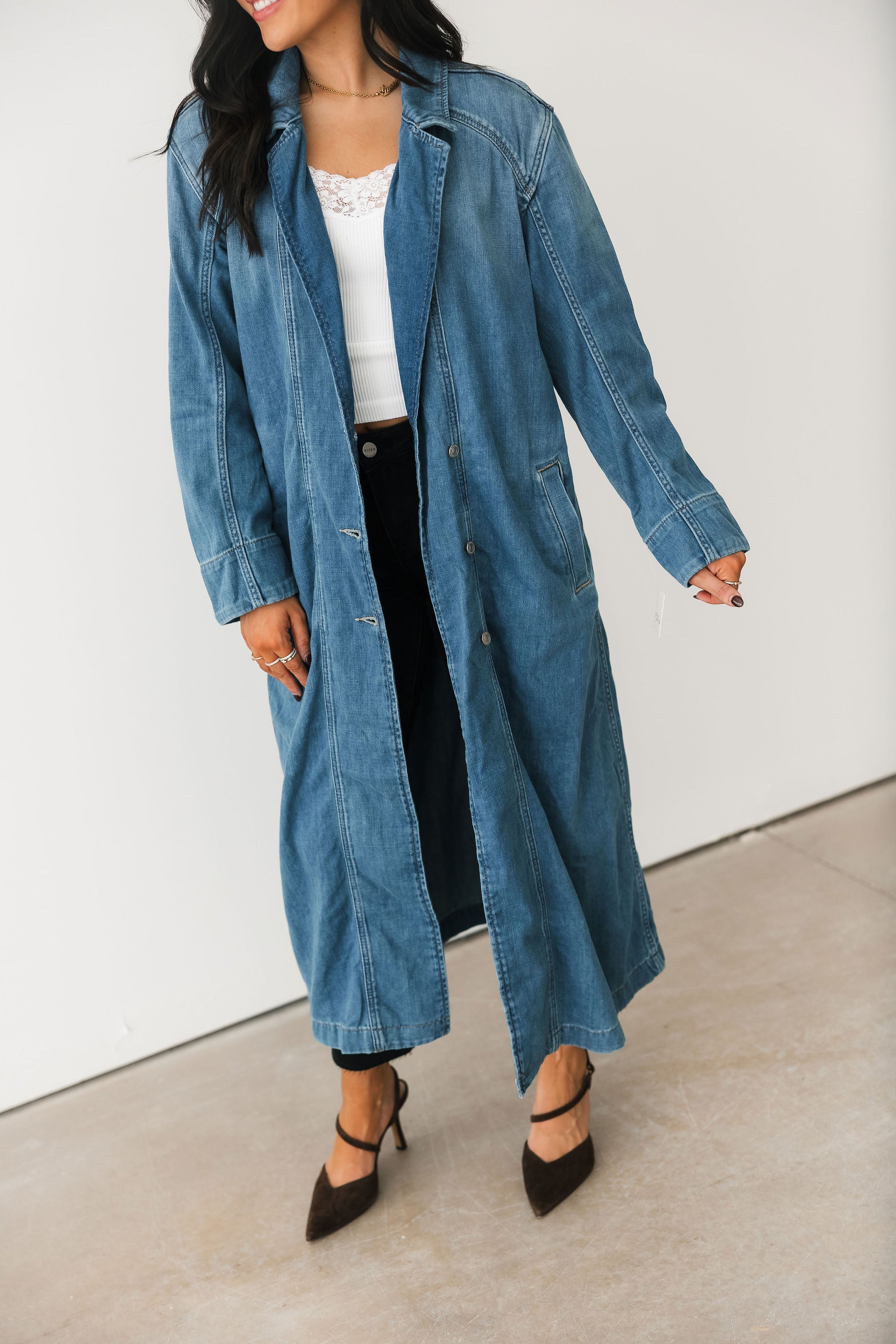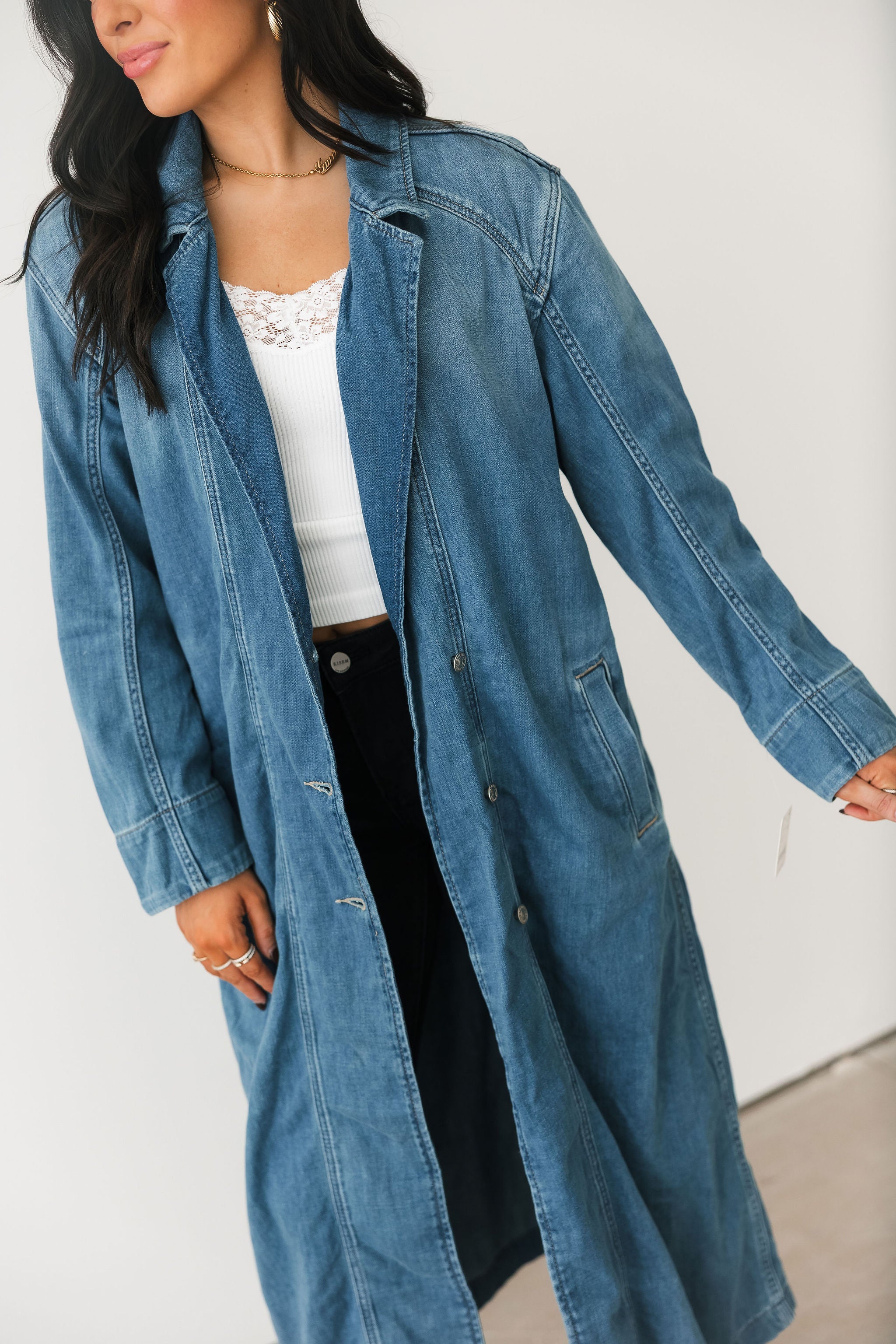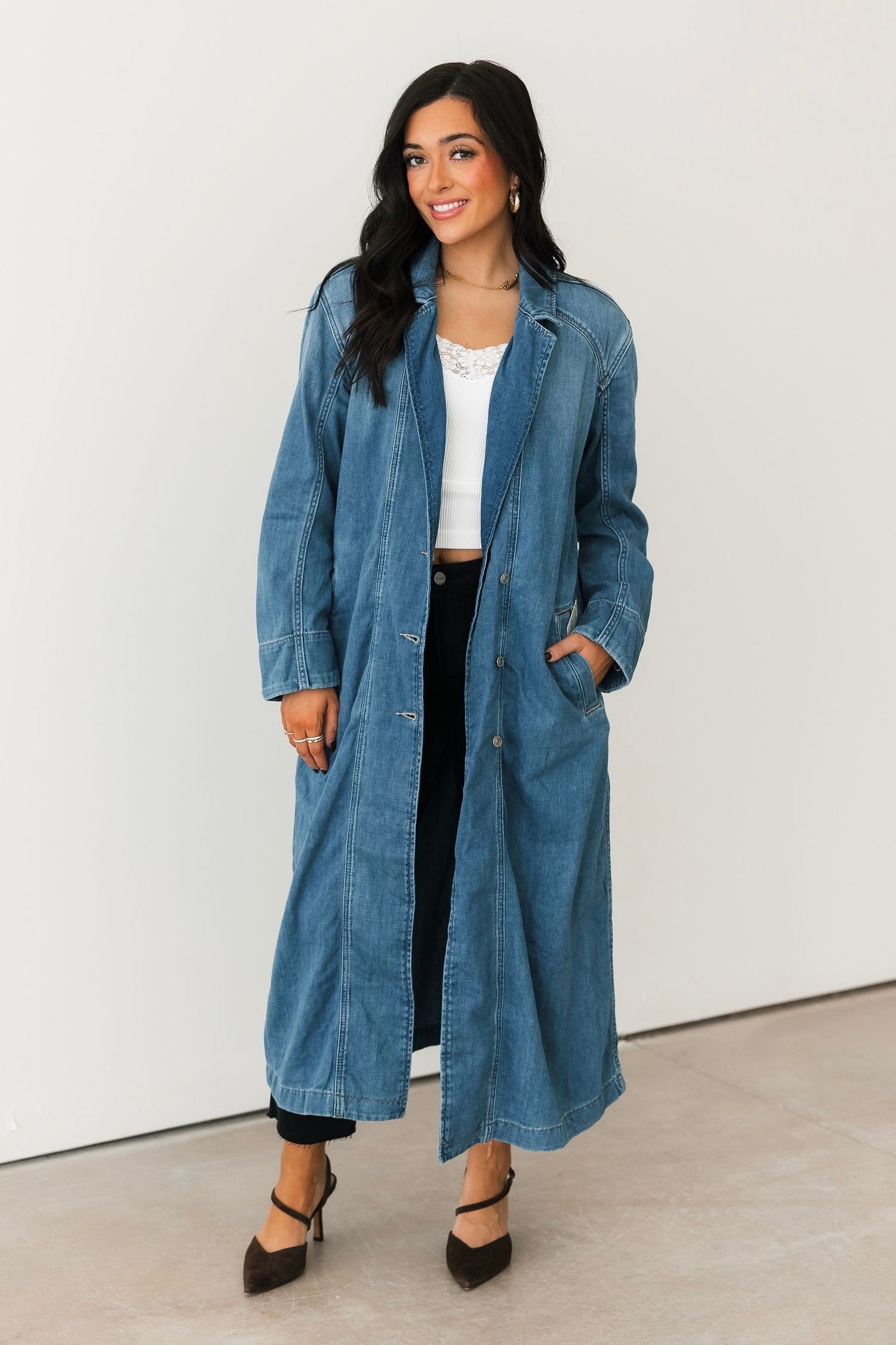Not just any duster. This too-cool coat from the We The Free collection is featured in a denim fabrication with lapel detailing and button closure. Sage is wearing an xs.