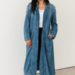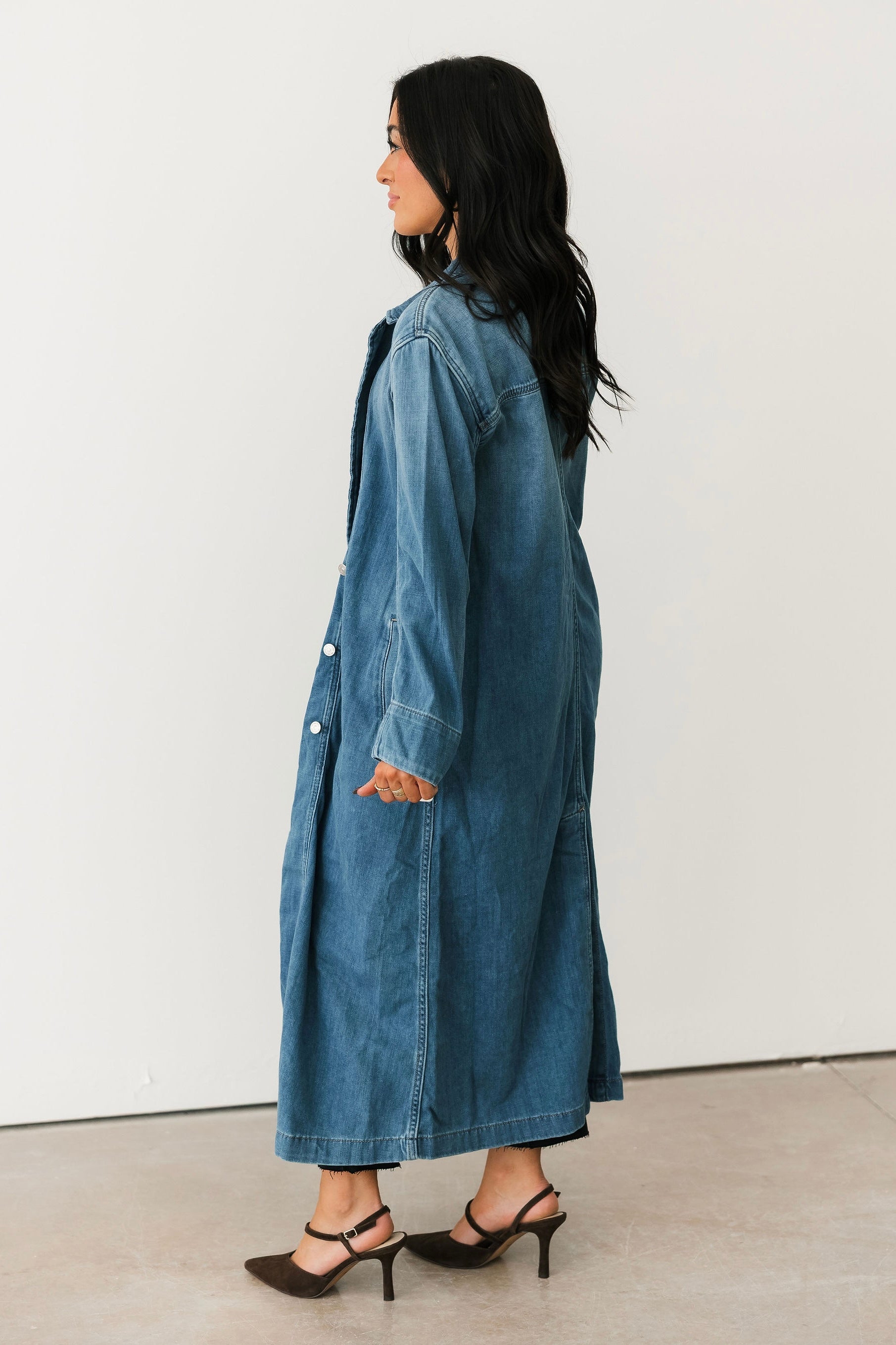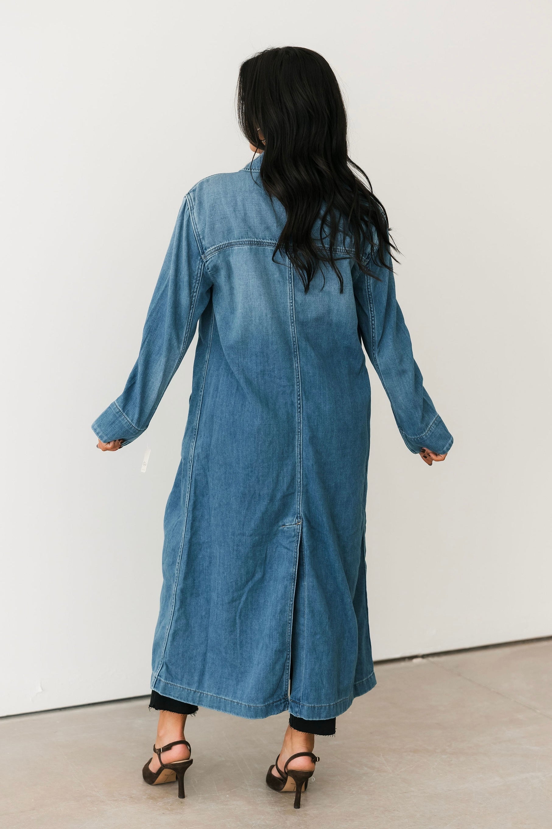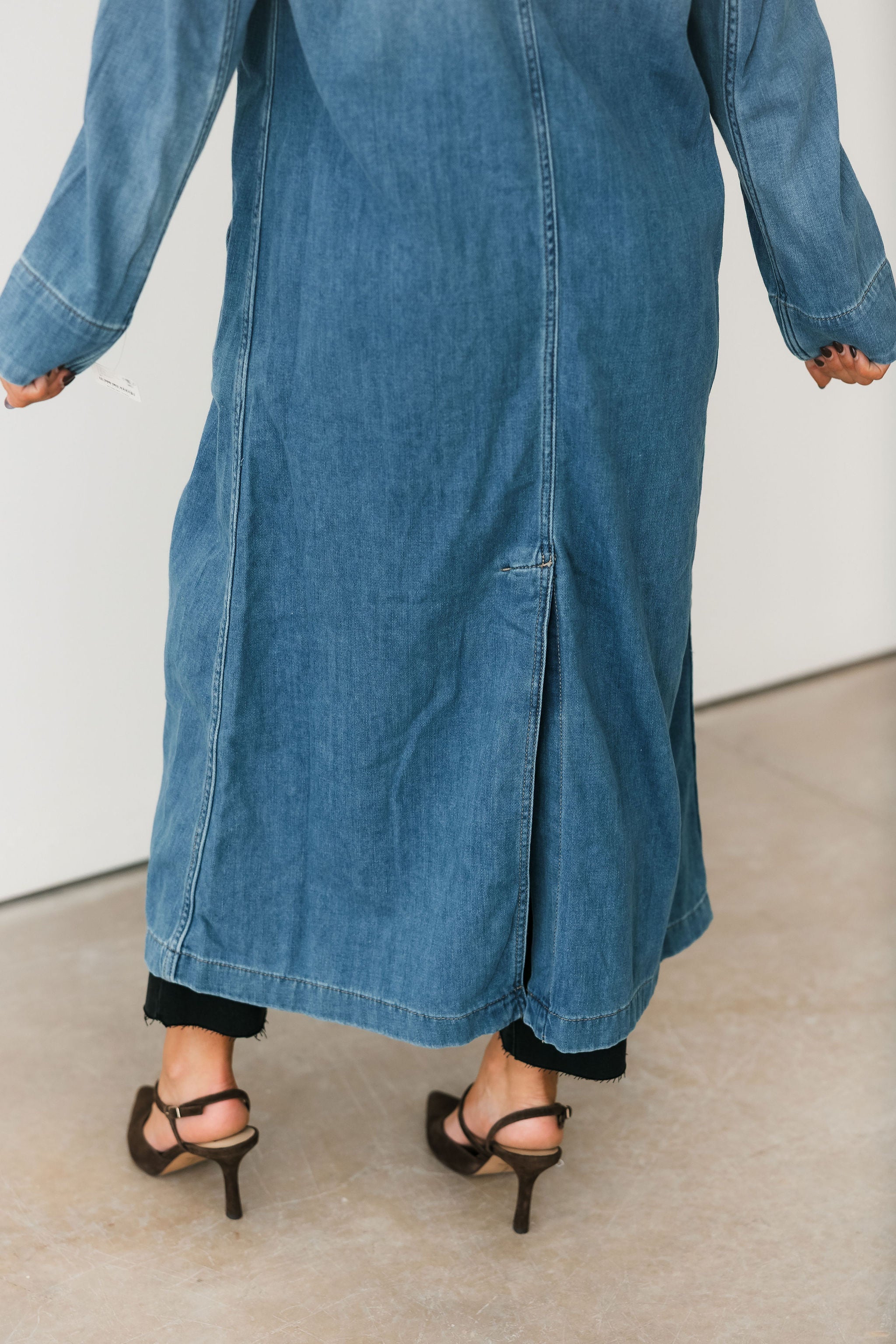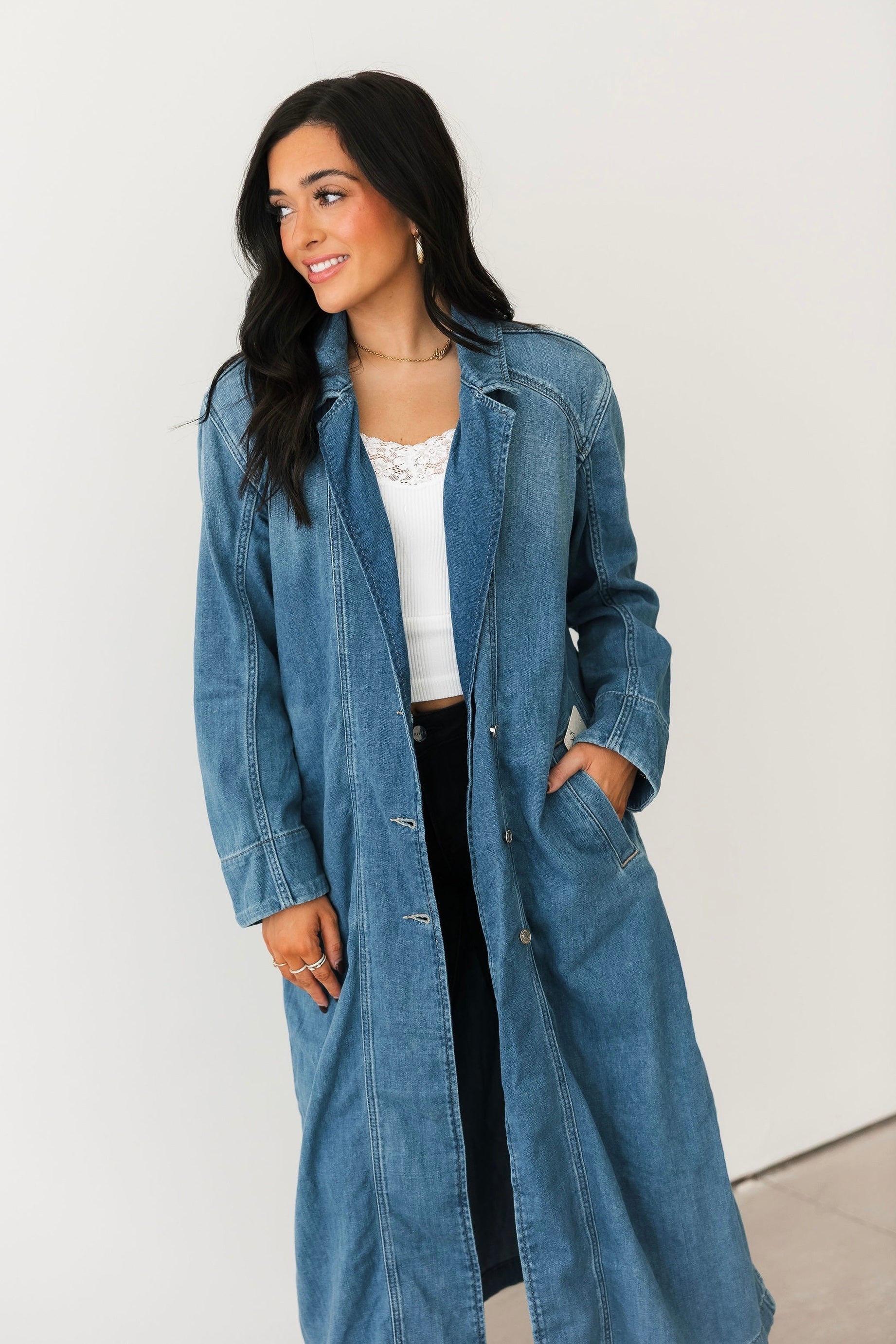 Not just any duster. This too-cool coat from the We The Free collection is featured in a denim fabrication with lapel detailing and button closure. Sage is wearing an xs.