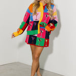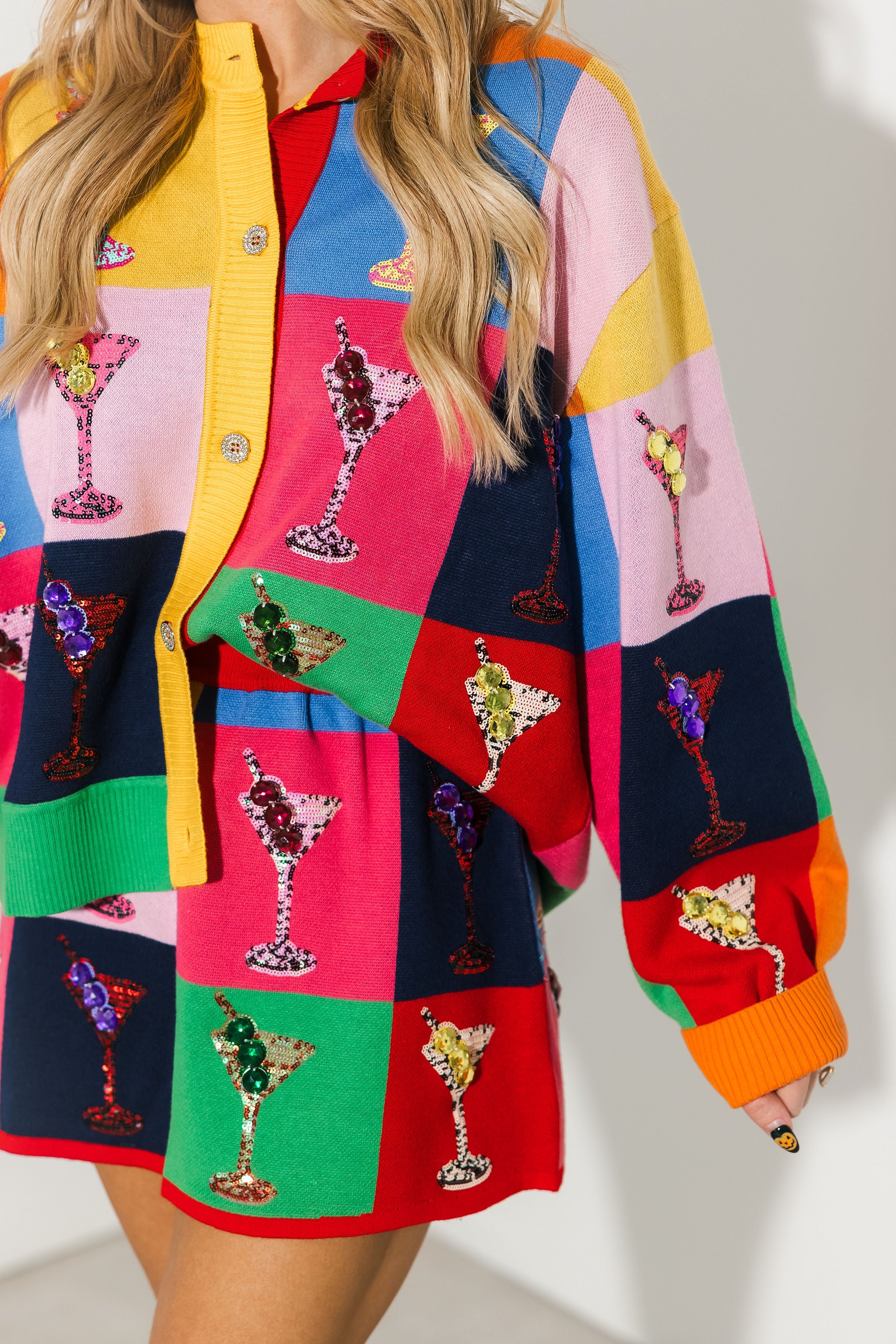 The Queen Of Sparkles Multi Checkered Cosmo Button Up Sweater is a statement piece made for celebration. With its bold checkered knit, sparkling martini glass details, and classic button-up silhouette, it’s versatile enough to wear solo or layered. Pair it with denim for a fun night out or style it with the matching Cosmo Knit Skirt for the ultimate head-turning holiday set. Lexi Jade is wearing an XS.
