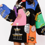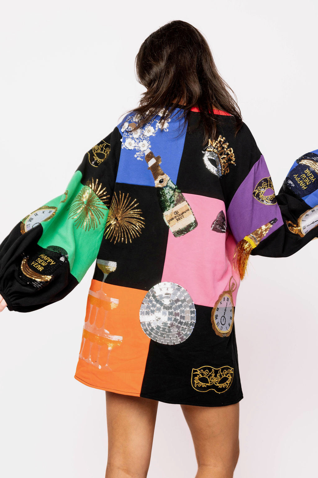 Step into the spotlight with the Queen Of Sparkles Multi Checkered NYE Icon Bubble Sleeve Dress. Designed with bold checkered detailing and adorned with sparkling New Year’s Eve icons—champagne flutes, disco balls, clocks, masks, and party décor—this mini dress captures the fun of the countdown. Its relaxed fit and voluminous bubble sleeves make it effortlessly festive while still comfortable, perfect for ringing in the New Year in standout style.