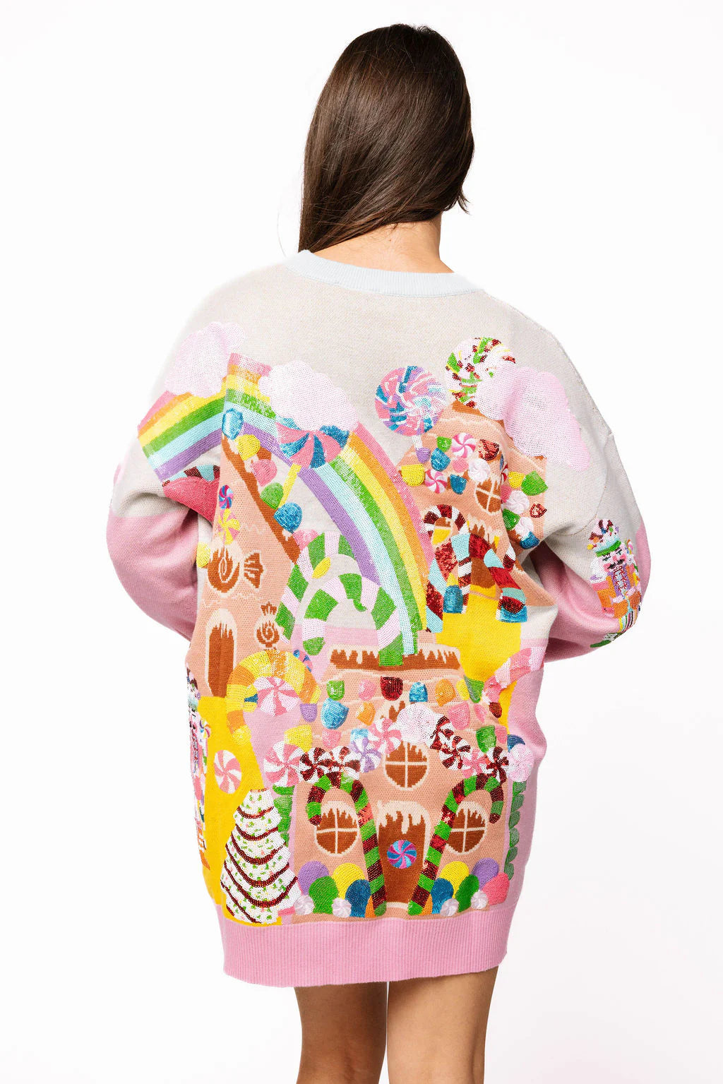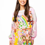 The Queen Of Sparkles Multi Christmas Candyland Knit Dress is a sweet holiday essential with a relaxed fit and mini length. Featuring a classic crewneck, long sleeves, and a whimsical Candyland-inspired graphic, this festive knit is perfect for everything from holiday parties to cozy seasonal gatherings.