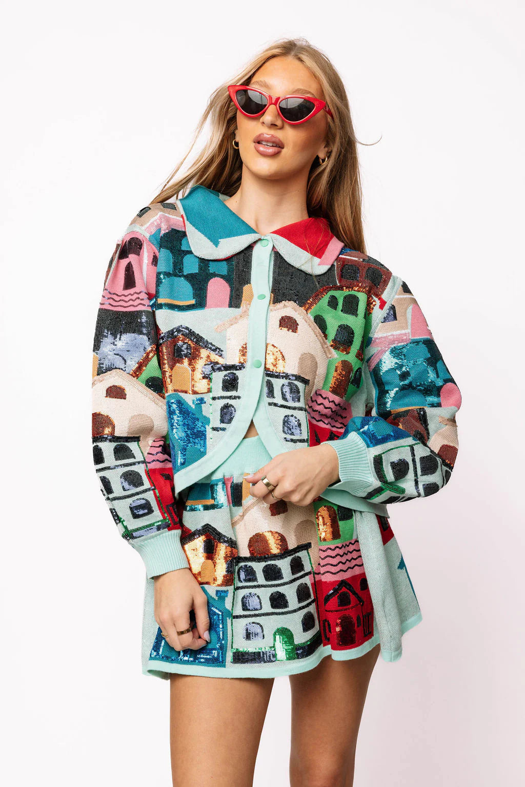 Bring playful sparkle to your fall wardrobe! This relaxed-fit sweater features a classic collared neckline, functional buttons, and colorful, glittery house graphics for a whimsical touch. Layer it over tees with your favorite bottoms, or pair with the matching skirt for a cozy, standout look.