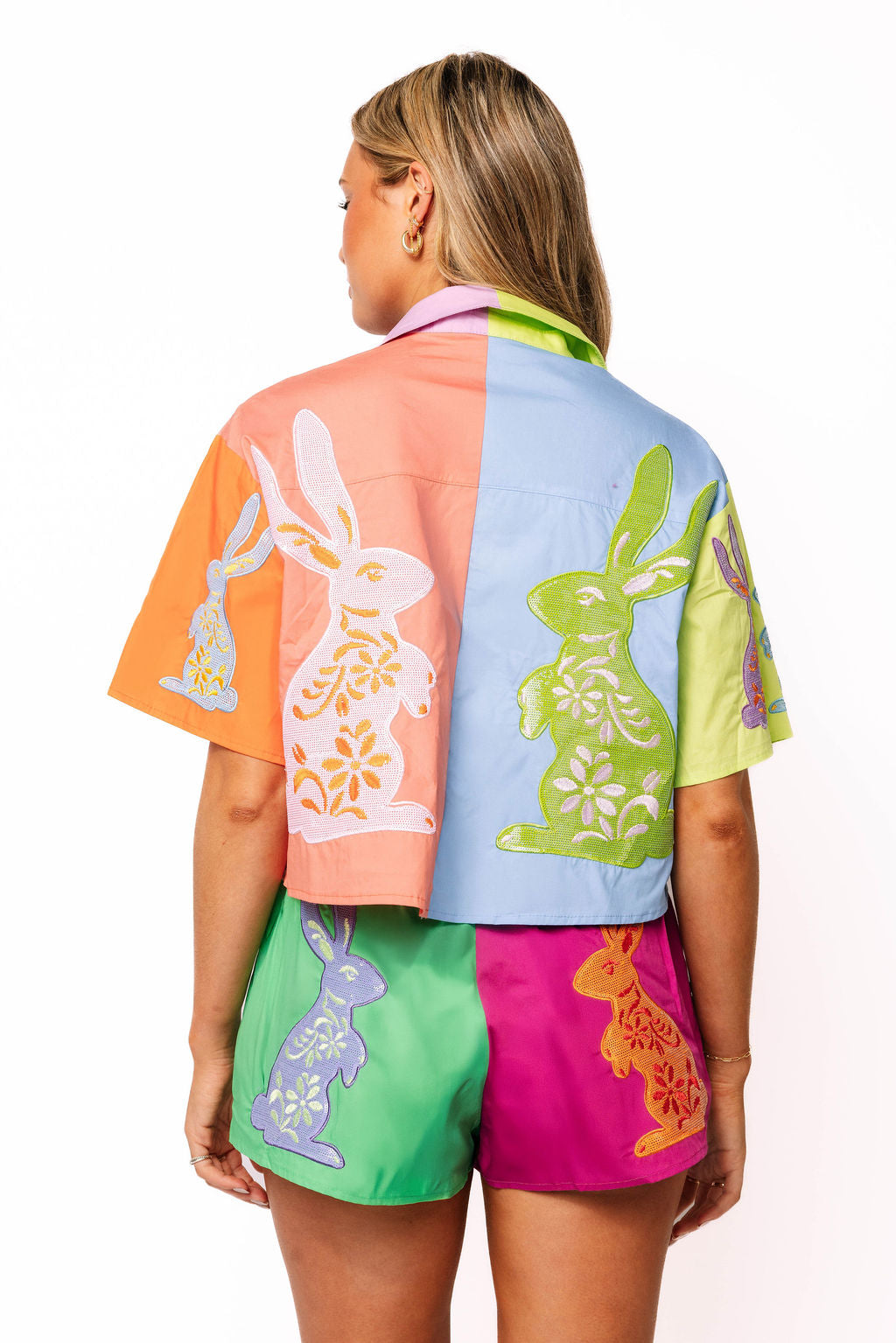 - Why We ❤ It: Easy, festive, and full of sparkle—these shorts are the perfect match to the colorblock Easter bunny top for an effortless QOS look.
