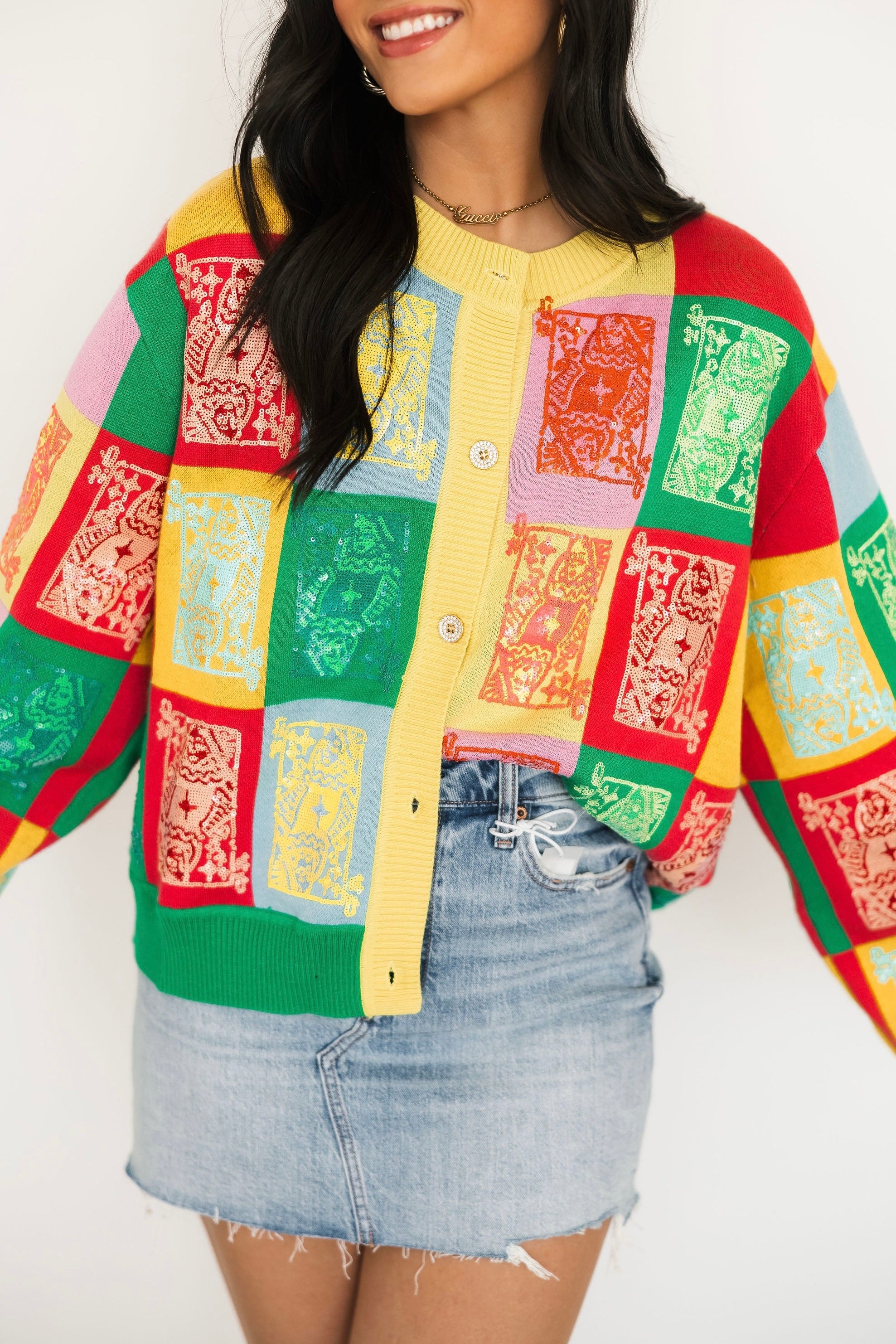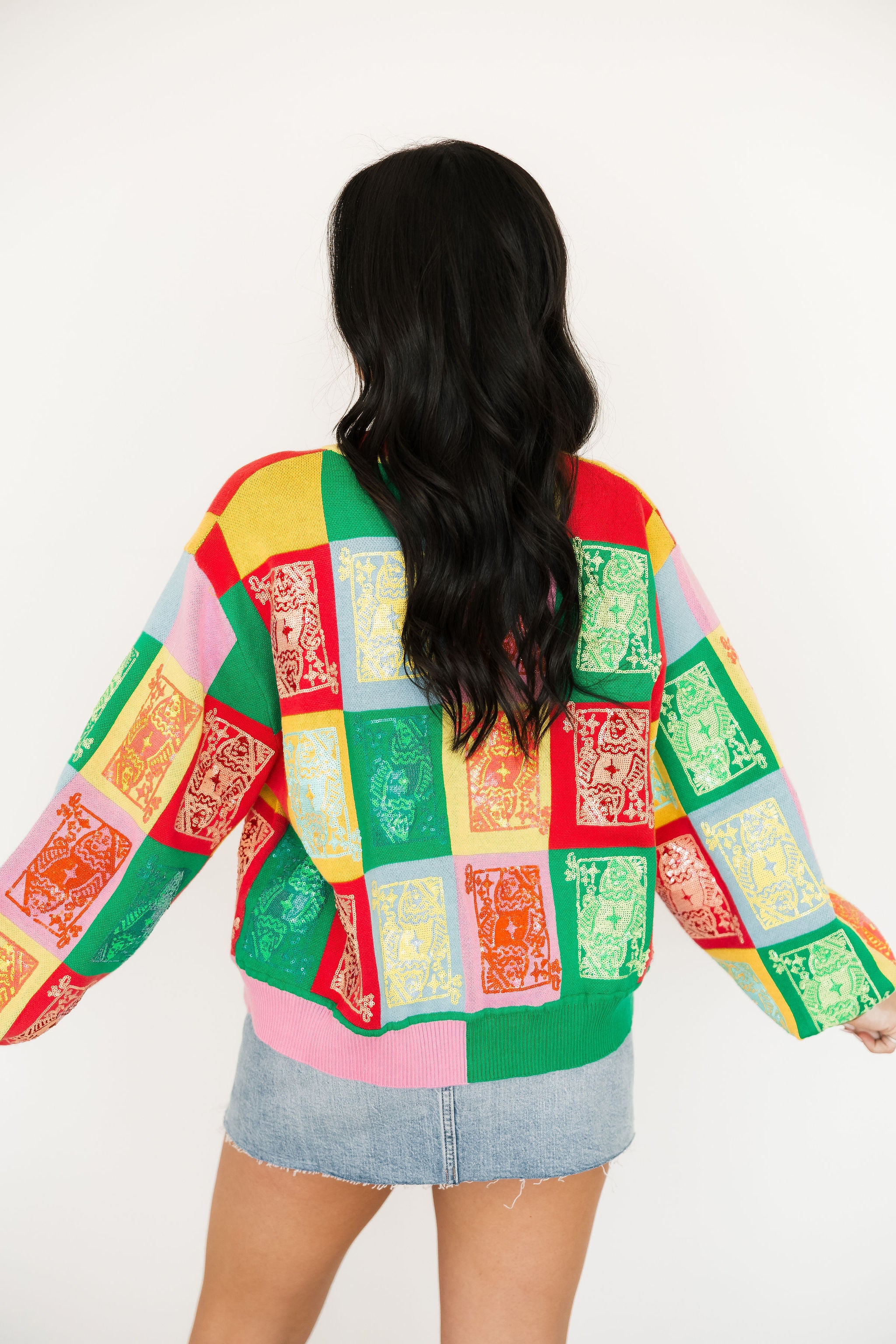 The Queen Of Sparkles Multi Colorblock Logo Button Up Cardigan features a relaxed fit with long sleeves, a classic crewneck, and a full front button closure. Perfect for layering over tees or tanks, it’s an easygoing piece that brings a playful, colorful touch to any outfit. Sage is wearing an XS.