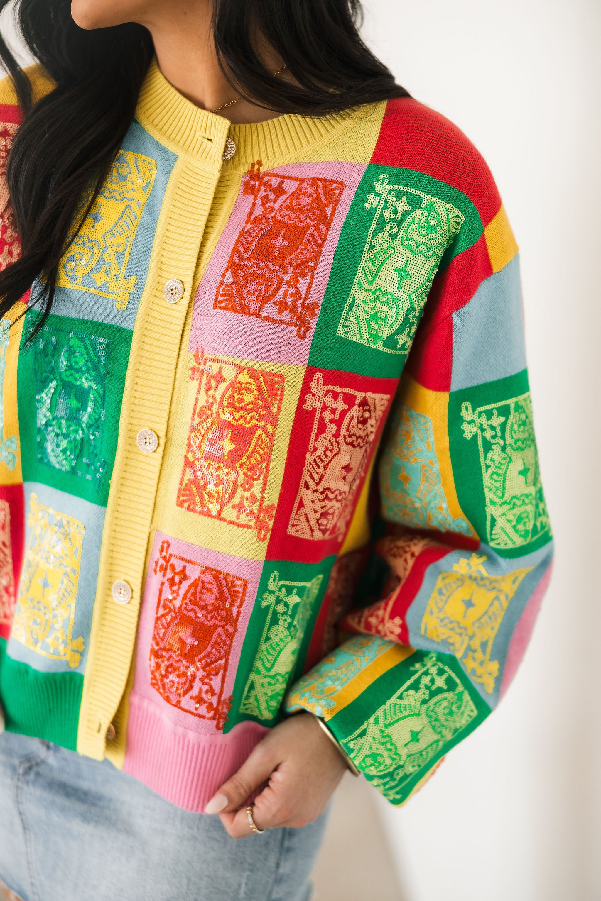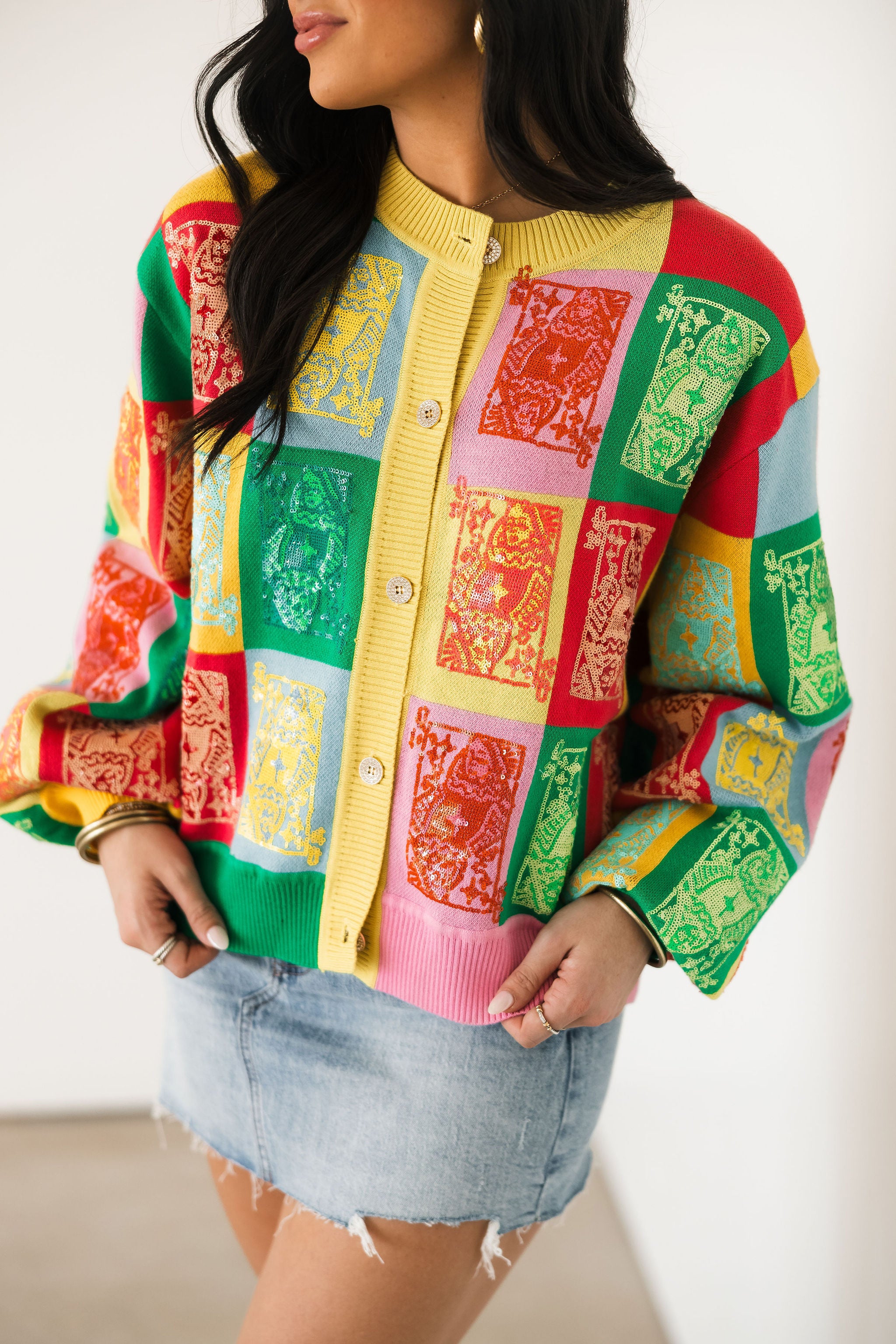 Multi Colorblock Logo Button Up Cardigan | Queen Of Sparkles