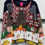 The Queen Of Sparkles Multi Sequin Rockefeller Center At Christmas Sweatshirt features a relaxed fit with a classic crewneck and long sleeves. Adorned with a sparkling graphic of Rockefeller Center at Christmas, complete with ice skaters, this cozy piece is perfect for festive outings, holiday gatherings, or adding a whimsical, sparkling touch to your seasonal style.