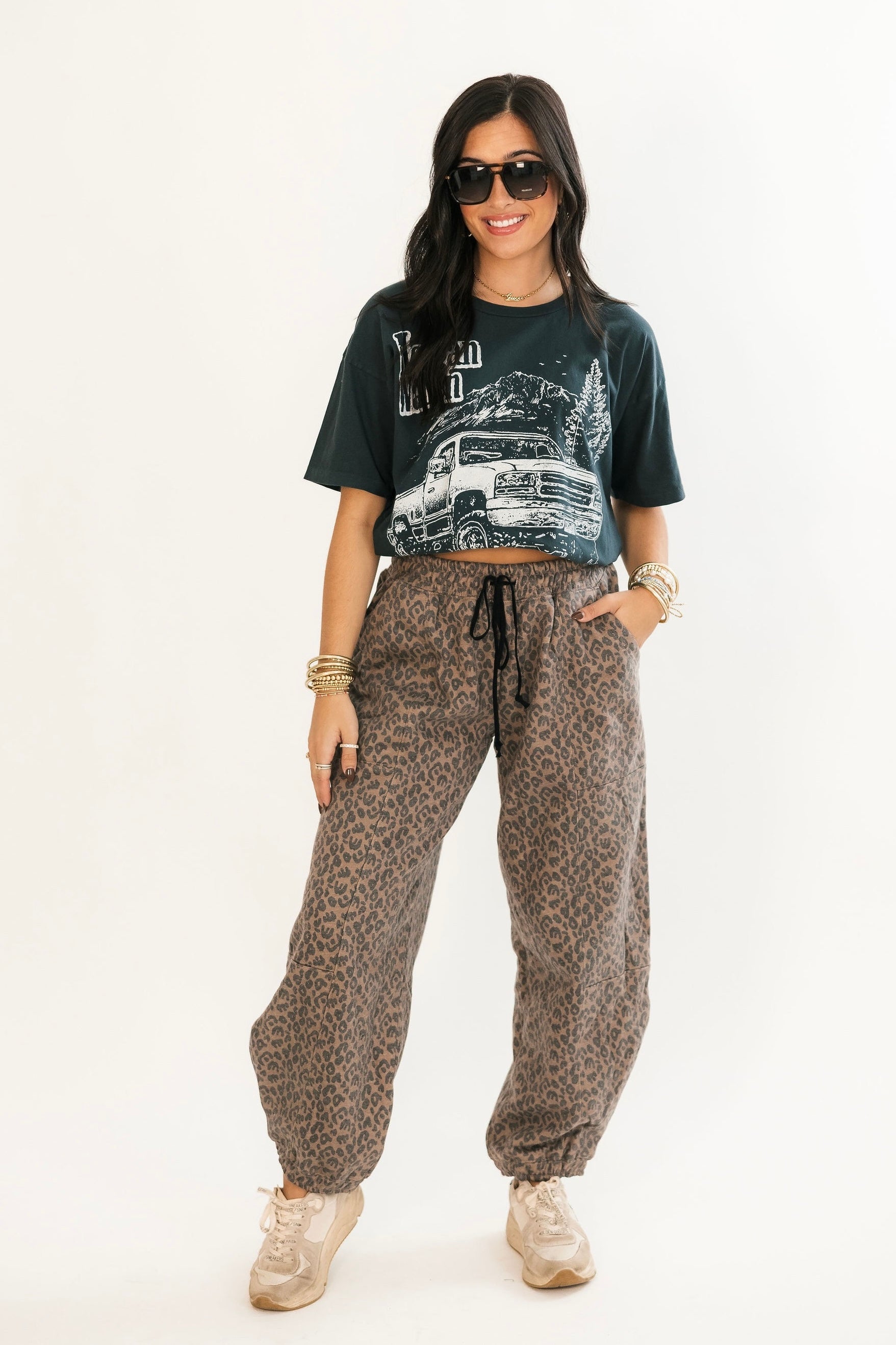 Do comfort your way in the My Way Leopard Sweats. Designed in a soft, relaxed fit with a bold leopard print, these midweight sweats are perfect for those in-between days. Whether you're heading out or staying in, they strike the ideal balance of cozy and cool. Elastic waistband, side pockets, and just enough slouch — because rules are optional, but style isn’t. Sage is wearing a small.