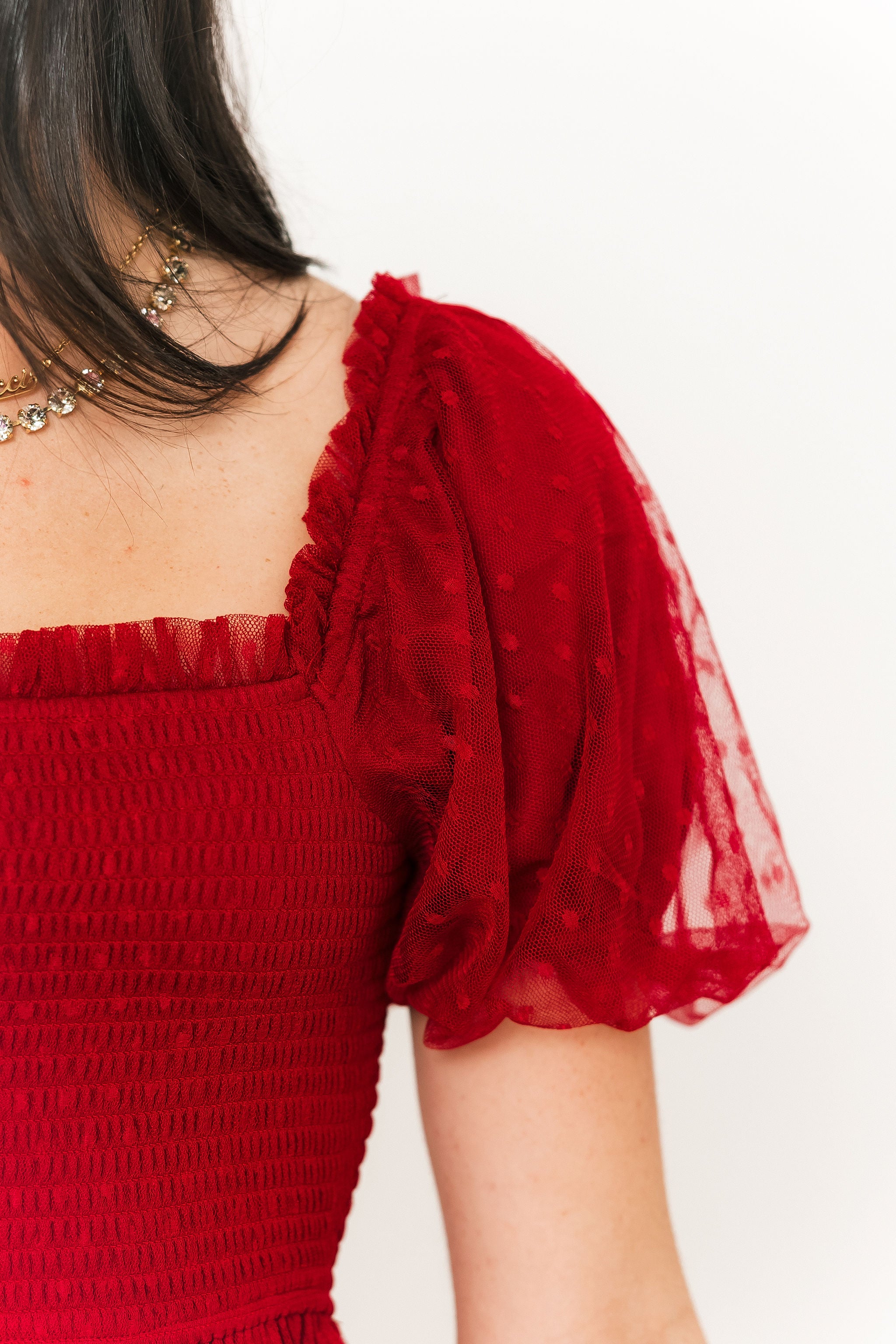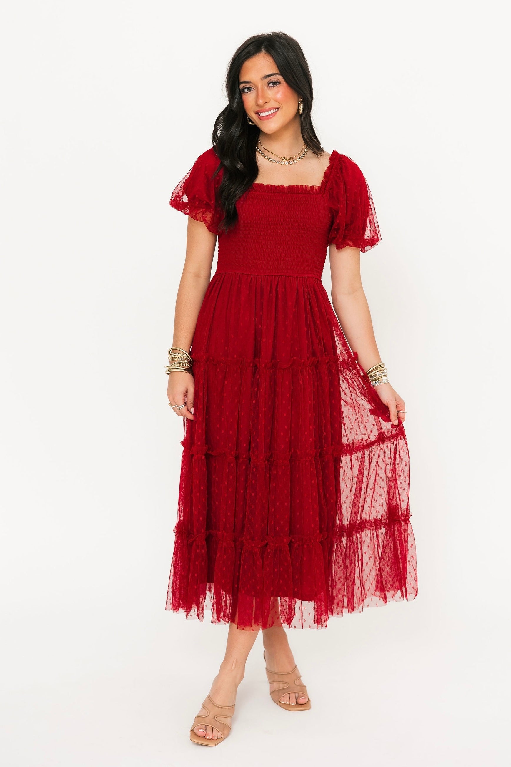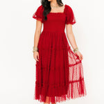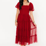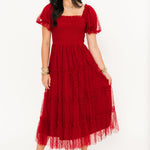 The Mylee Textured Midi Dress in Red is a timeless statement piece with a playful twist. Featuring soft puff sleeves, a smocked bodice, and tiered ruffle detailing, this A-line silhouette flatters from every angle. The subtle polka dot tulle overlay adds a touch of texture and charm, making it the perfect dress for celebrating the season in style. Sage is wearing a small.