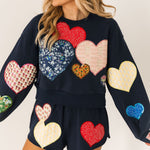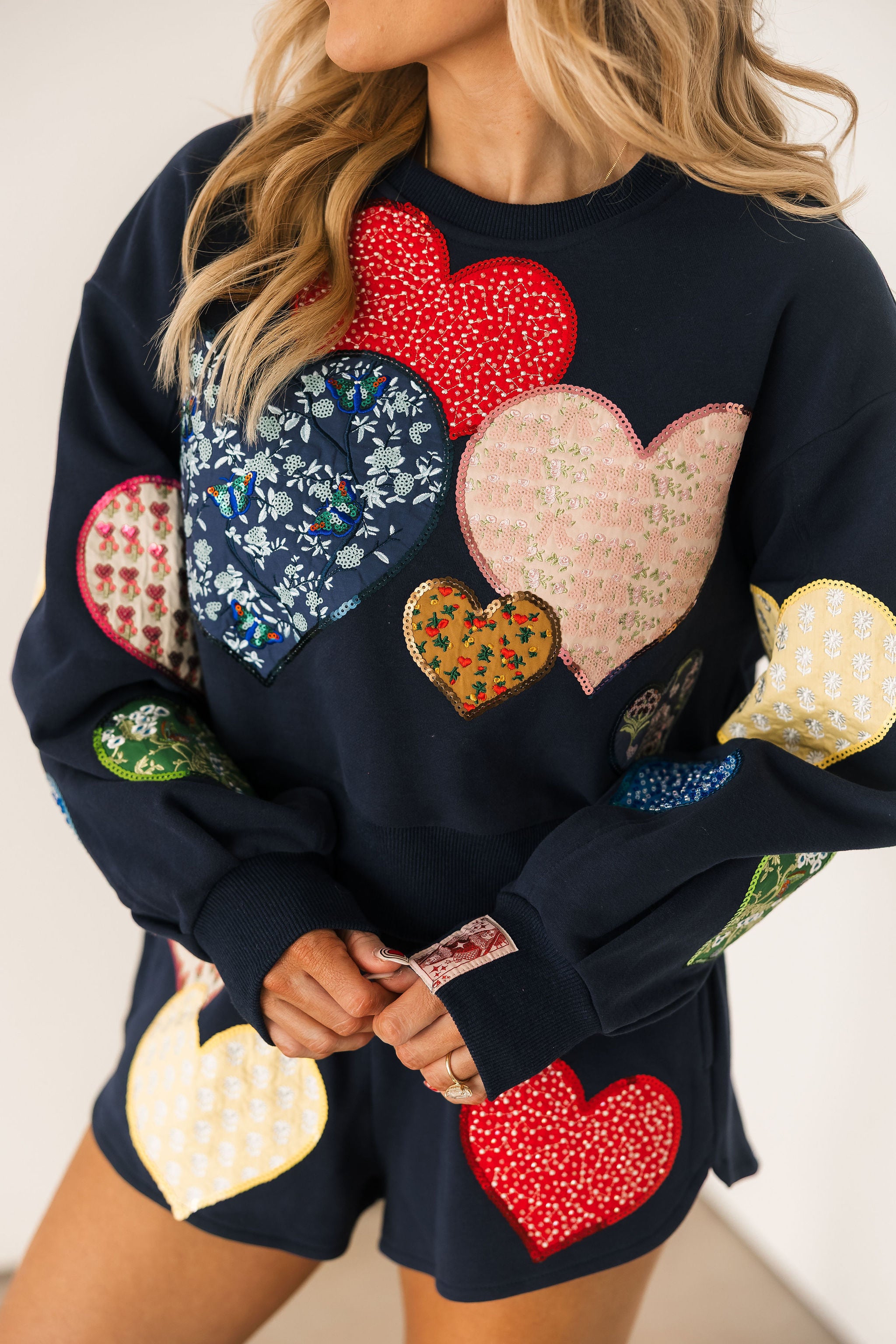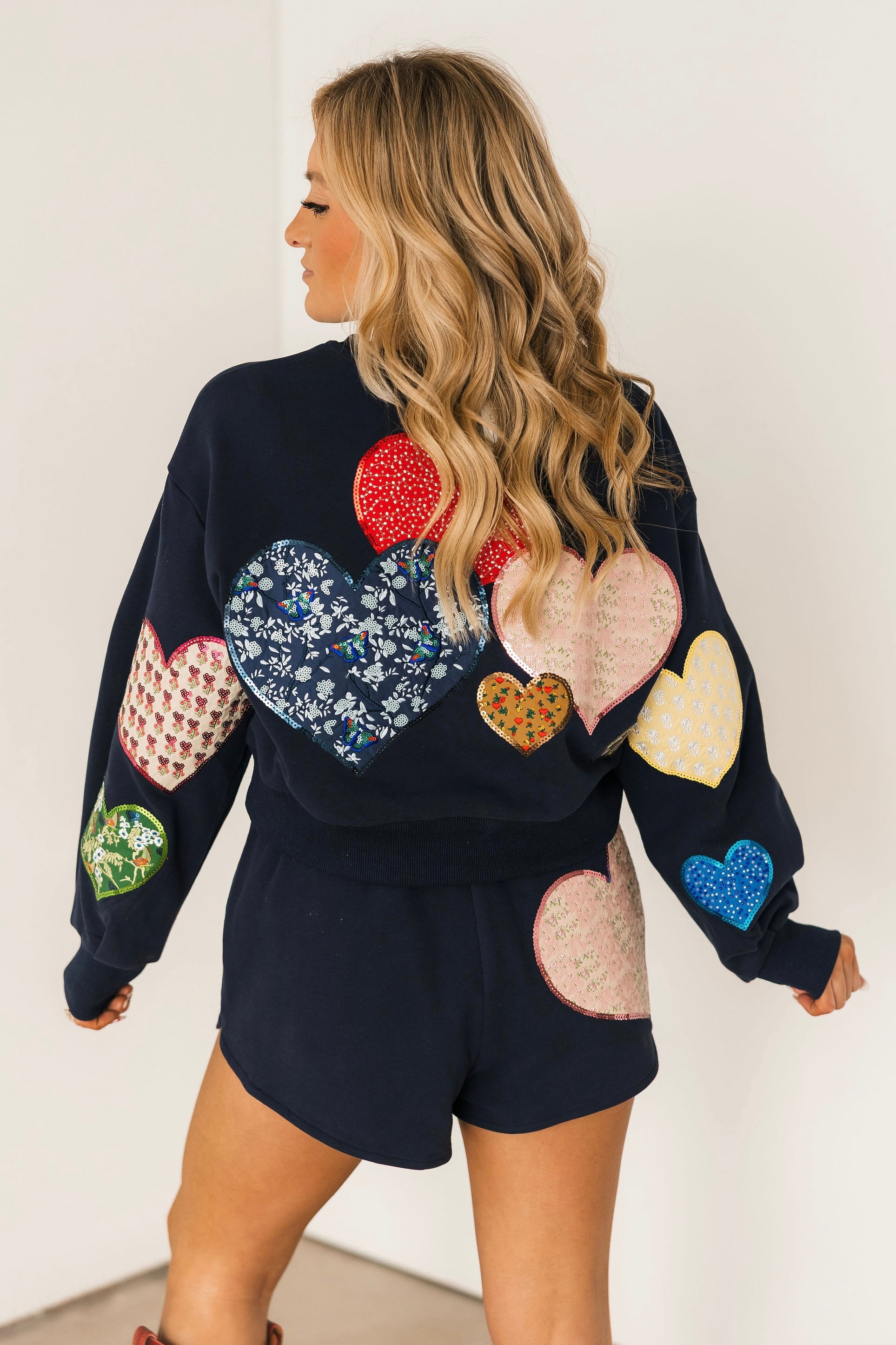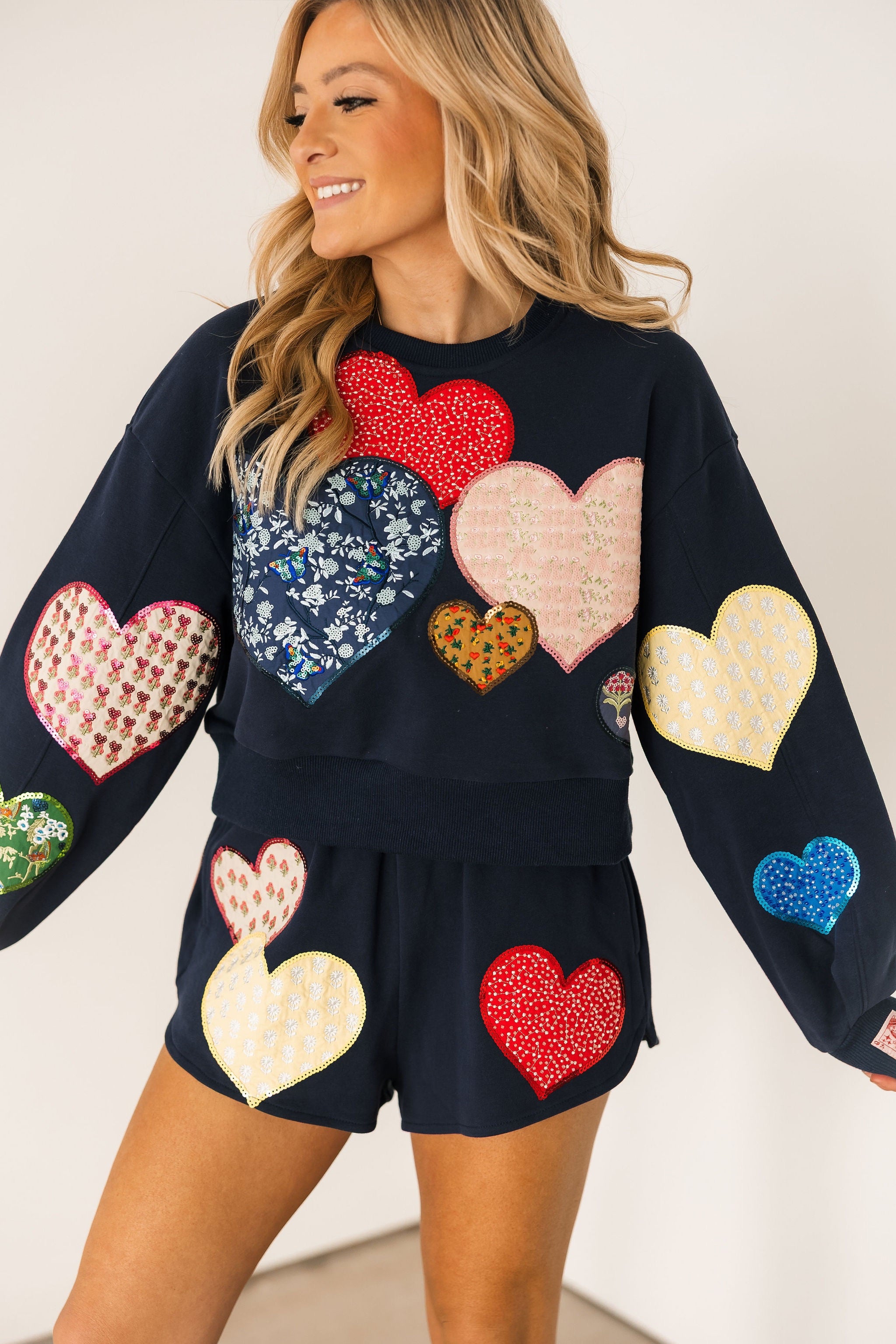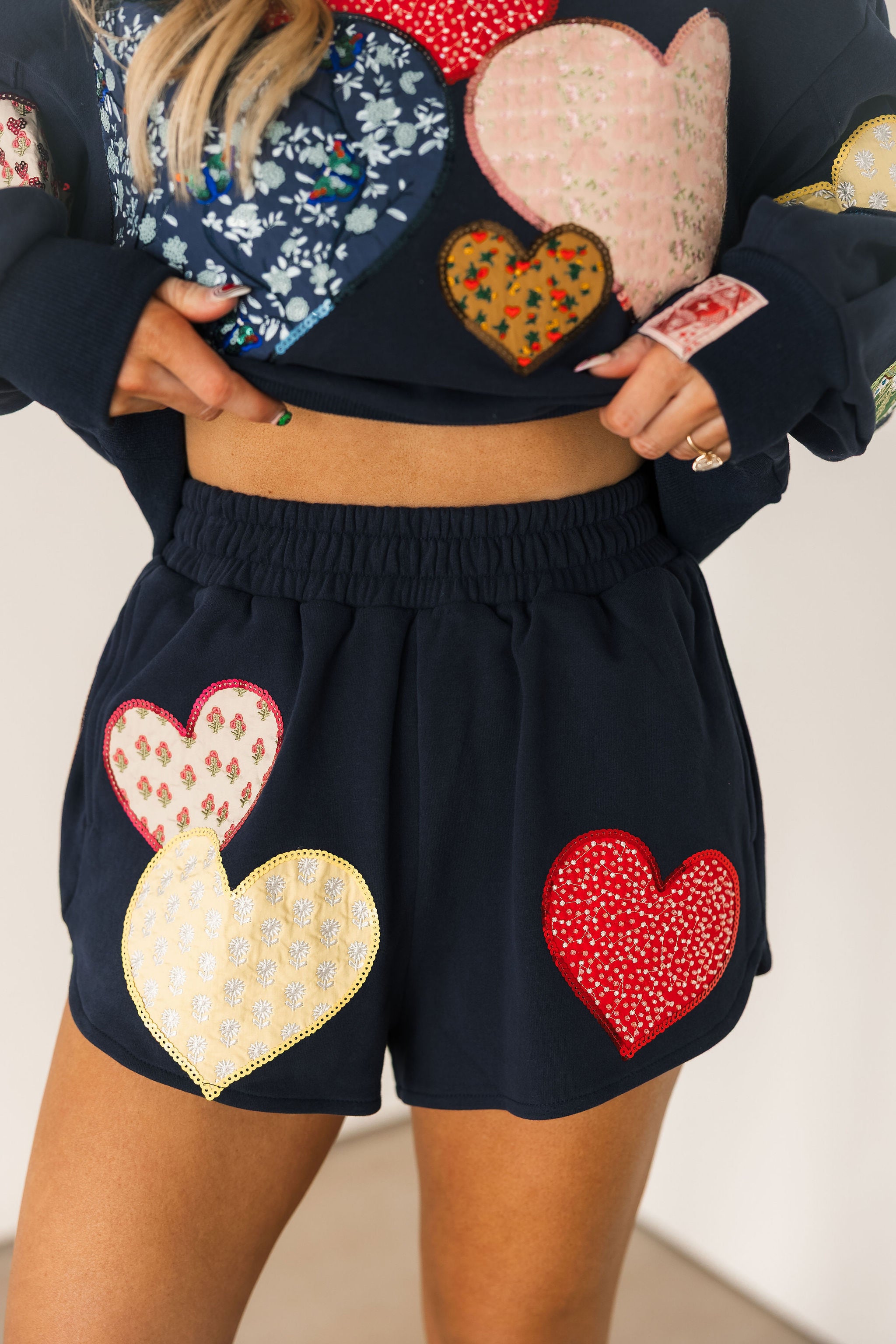 The Queen Of Sparkles Navy Multi Embroidered Hearts Short features a relaxed fit with a comfortable elastic waistband and mid-rise silhouette. Adorned with colorful heart embroidery, they’re perfect for lounging, casual outings, or pairing with matching Queen Of Sparkles tops for a coordinated, playful outfit. Lexi Jade is wearing an XS.