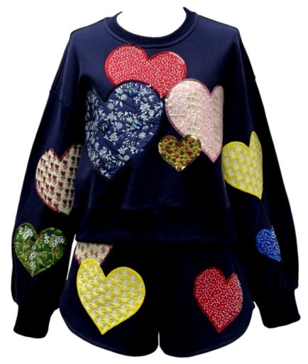 The Queen Of Sparkles Navy Multi Embroidered Hearts Sweatshirt features a relaxed, cozy fit with a classic crewneck and long sleeves. Pair it with the matching shorts or your favorite bottoms for an easy, coordinated look.