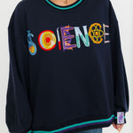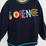 - Navy crewneck featuring “SCIENCE” spelled out across the chest, with each letter cleverly designed as a fun science icon — think beakers, atoms, droppers, and more
