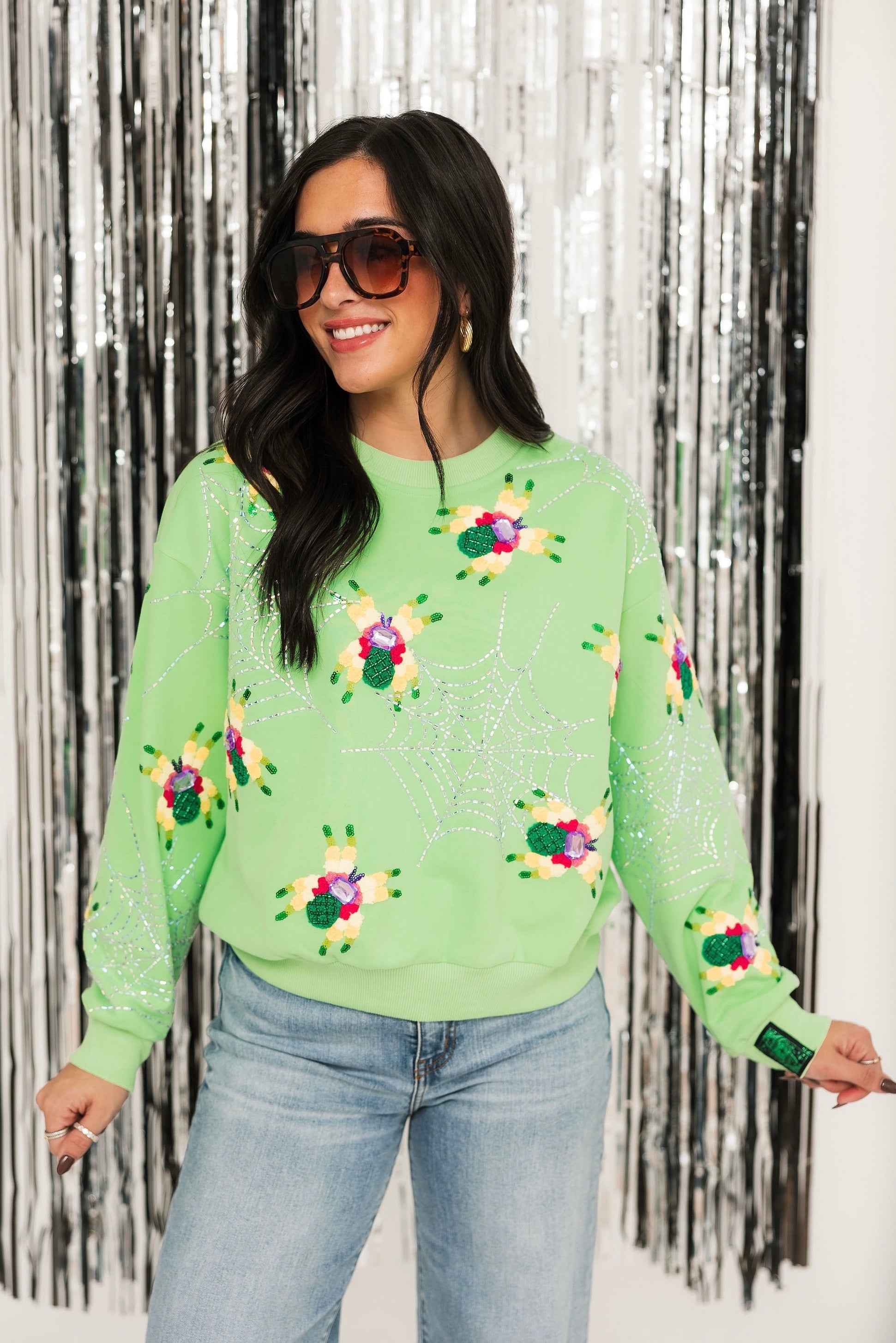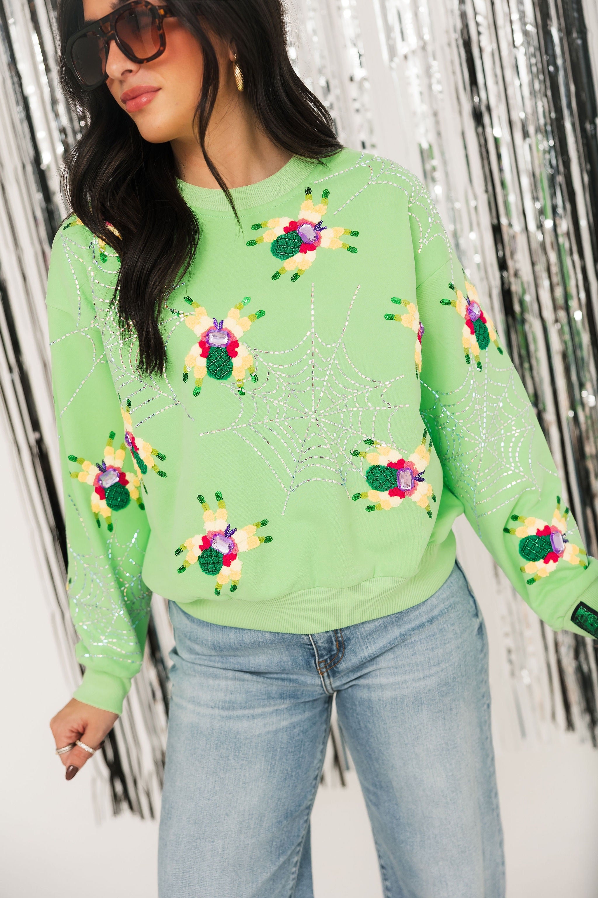 Creepy meets cute in this bold neon green sweatshirt featuring sparkly spider and web graphics. With its relaxed fit and vibrant pop of color, it’s the perfect playful piece for Halloween season — with just the right amount of eek! and sparkle. Sage is wearing an XS.