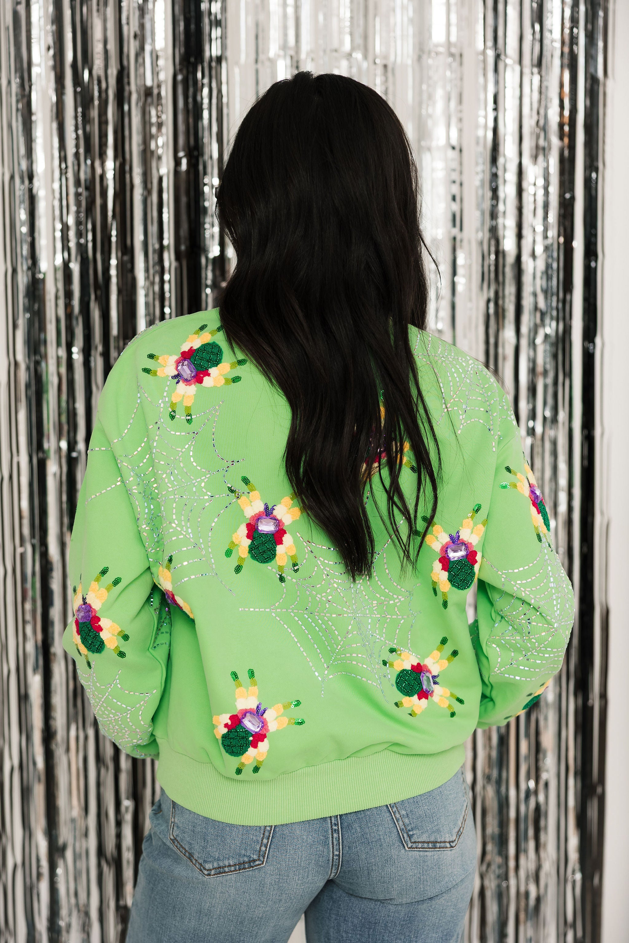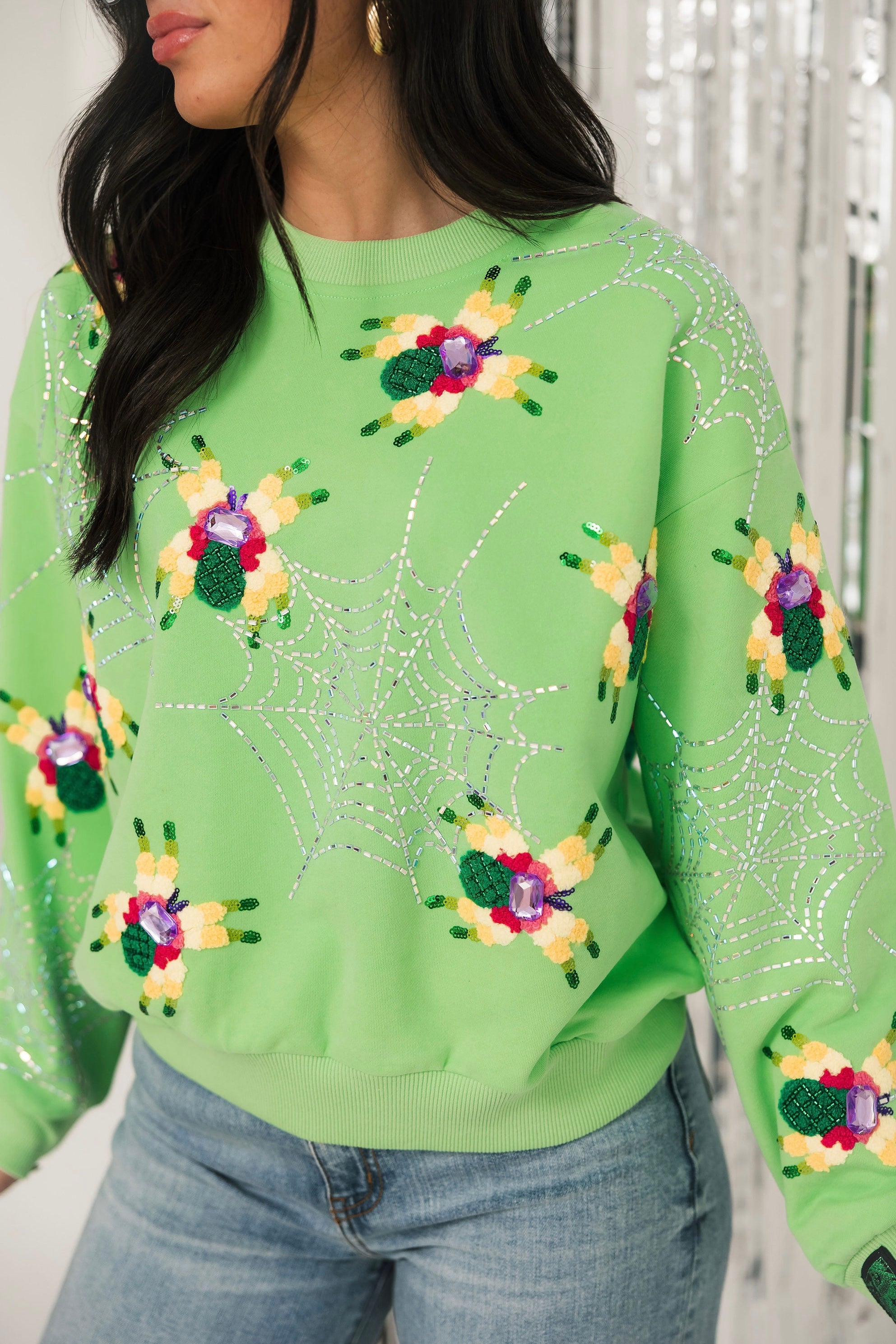 Queen Of Sparkles Neon Green Fuzzy Spider & Web Sweatshirt