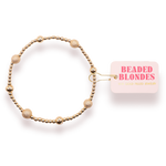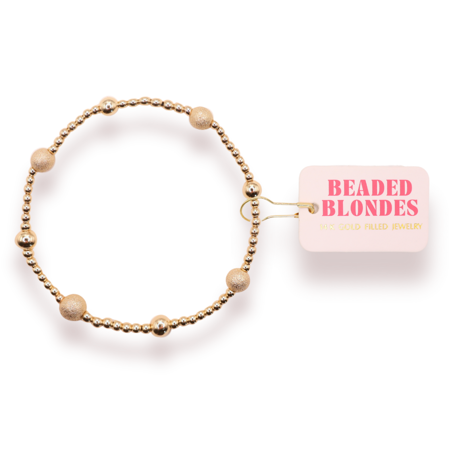 The Beaded Blondes Noelle Stardust Gold bracelet is a sparkling, versatile accessory featuring gold-toned beads with a hint of shimmer. Lightweight and chic, it’s perfect for adding a touch of glamour to any look.