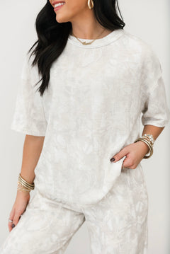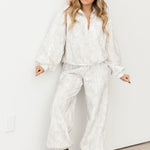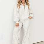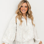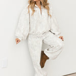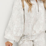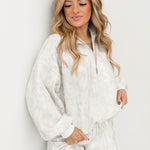 This relaxed-fit pullover features a quarter-zip neckline, long sleeves, and a soft white camo print. Comfortable and versatile, it’s perfect for layering or wearing on its own for casual, off-duty style. Lexi is wearing a small.
