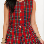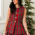 The Officially Christmas Plaid Vest in Red blends timeless style with modern structure. Featuring gold button detailing and a clean round neckline, this sleeveless piece is easy to layer over blouses or dresses. Its relaxed yet tailored fit brings a classic plaid moment that feels effortlessly chic for the holiday season. Sage is wearing a small.