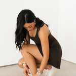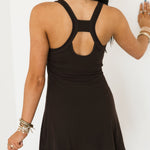 The On The Move Dress features a fitted, ultra-soft feel with a clever 2-in-1 romper design for effortless wear. Crafted from a buttery smooth fabric, it includes removable bra pads for customizable support and a subtle back keyhole detail for an elevated finish. Designed in a flattering mini length, this style is equal parts functional and flattering—perfect for staying comfortable without sacrificing style. Sage is wearing a small.