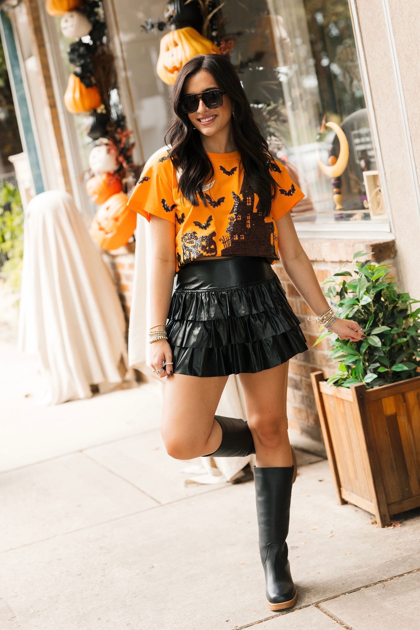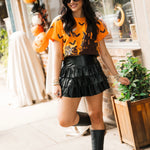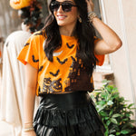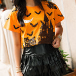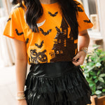 Bring a little sparkle to your spooky season! This relaxed-fit tee features a bold orange base with a glittery black Halloween house, surrounded by bats and pumpkins for that perfect seasonal vibe. Easy to wear with jeans, skirts, or layered under a cozy cardigan, it’s a must-have for all your fall adventures. Sage is wearing an XS.
