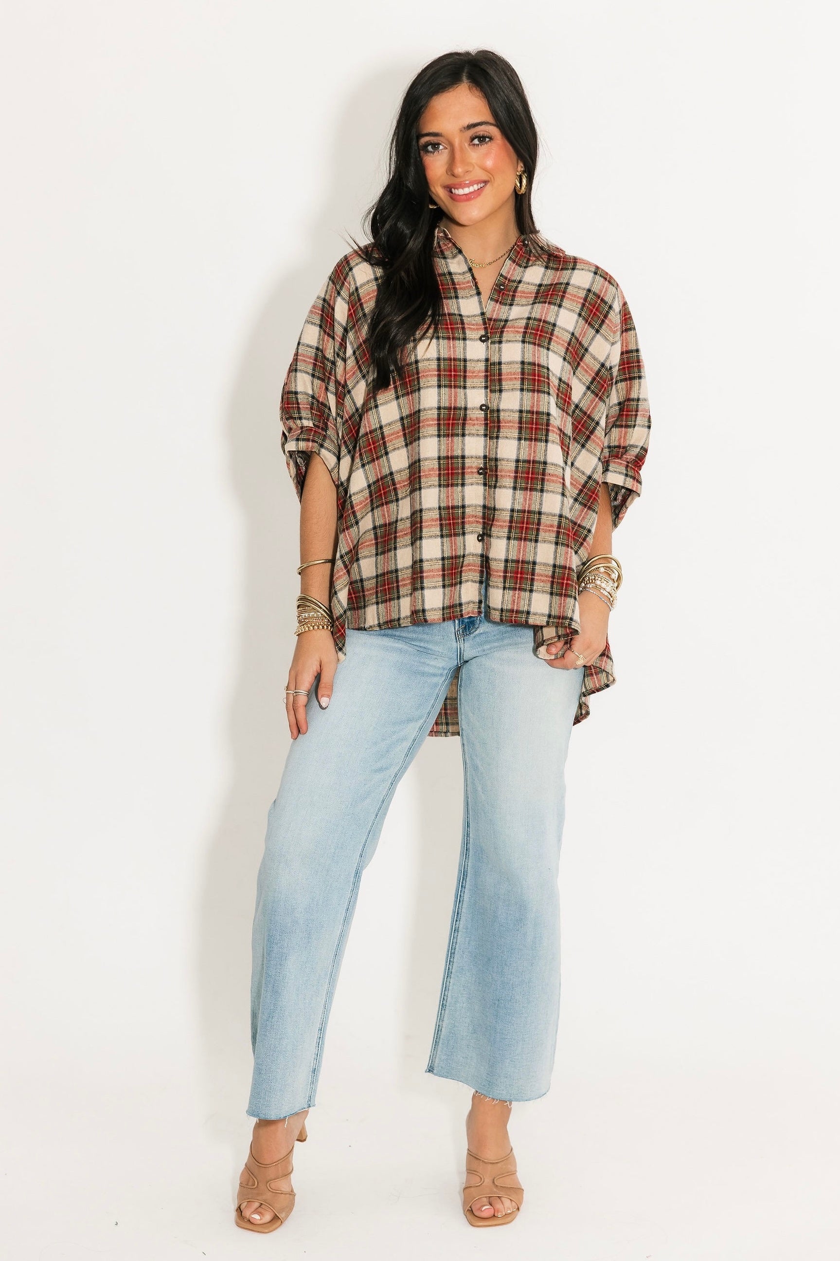 The Oversized Button Up Shirt in Plaid brings relaxed, easygoing style to your wardrobe. With a roomy fit, short sleeves, classic collar, and button-up front, it’s ideal for layering over tees or tying at the waist for a playful look. Soft, breathable, and versatile, this plaid-print shirt is a go-to for weekends, casual outings, or everyday comfort with a touch of style. Sage is wearing a small.