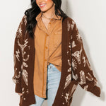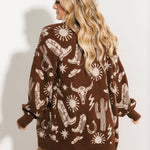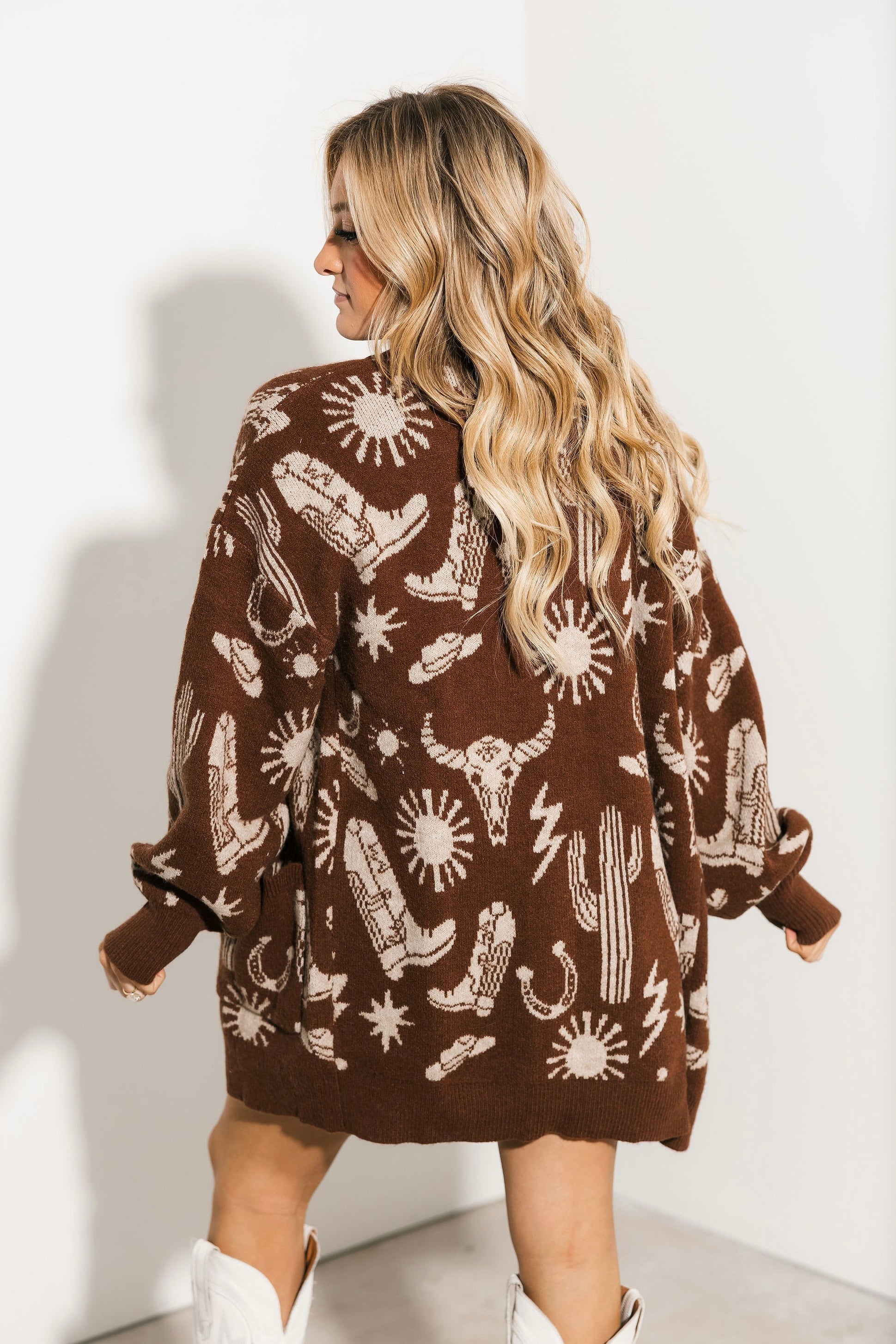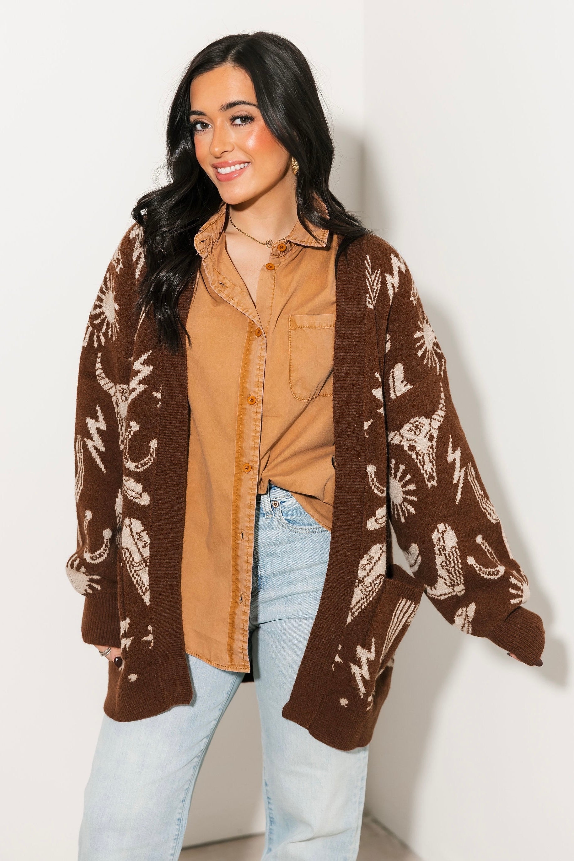 This oversized knit cardigan features long sleeves, a soft cozy knit, and bold Western-inspired graphics. Its relaxed silhouette makes it perfect for layering over casual outfits, adding warmth, texture, and a touch of Western flair to your wardrobe. Lexi is wearing a small.