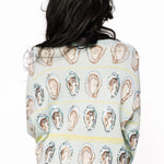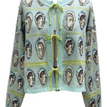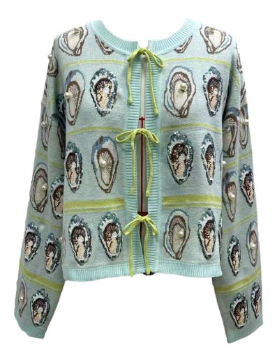 This pale blue and green sweater features a classic crewneck and long sleeves, finished with a front tie closure for a customizable fit. Perfect for adding a touch of seaside glamour to your everyday look.