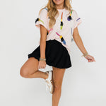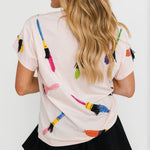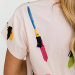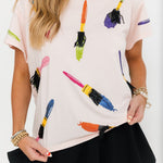 Brighten your day with this soft pale pink tee covered in playful paint brush graphics, each dipped in vibrant paint colors. Perfect for artists, creatives, or anyone who loves to add a splash of fun and sparkle to their everyday style. Lexi is wearing an XS.