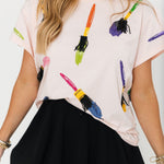 - Light pink tee adorned with playful paint brush graphics dipped in various vibrant paint colors