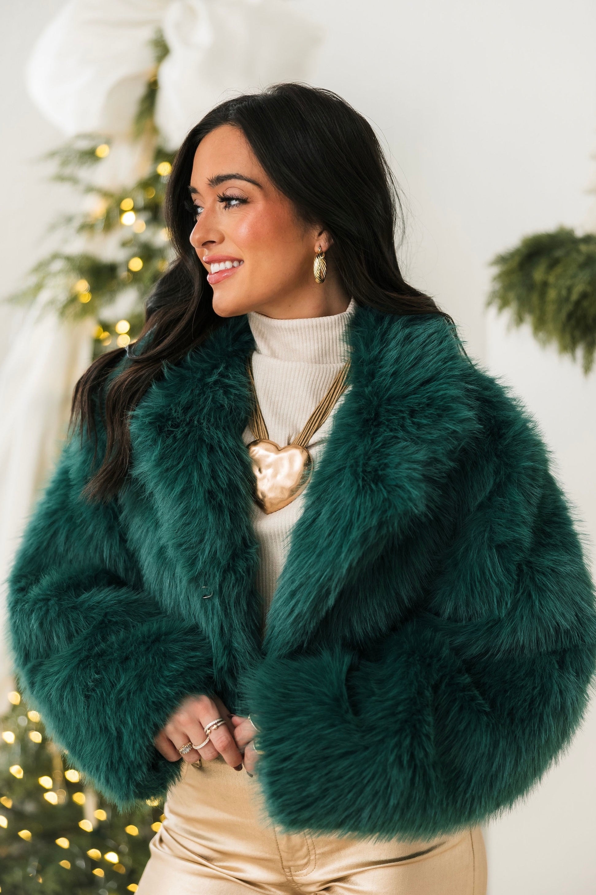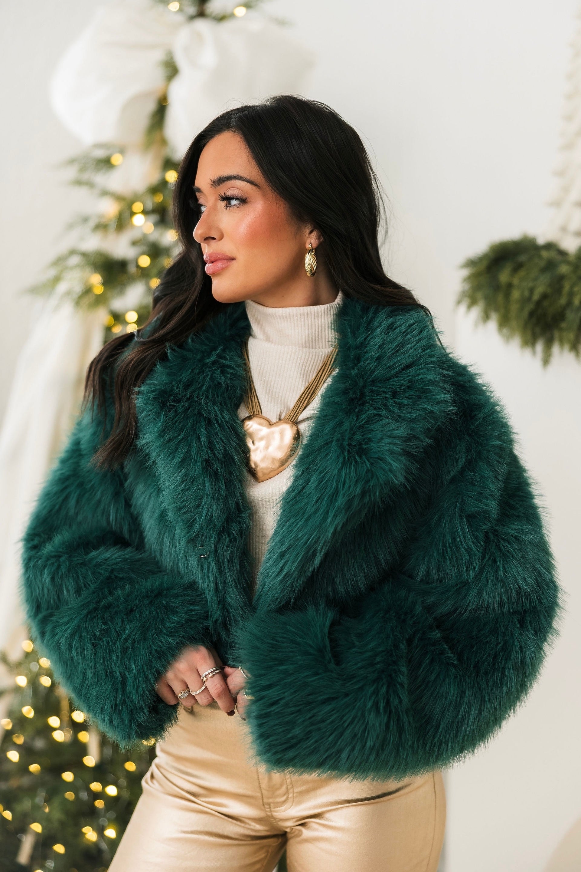 Cool and cropped, this cozy jacket features a soft faux fur fabrication and relaxed fit with exaggerated collar detailing and single button closure. is wearing an xs.