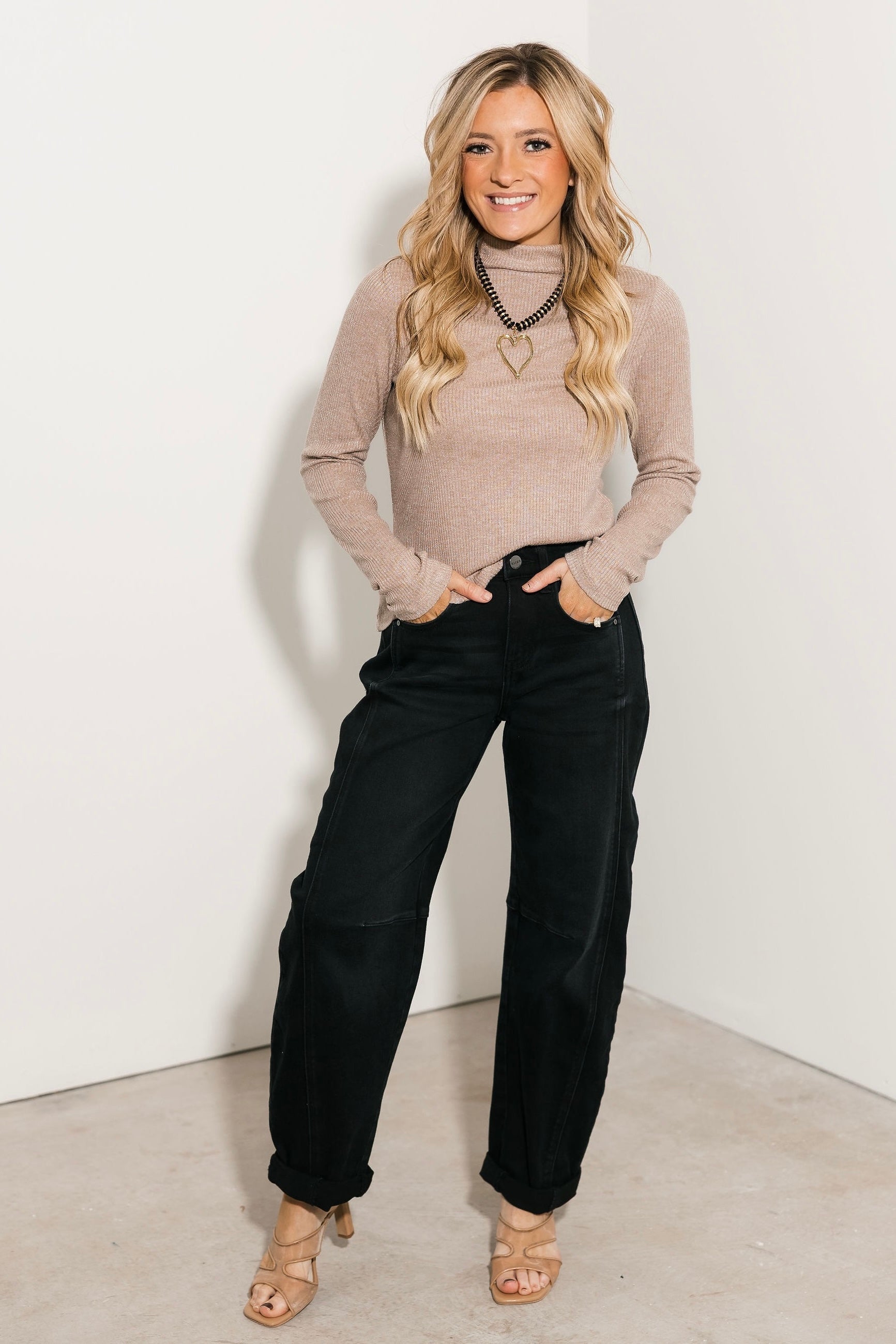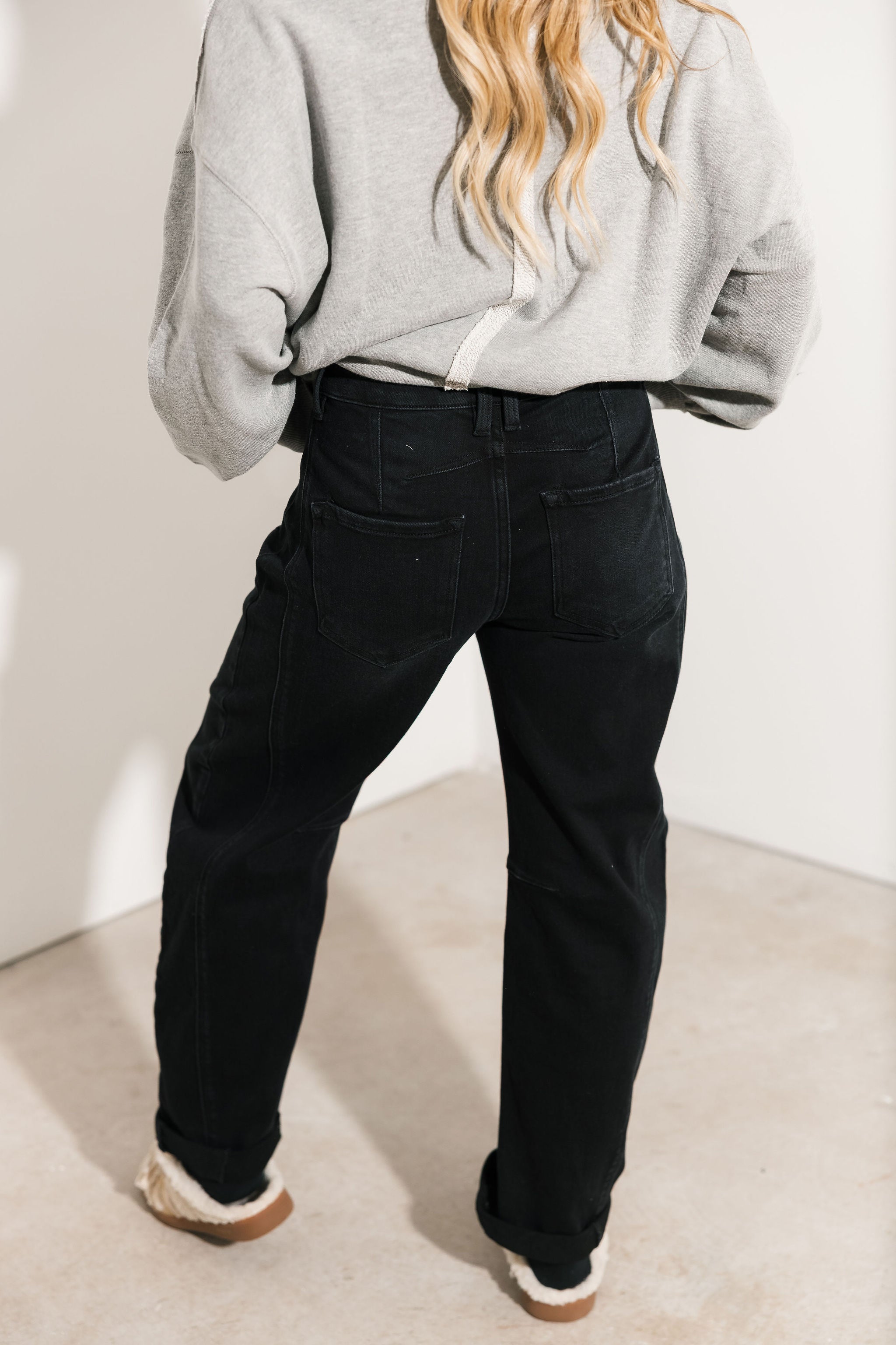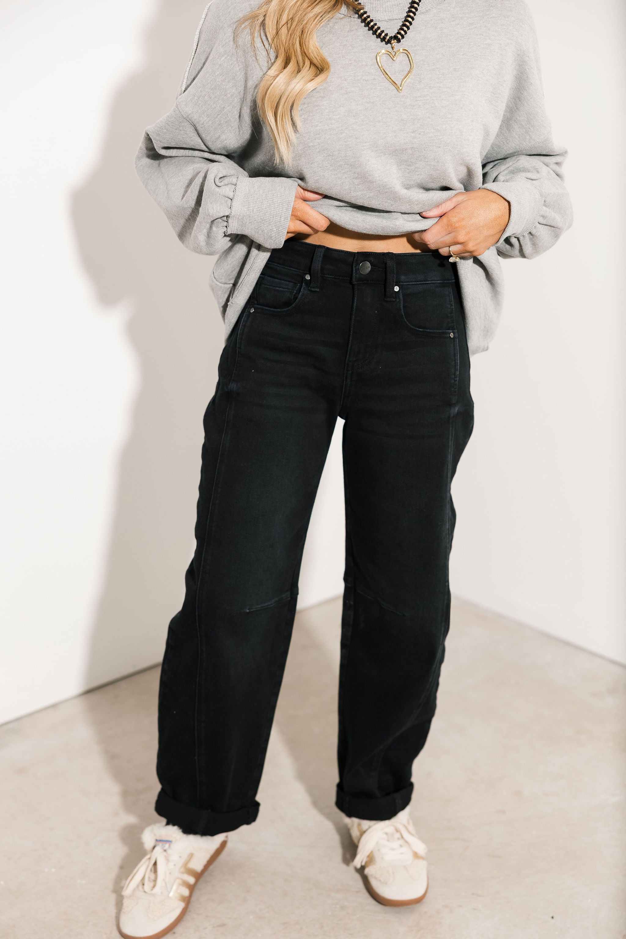 The Risen Phoebe Barrel Jeans feature a modern barrel-leg fit with a comfy, stretchy fabric you’ll love. Finished with rolled hems for a laid-back look, these black jeans offer the perfect balance of structure and comfort. A versatile denim option that elevates everyday outfits with ease.