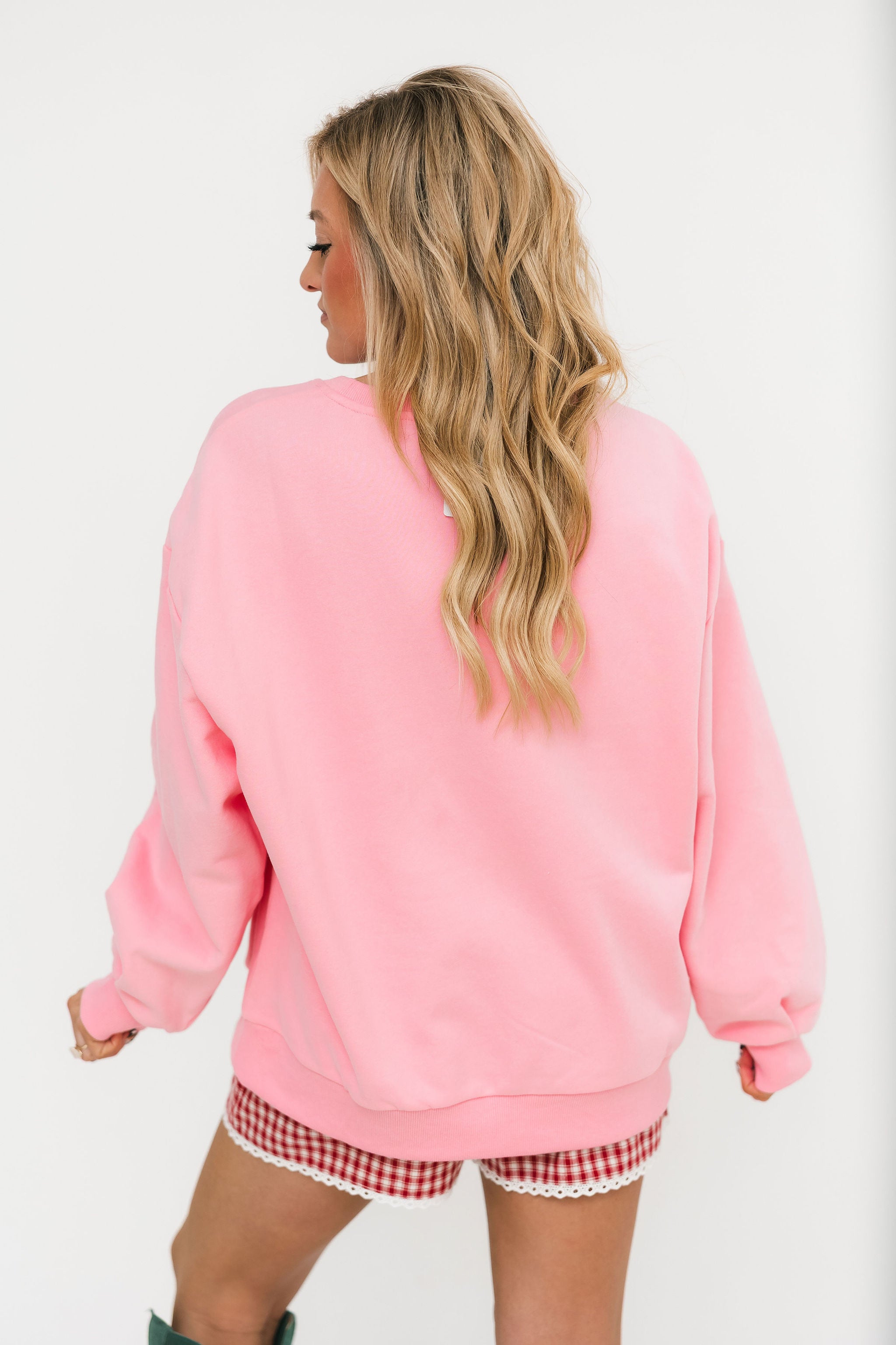 The Queen Of Sparkles Pink Candyland Logo Sweatshirt is a playful holiday essential with a relaxed fit and classic crewneck design. Featuring long sleeves and the Candyland QOS card logo, it’s perfect for layering or pairing with your favorite festive pieces for a fun, holiday-ready outfit. Lexi Jade is wearing an XS.