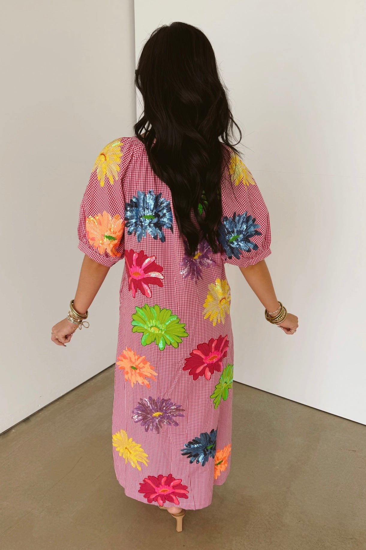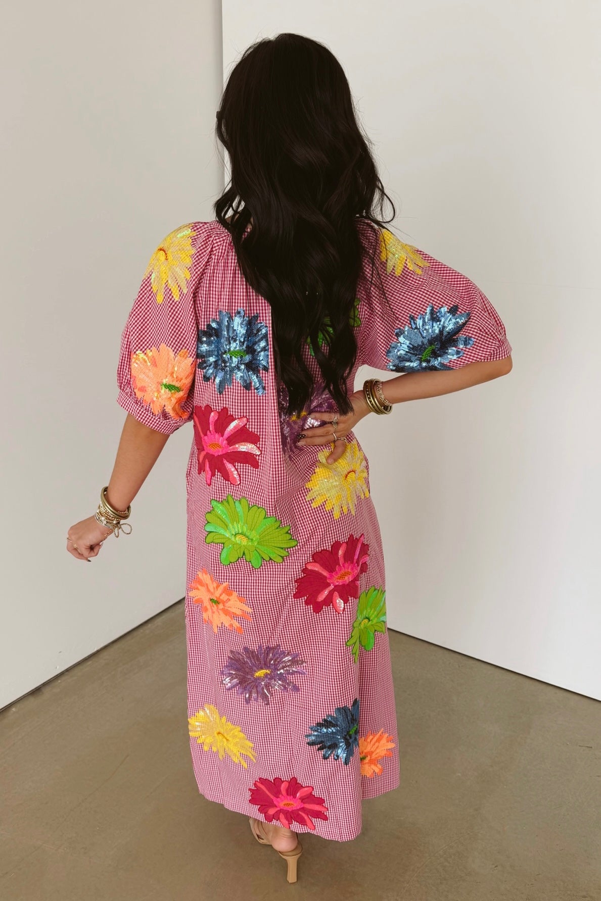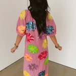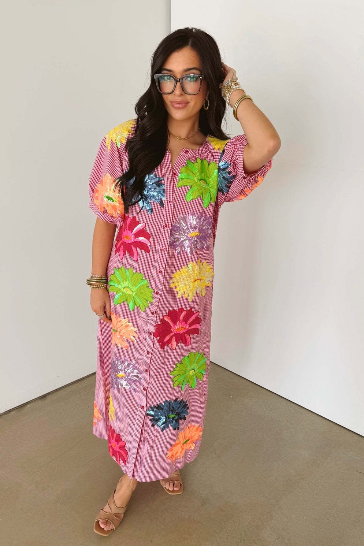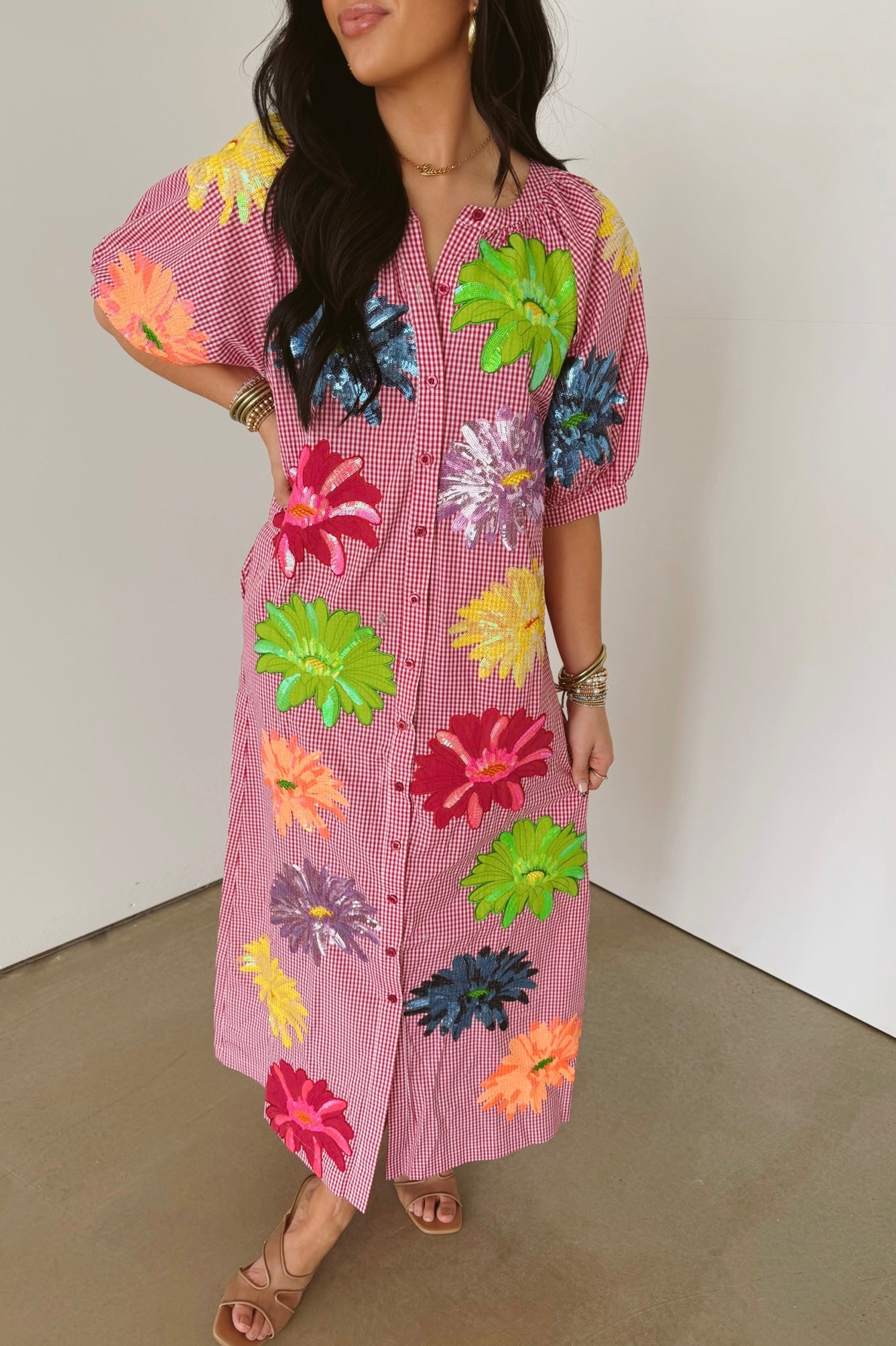 The Queen Of Sparkles Pink Gingham Multi Flower Button Up Cotton Midi Dress features a flowy silhouette with short puff sleeves, a classic crewneck, and a full front button closure. Midi length adds a touch of ease, making it perfect for layering or wearing on its own for a breezy, feminine look. Sage is wearing an XS.
