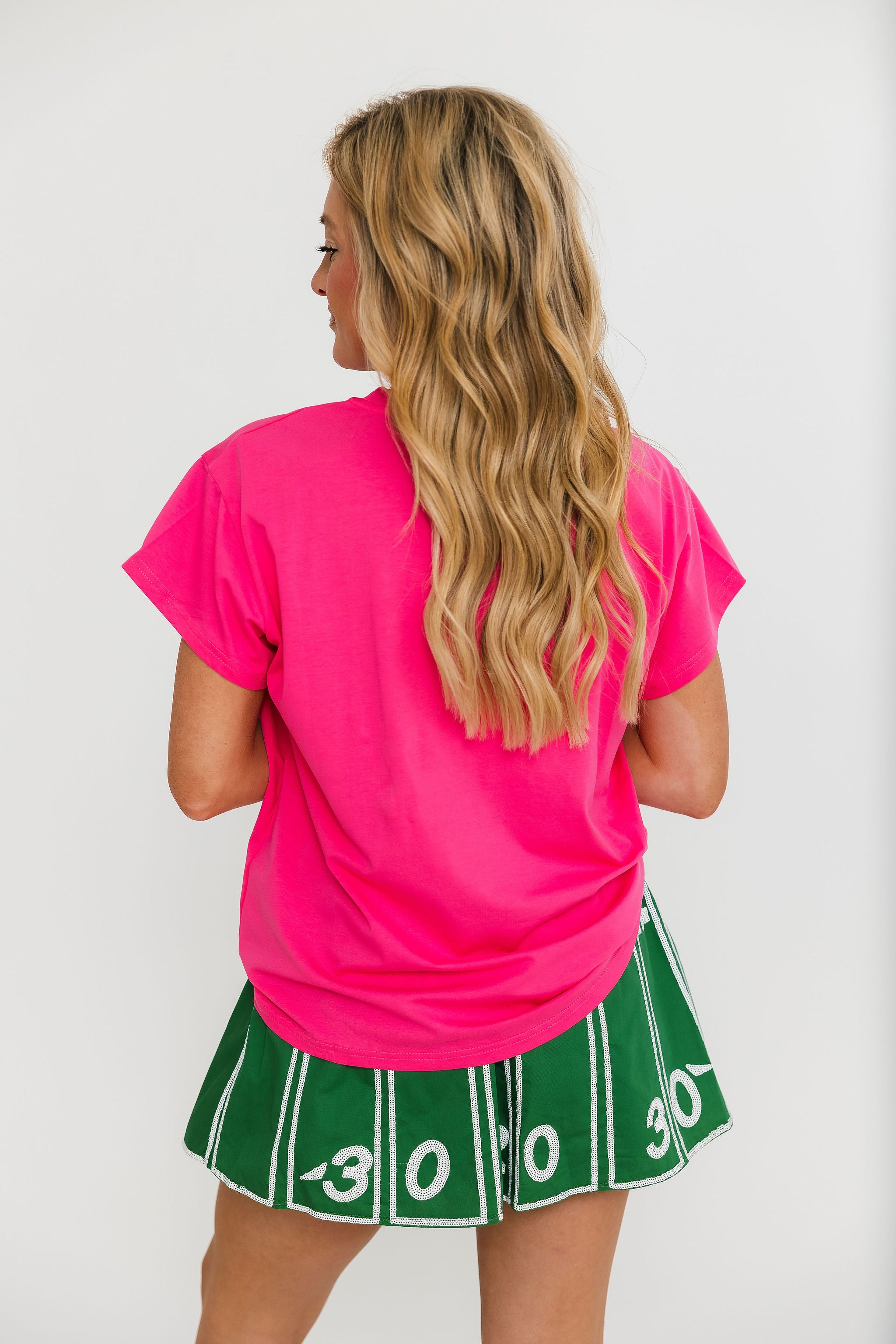 Make a bold game day statement in this hot pink tee featuring a glam sequin football front and center! With a relaxed fit and eye-catching sparkle, it’s perfect for the fan who brings fashion to the field. Cute, comfy, and totally touchdown-worthy! ✨ Lexi is wearing an XS.