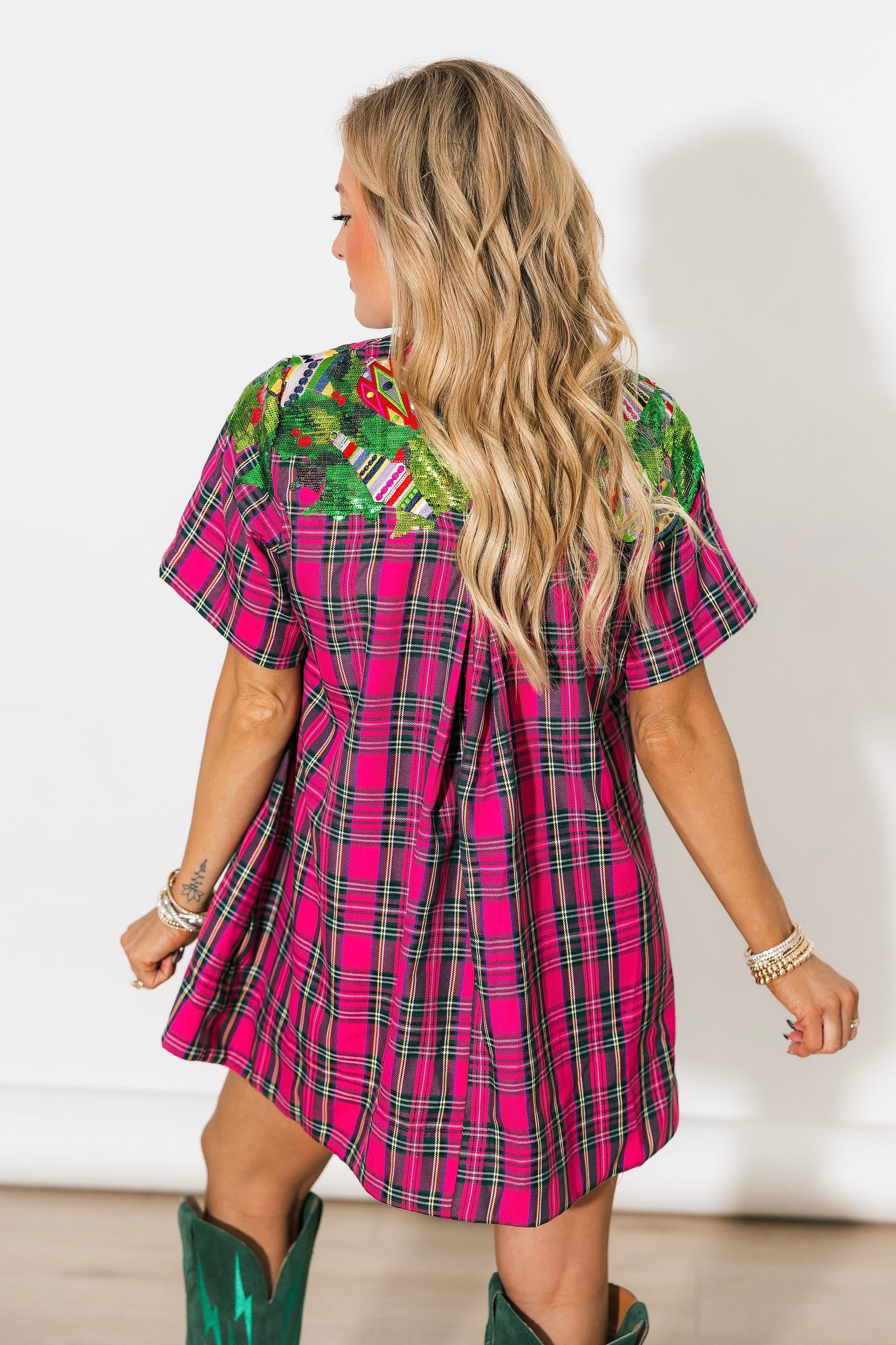 Queen Of Sparkles Pink Plaid Metallic Wreath Short Sleeve Cotton Dress