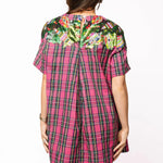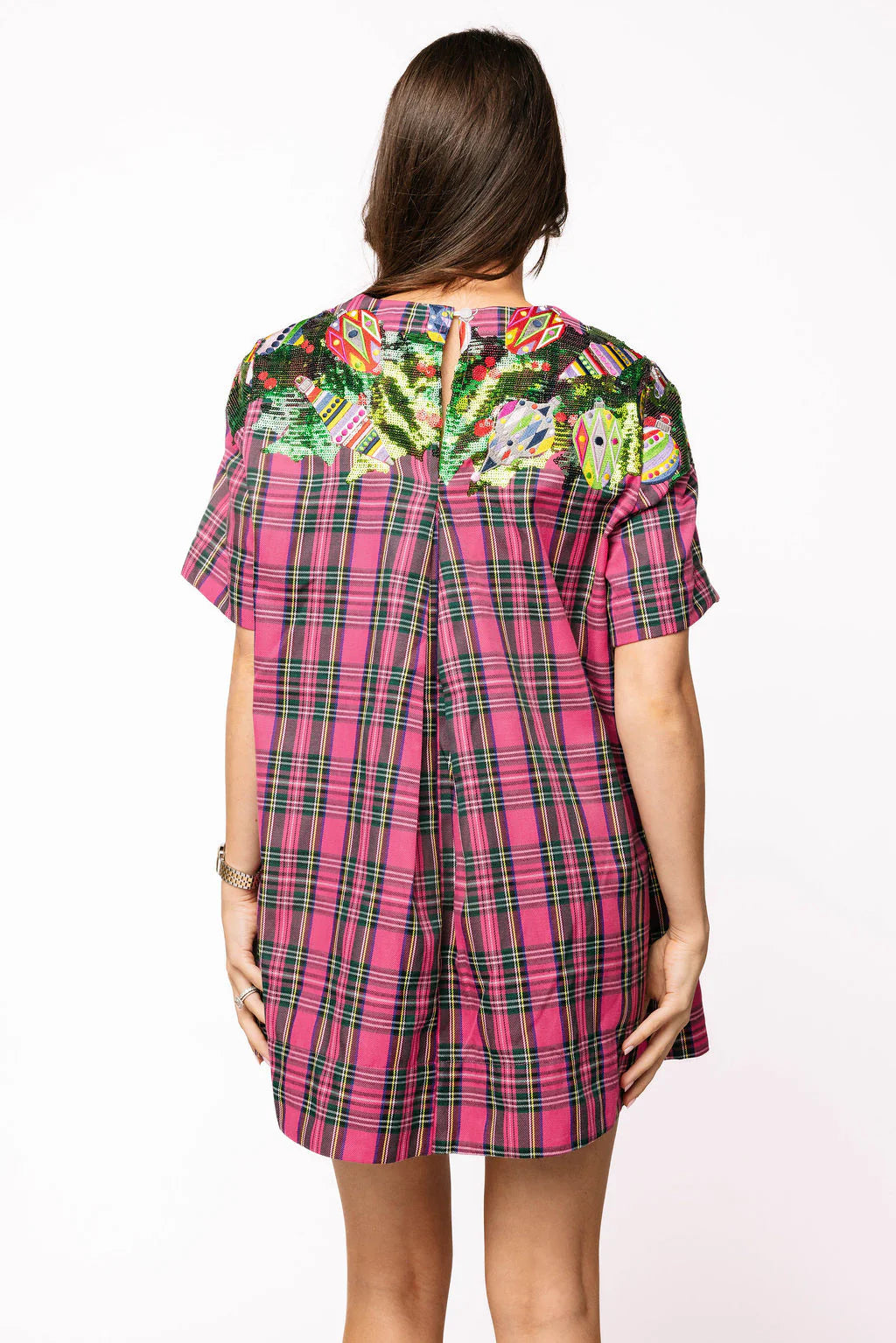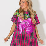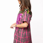 Pink Plaid Metallic Wreath Short Sleeve Cotton Dress | Queen Of Sparkles