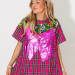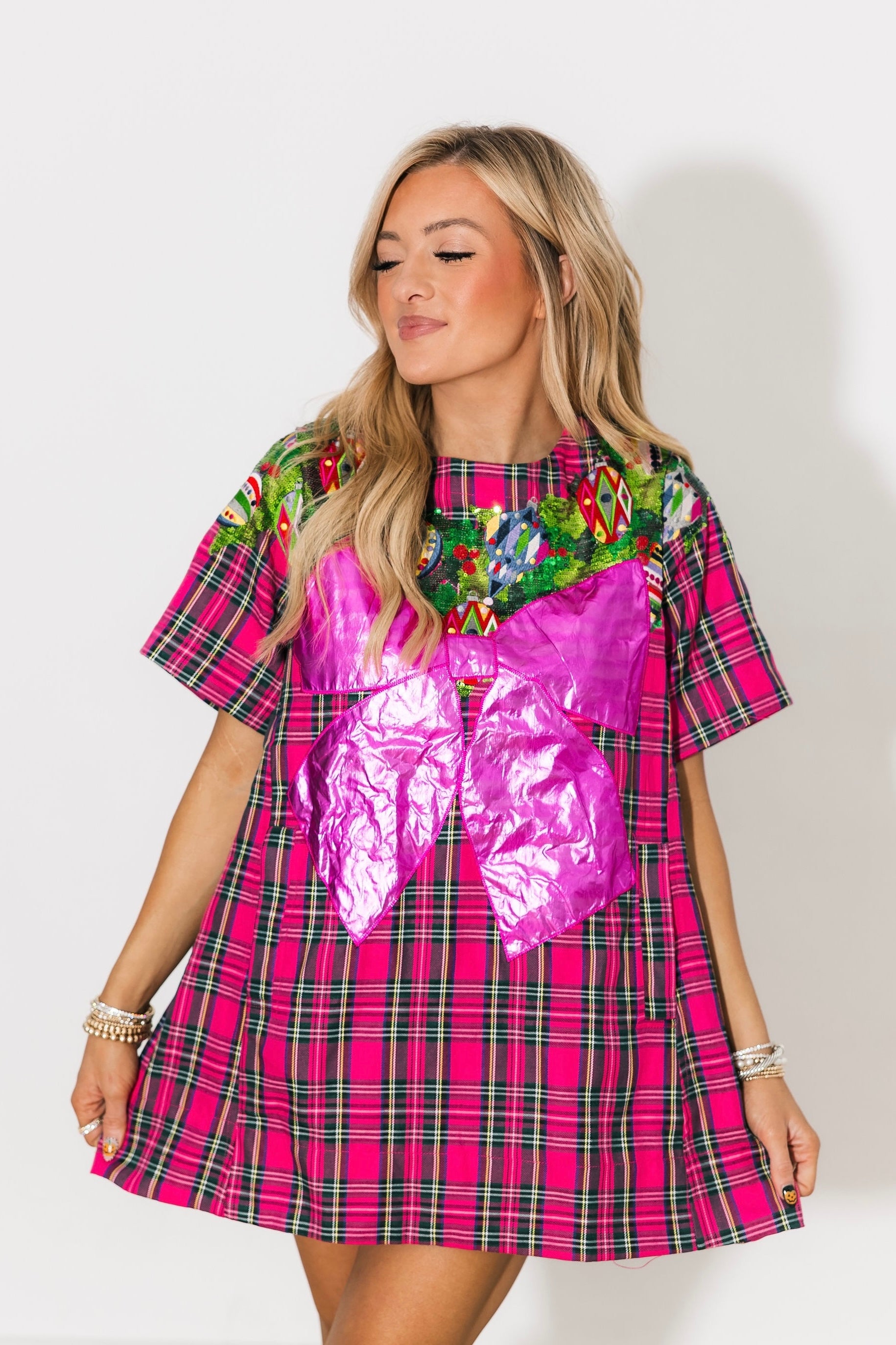 The Queen Of Sparkles Pink Plaid Metallic Wreath Short Sleeve Cotton Dress features a relaxed fit with a classic crewneck, short sleeves, and mini length. Designed with a cheerful plaid print and adorned with a sparkling wreath graphic topped with a big purple bow, this dress is perfect for holiday parties, festive photos, or adding a whimsical touch to your seasonal wardrobe. Lexi Jade is wearing an XS.