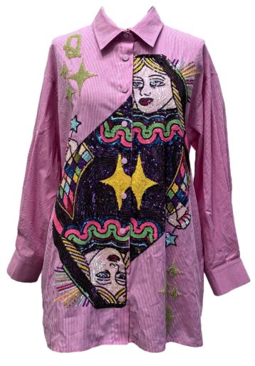 The Queen Of Sparkles Pink Queen Card Button Up Collar Cotton Dress features a relaxed, easygoing fit with a collared neckline, long sleeves, front button closure, and mini length. Soft cotton construction and playful Queen card graphics make it a versatile piece for casual outings or playful styling with layers and accessories.
