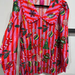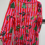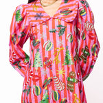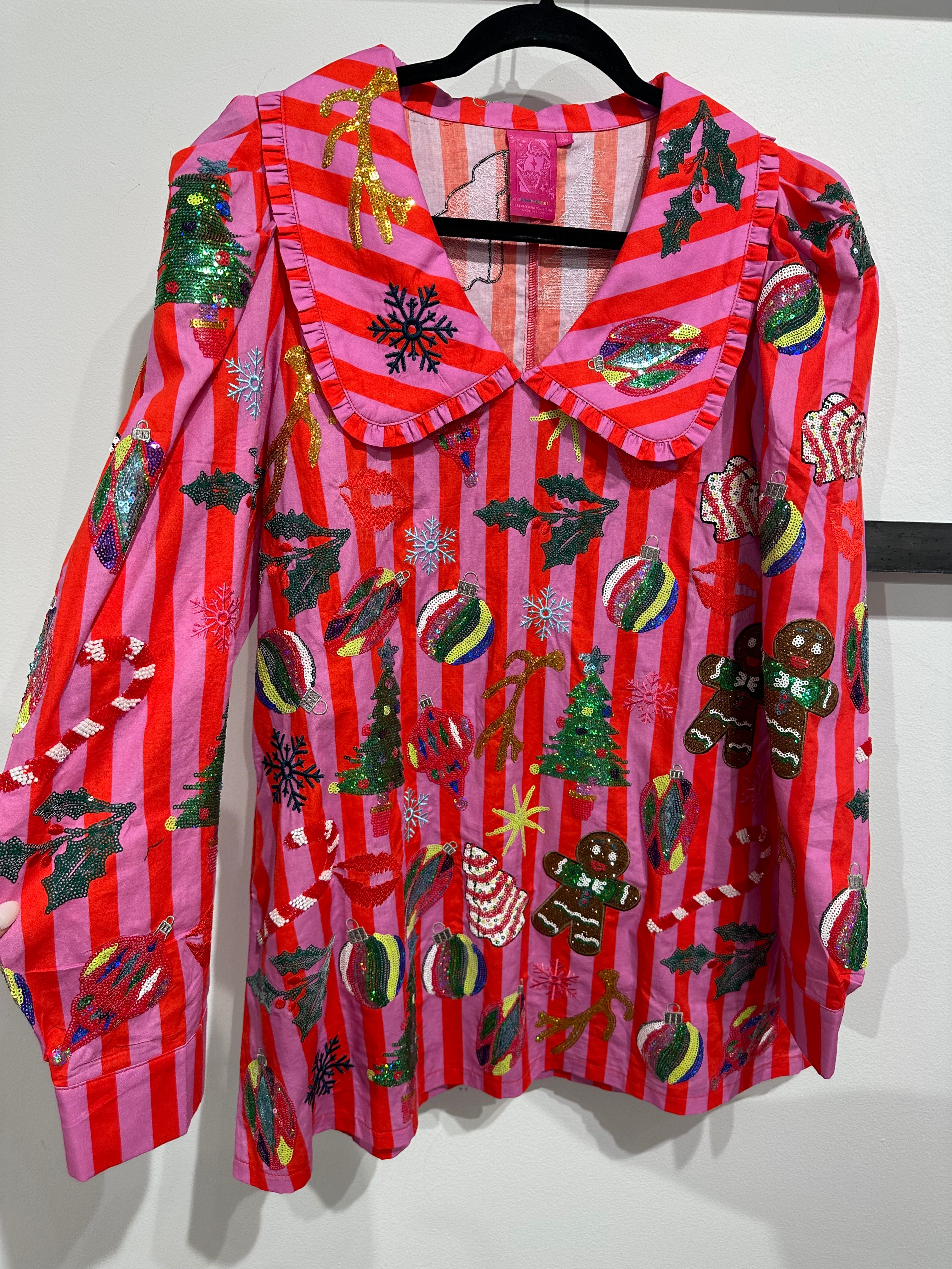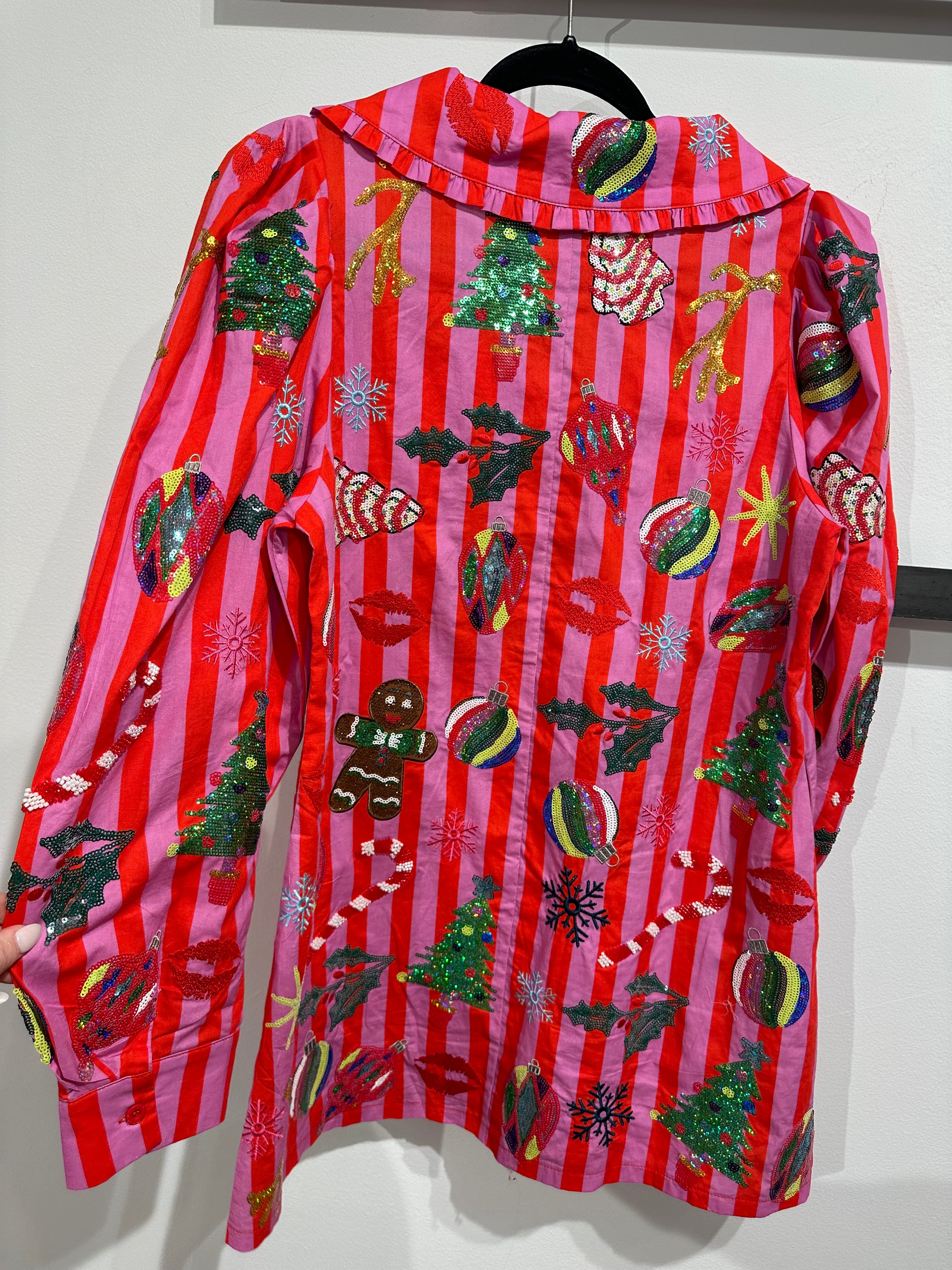 The Queen Of Sparkles Pink & Red Stripe Christmas Icon Collar Dress features a relaxed fit with a collared neckline, long sleeves, and a mini length. Designed in candy cane–inspired stripes and sprinkled with glittering Christmas icons, it’s a bold yet cozy holiday statement. Perfect for parties, photos, or any festive occasion—style it with boots for a chic seasonal look or sneakers for playful everyday wear.