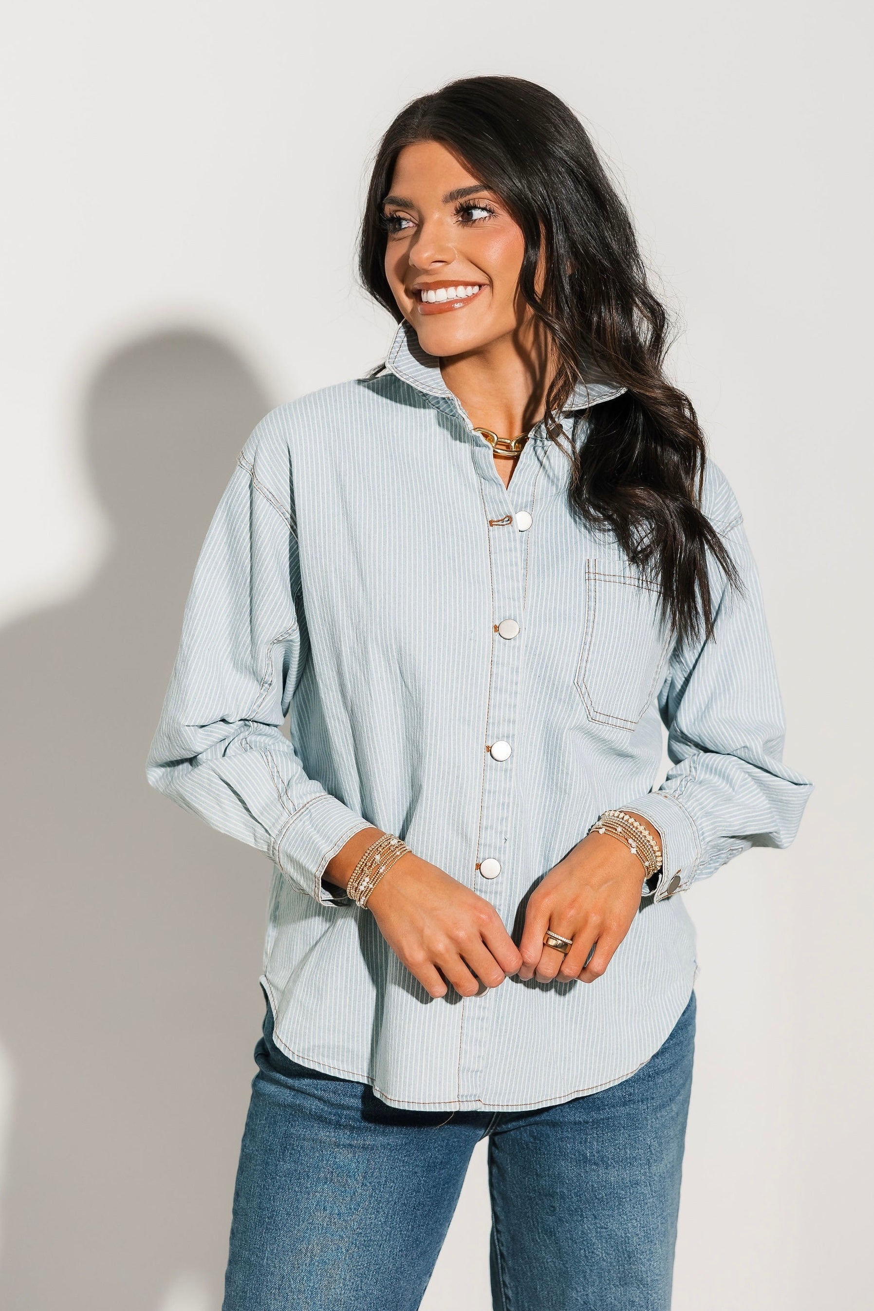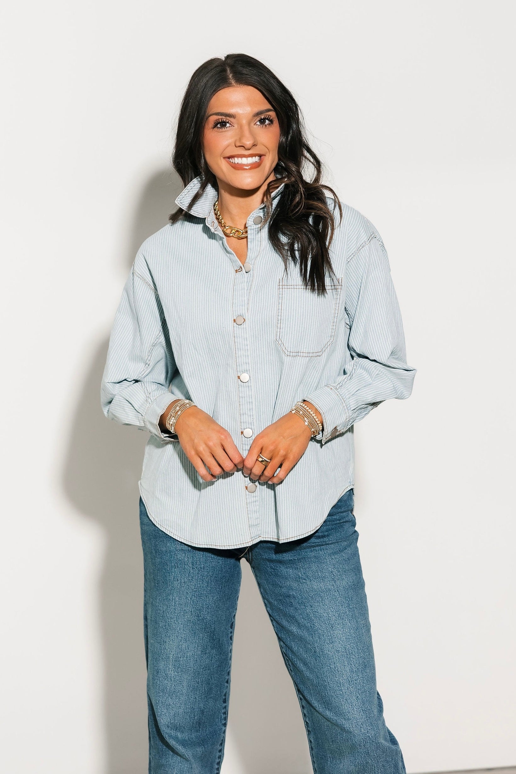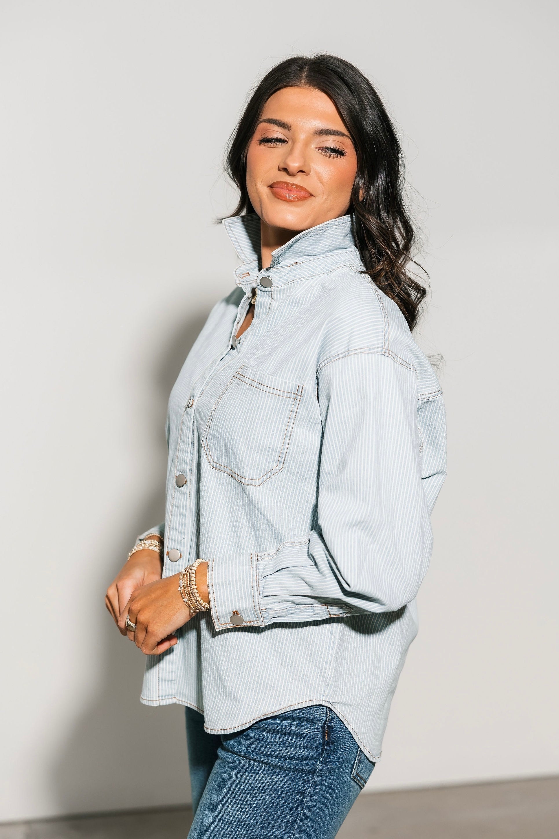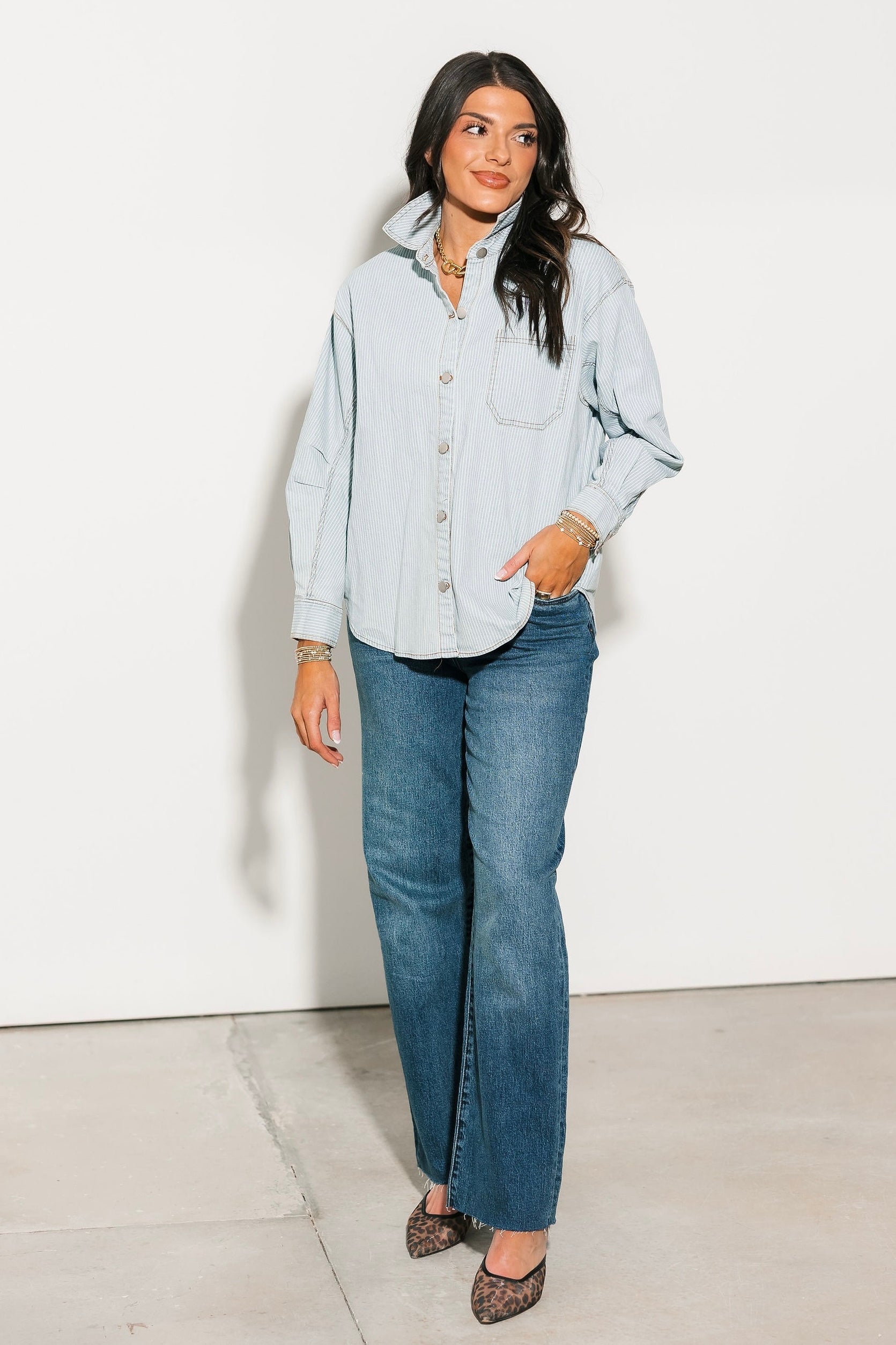This relaxed-fit denim shacket features classic pinstripe detailing, long sleeves, a collared neckline, and a full front button closure. With its structured yet comfortable feel, it’s the perfect layering piece to take any outfit from simple to effortlessly stylish. Harli is wearing a medium.