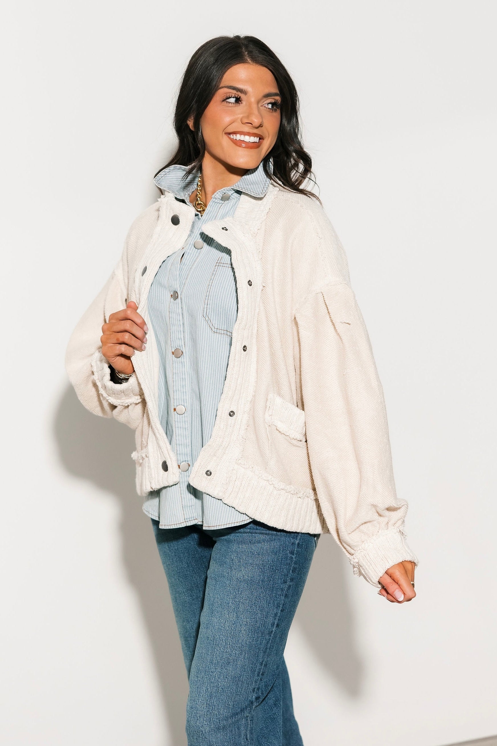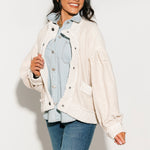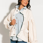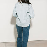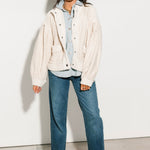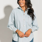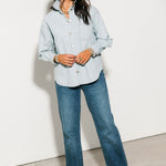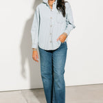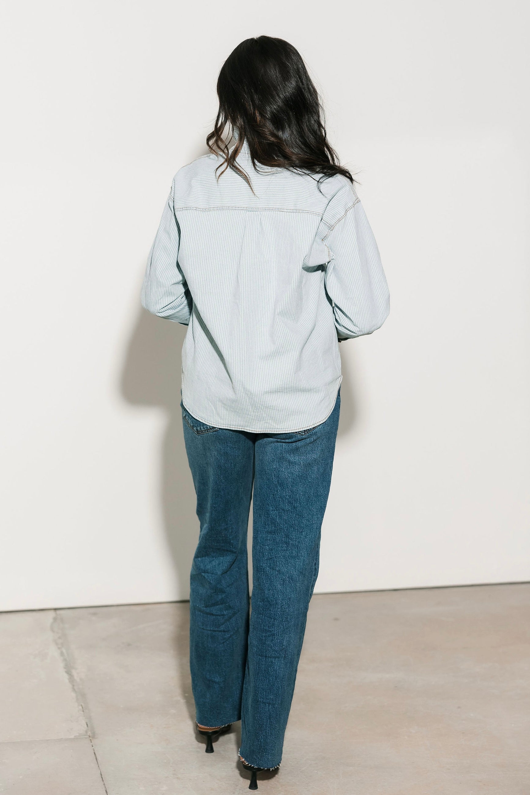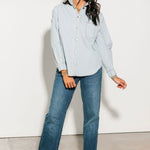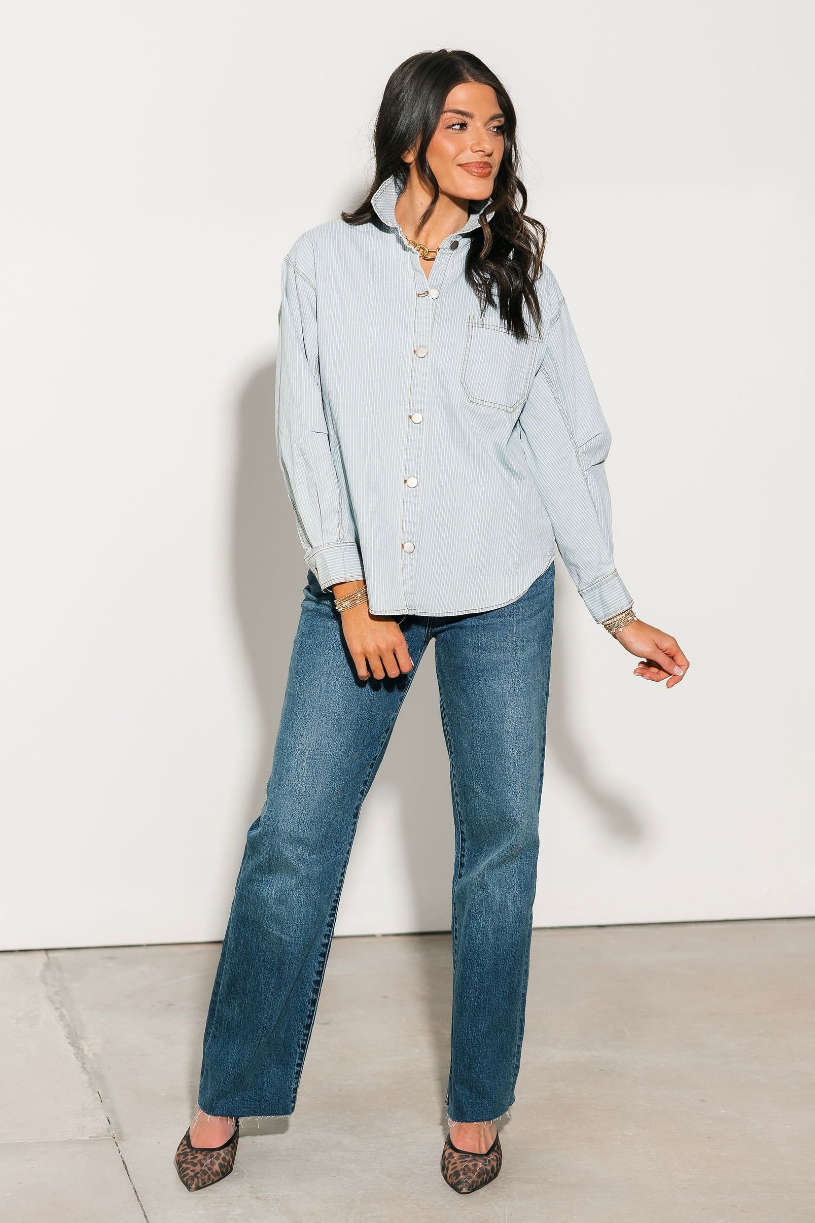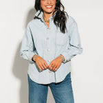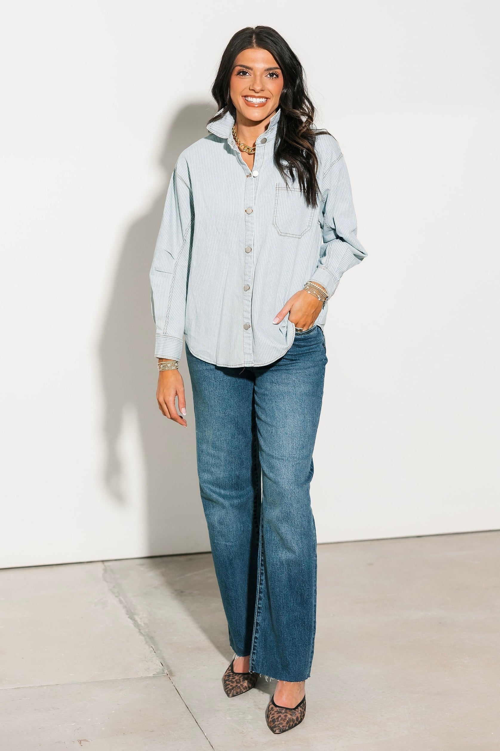 This relaxed-fit denim shacket features classic pinstripe detailing, long sleeves, a collared neckline, and a full front button closure. With its structured yet comfortable feel, it’s the perfect layering piece to take any outfit from simple to effortlessly stylish. Harli is wearing a medium.