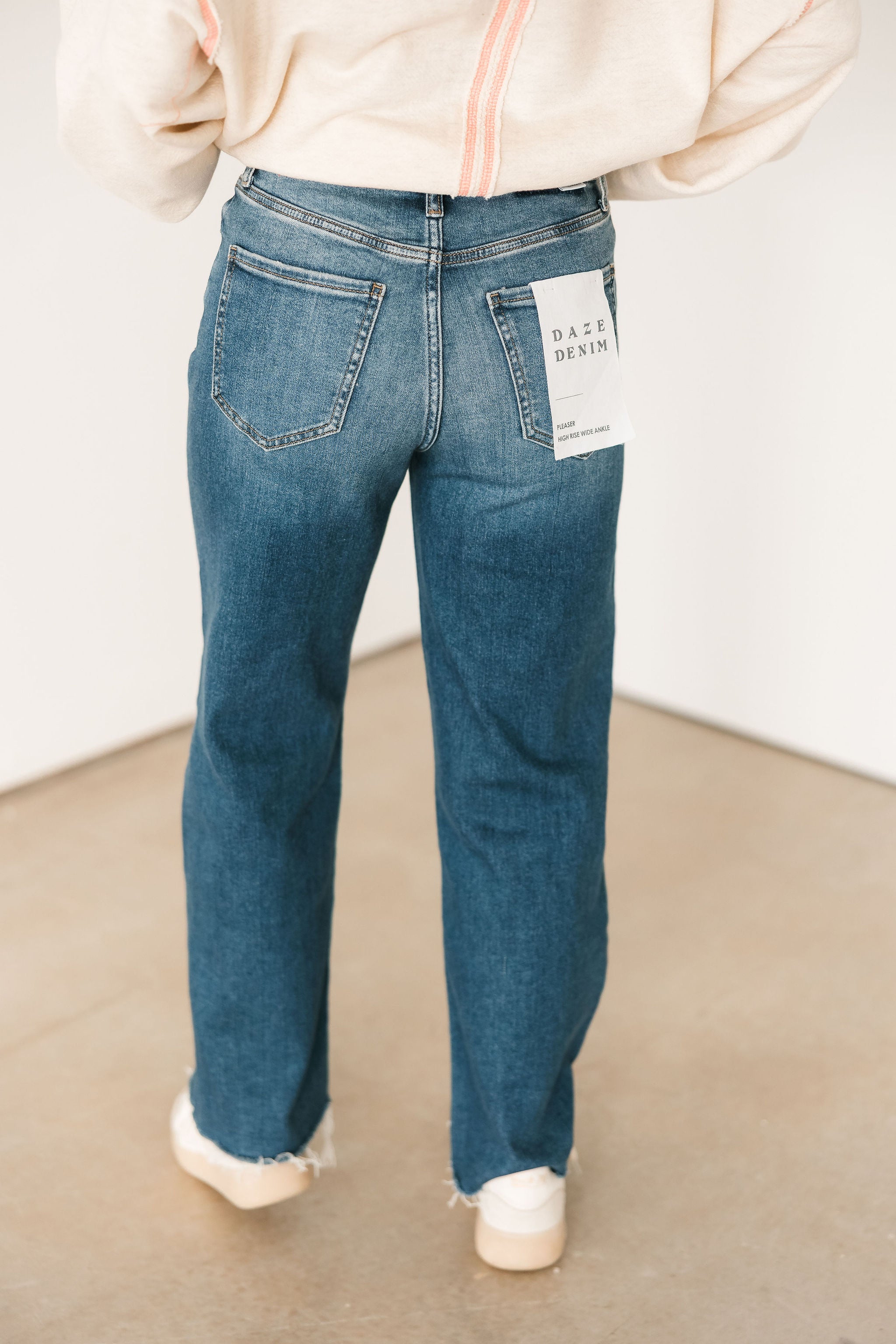 The Daze Pleaser High Rise Wide Ankle Jeans in Uptown feature a flattering high-waisted fit with a wide ankle silhouette and just the right amount of stretch for all-day comfort. Finished in a rich dark wash, they feel timeless and easy to style, whether you’re dressing them up with a blouse or keeping it casual with a tee.