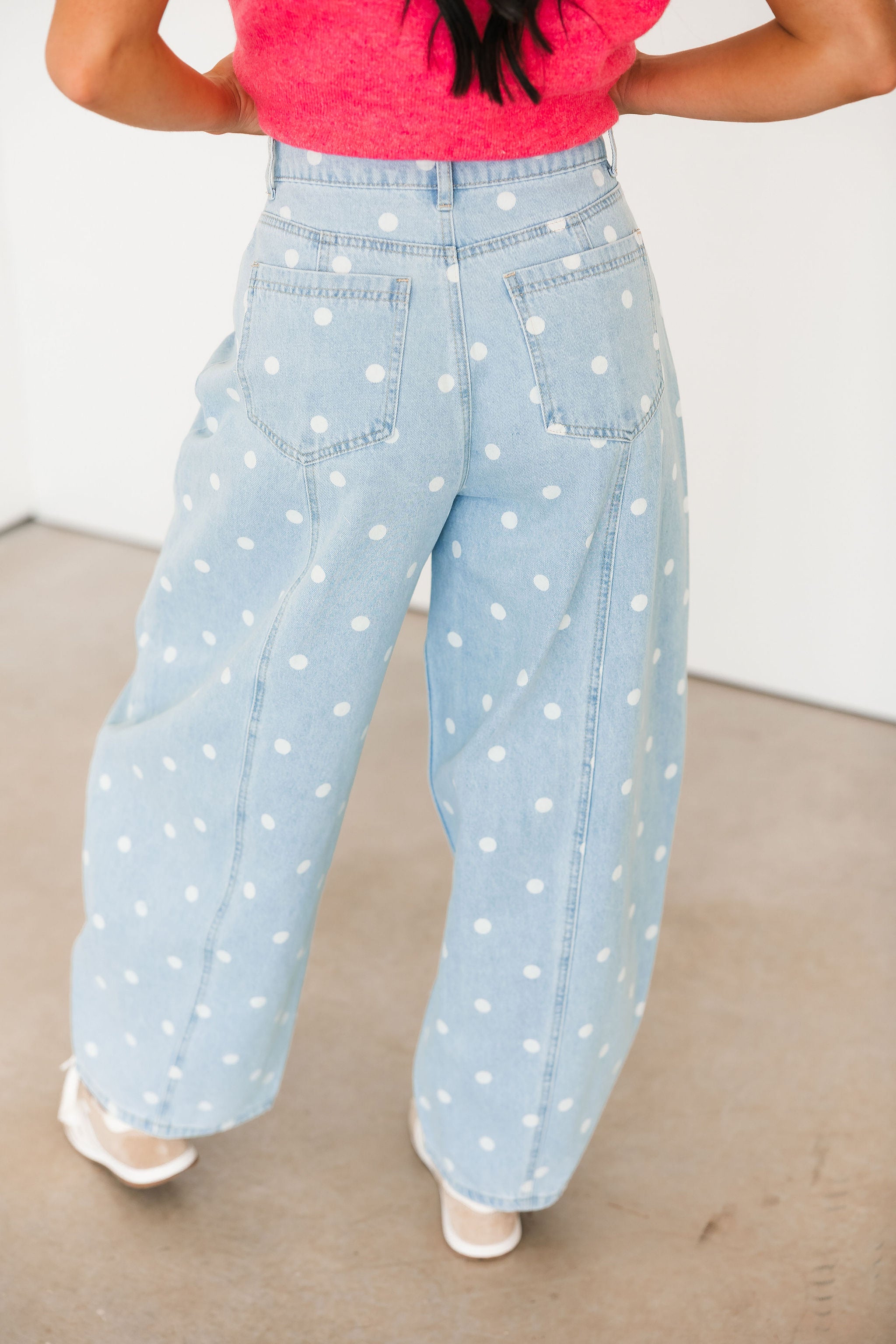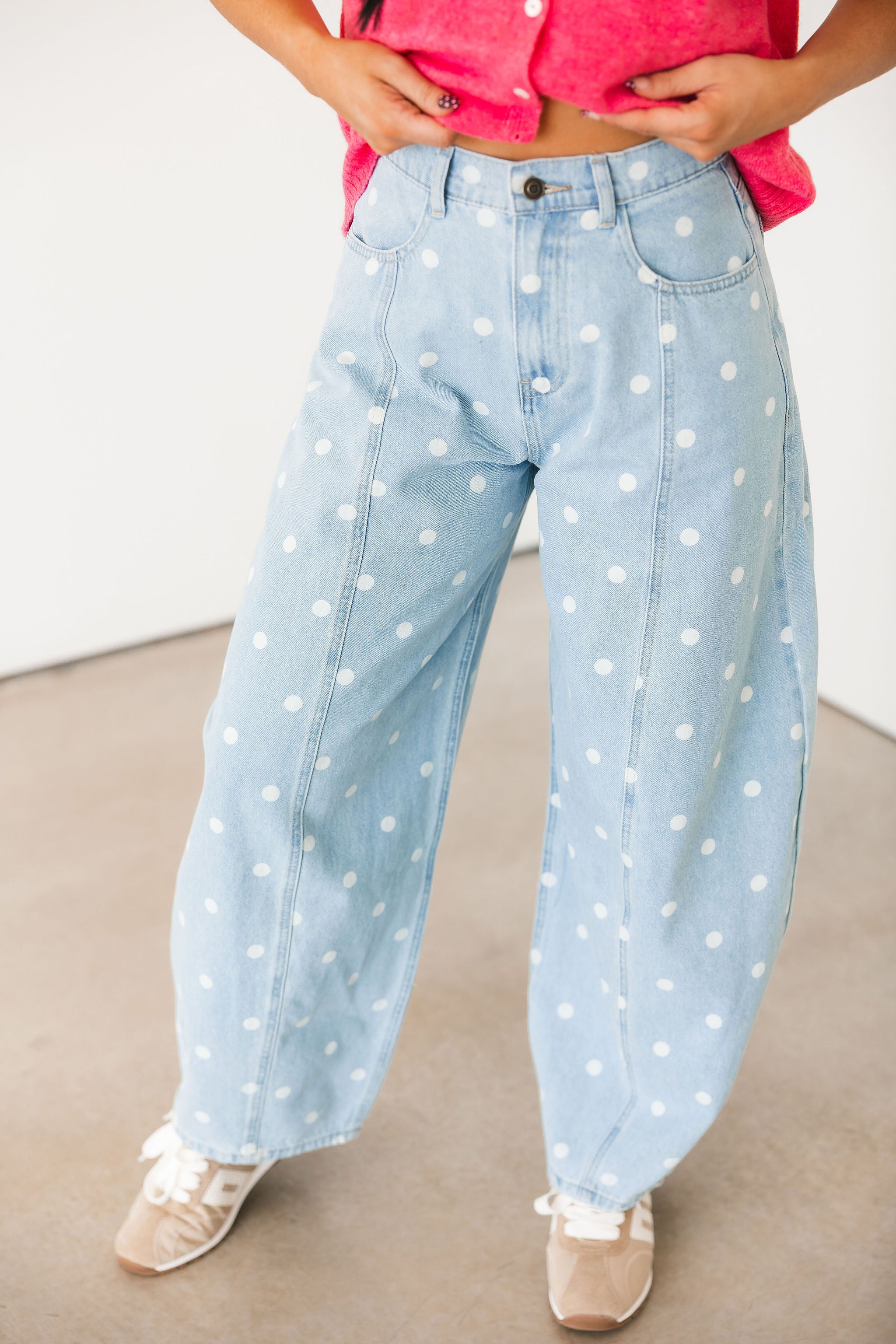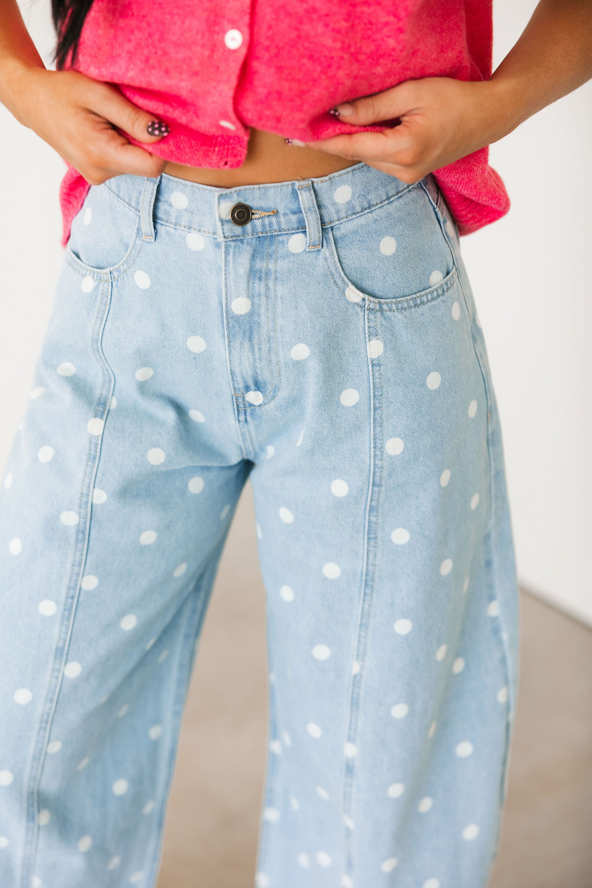 Our Polka Dot Barrel Jeans In Denim are the definition of fun and playful. With their eye-catching print and trendy barrel-leg fit, they make a statement all on their own. Just add a simple tee or sweater and let these standout jeans do all the talking. Sage is wearing a small.