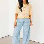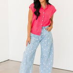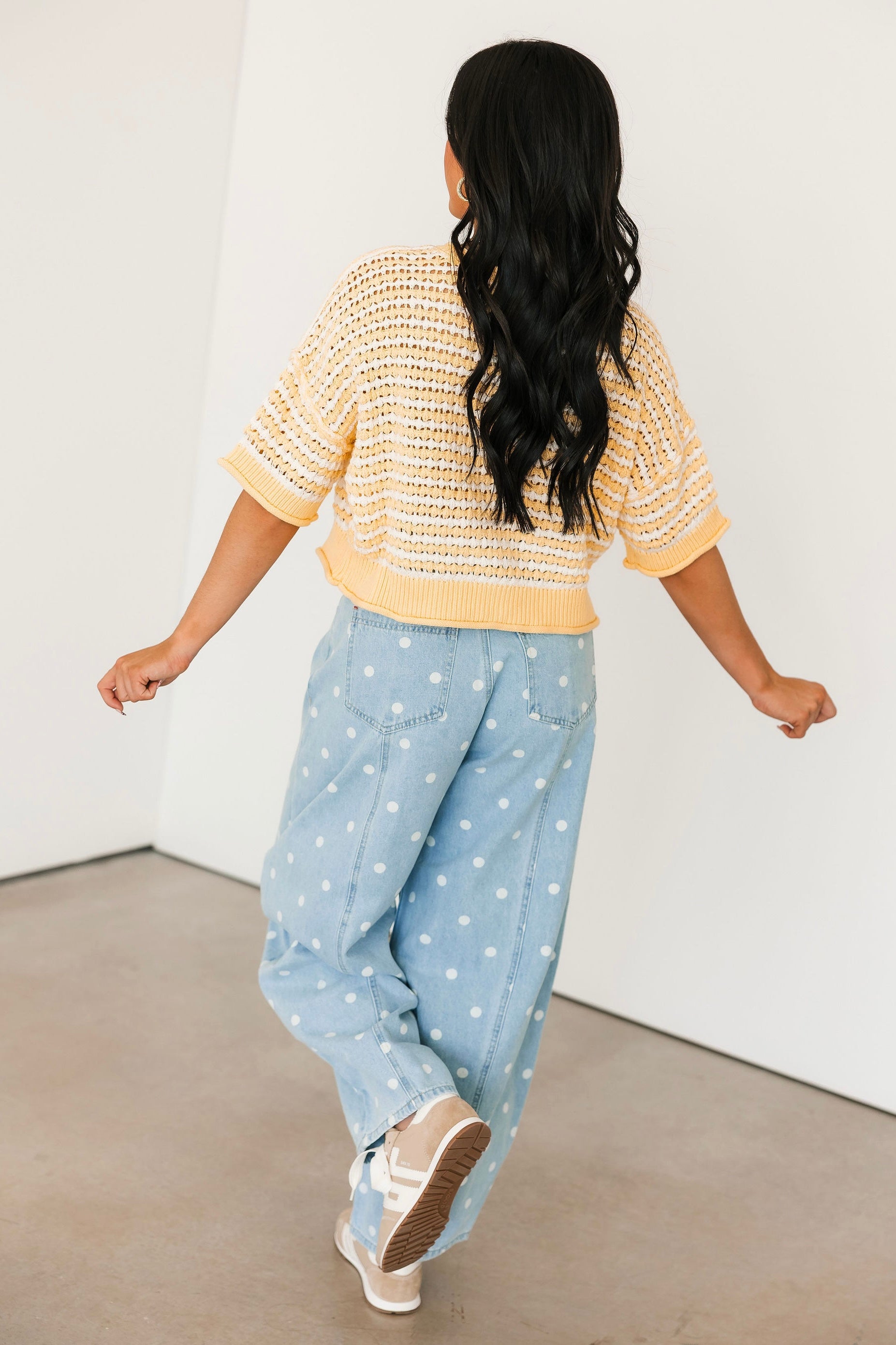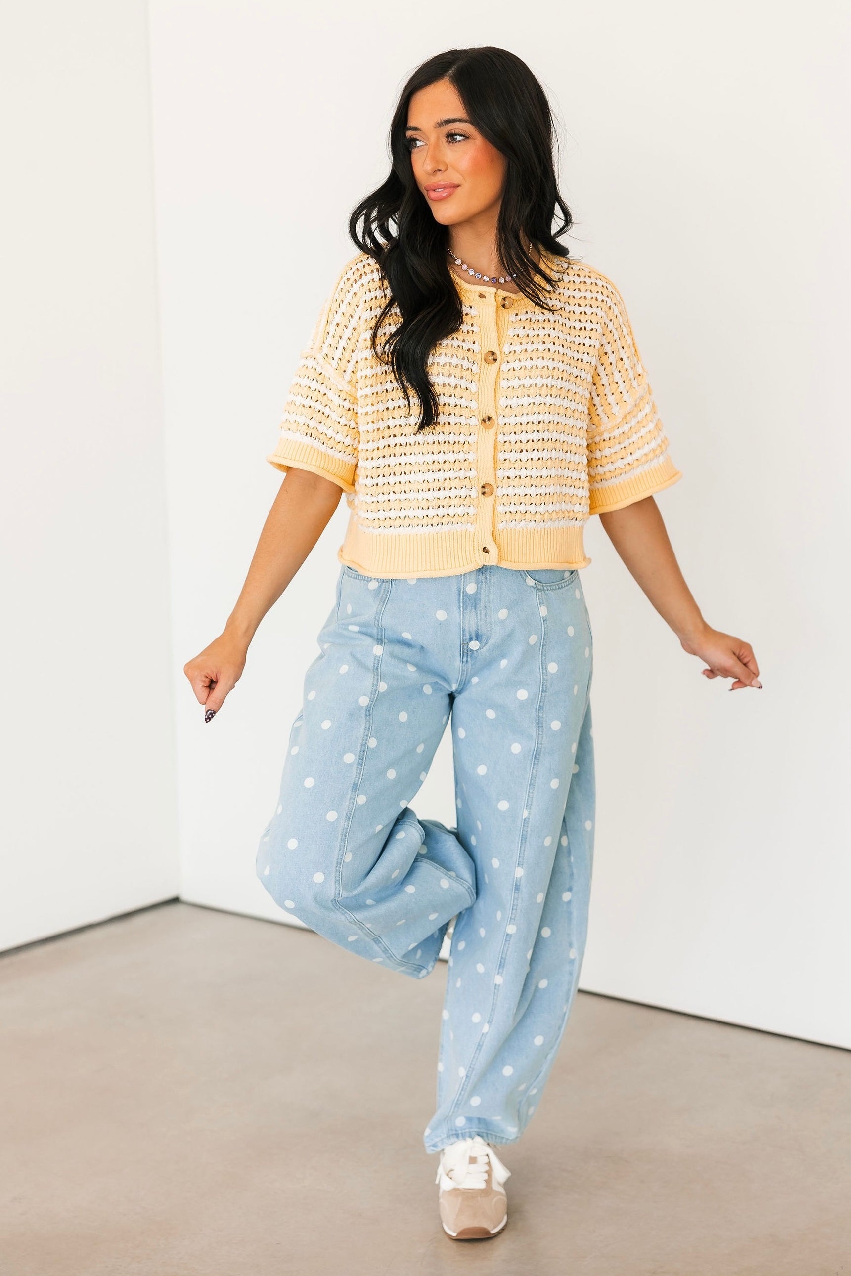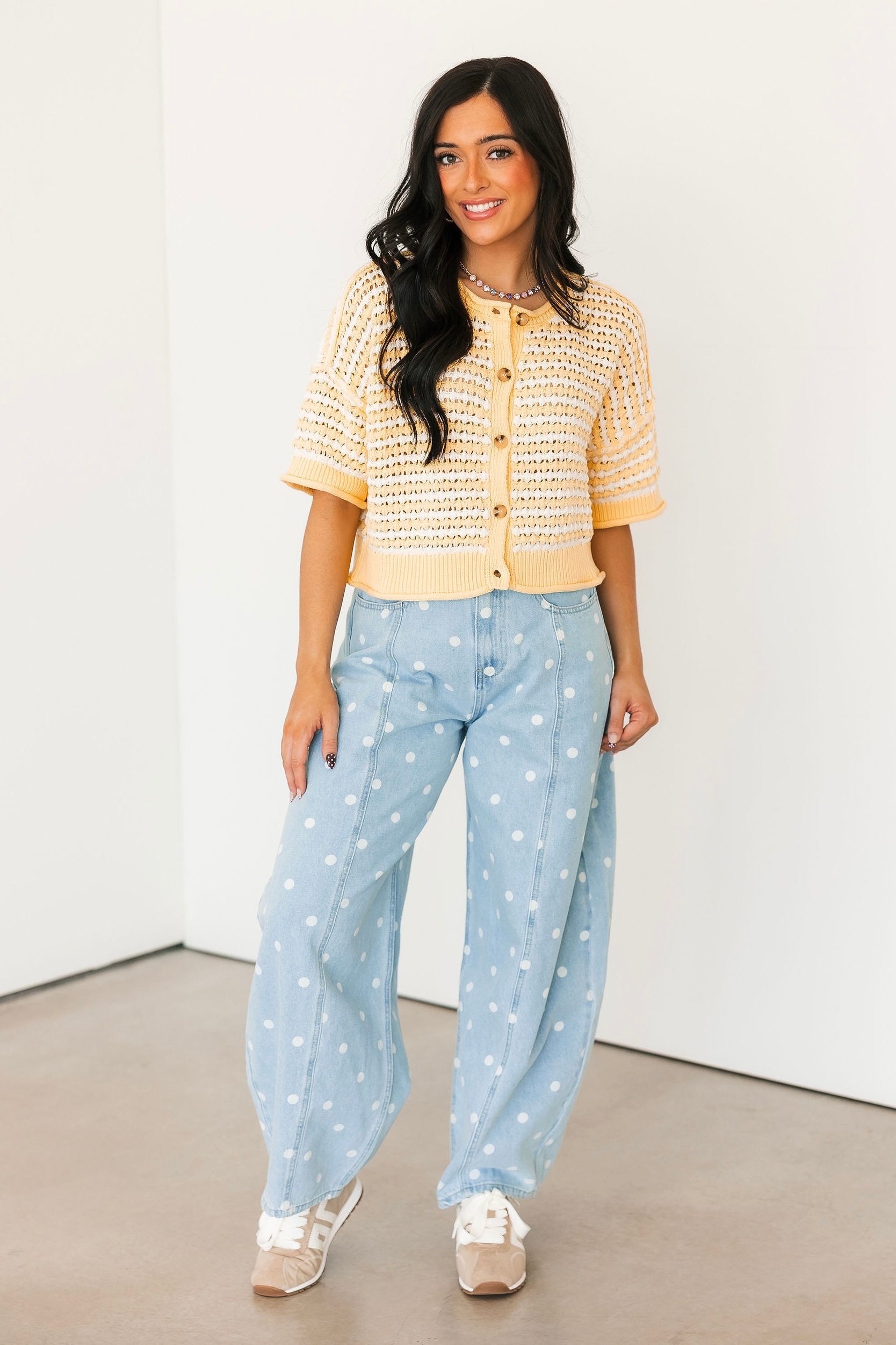 Our Polka Dot Barrel Jeans In Denim are the definition of fun and playful. With their eye-catching print and trendy barrel-leg fit, they make a statement all on their own. Just add a simple tee or sweater and let these standout jeans do all the talking. Sage is wearing a small.