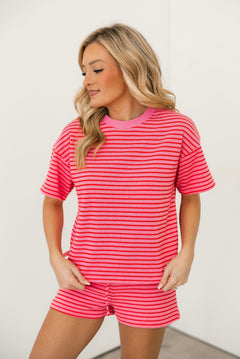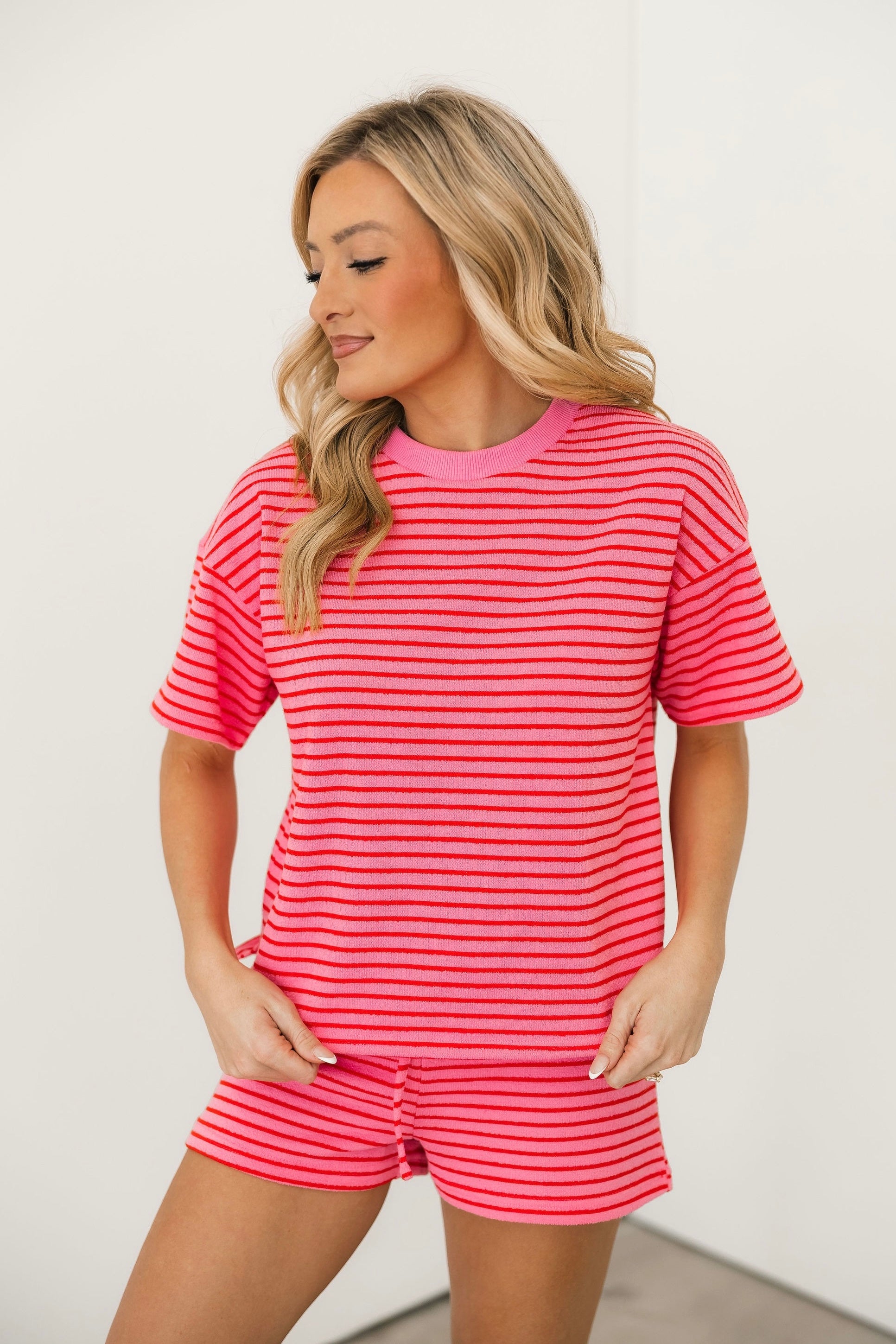 Easy, comfy, and made for laid-back days β the Posey Striped Shorts in Pink are the perfect mix of cozy and cute. Designed with a relaxed, easy fit, these soft terrycloth shorts feature a comfortable elastic waistband with an adjustable drawstring for the perfect fit. The classic striped pattern adds a playful touch, making them perfect for lounging, running errands, or pairing with the matching Posey Striped Top for an effortlessly put-together set. Lexi is wearing a small. πβ¨