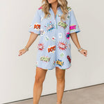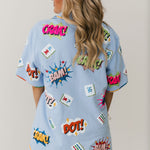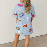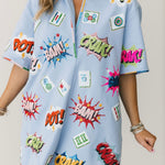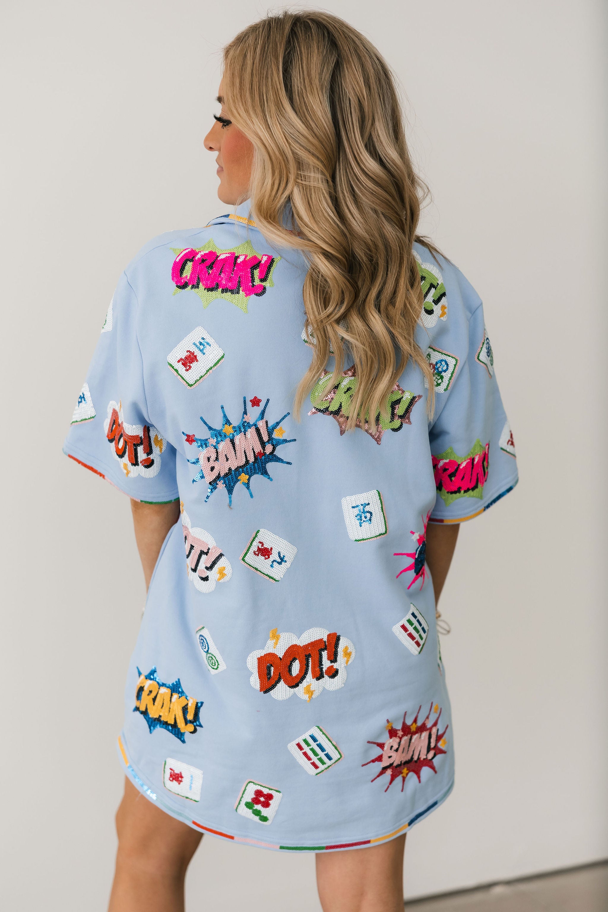 Stand out in the Queen Of Sparkles Powder Blue Mahjong Icon Collar Rainbow Trim Dress. With a relaxed fit, V-neck, collared neckline, and short sleeves, this mini dress is both comfortable and stylish. Colorful mahjong graphics and rainbow trim add a fun, eye-catching detail that makes it a statement piece for any Mahjong Queen. Lexi Jade is wearing an XS.