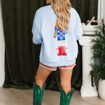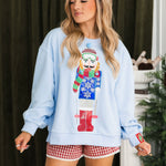 The Queen Of Sparkles Powder Blue Skiing Nutcracker Sweatshirt features a relaxed fit with a classic crewneck and long sleeves. Designed with a sparkling nutcracker graphic on a soft powder blue base, this cozy piece is perfect for holiday gatherings, winter outings, or adding a cheerful touch to your seasonal wardrobe. Lexi Jade is wearing an XS.