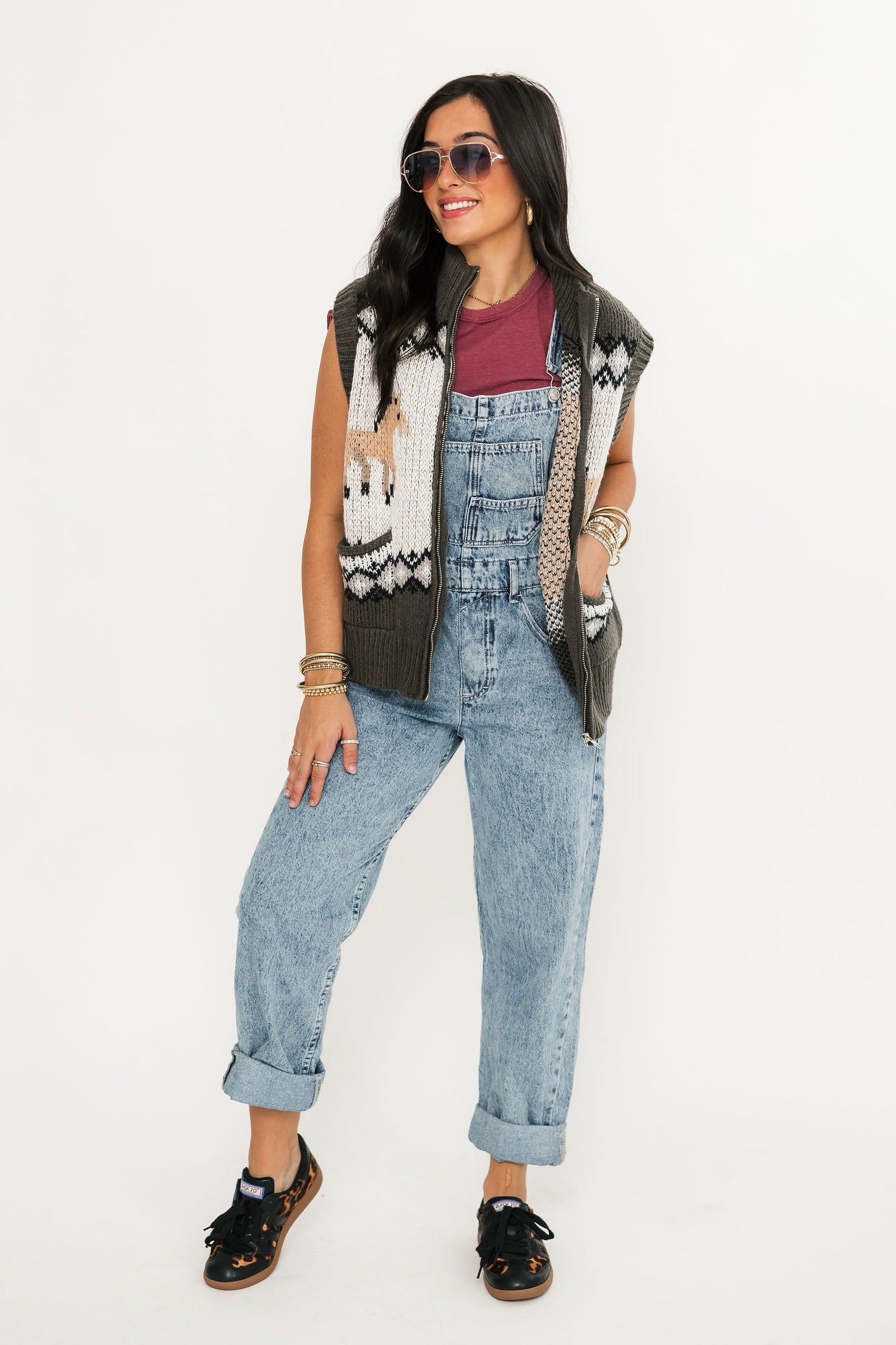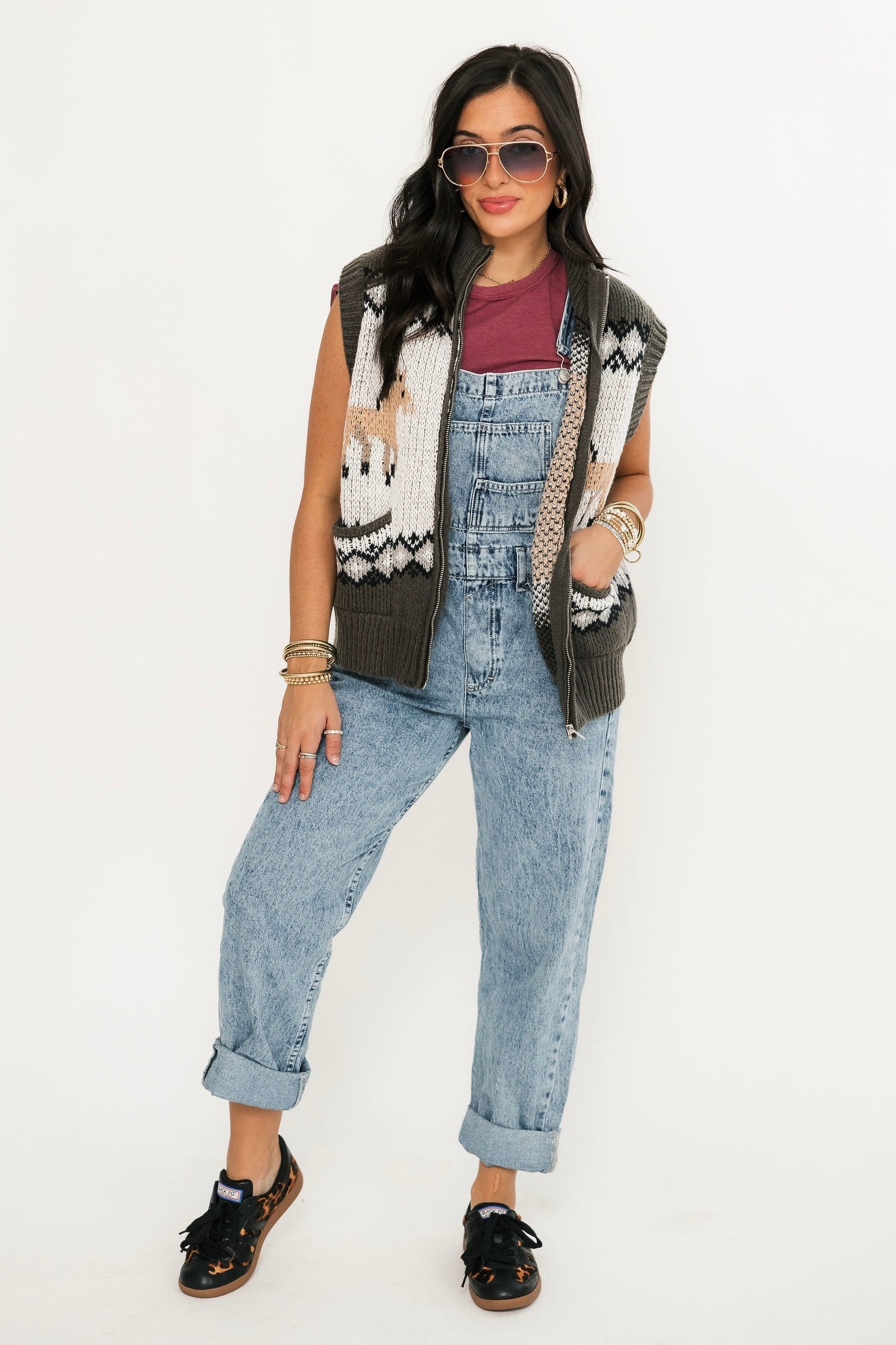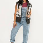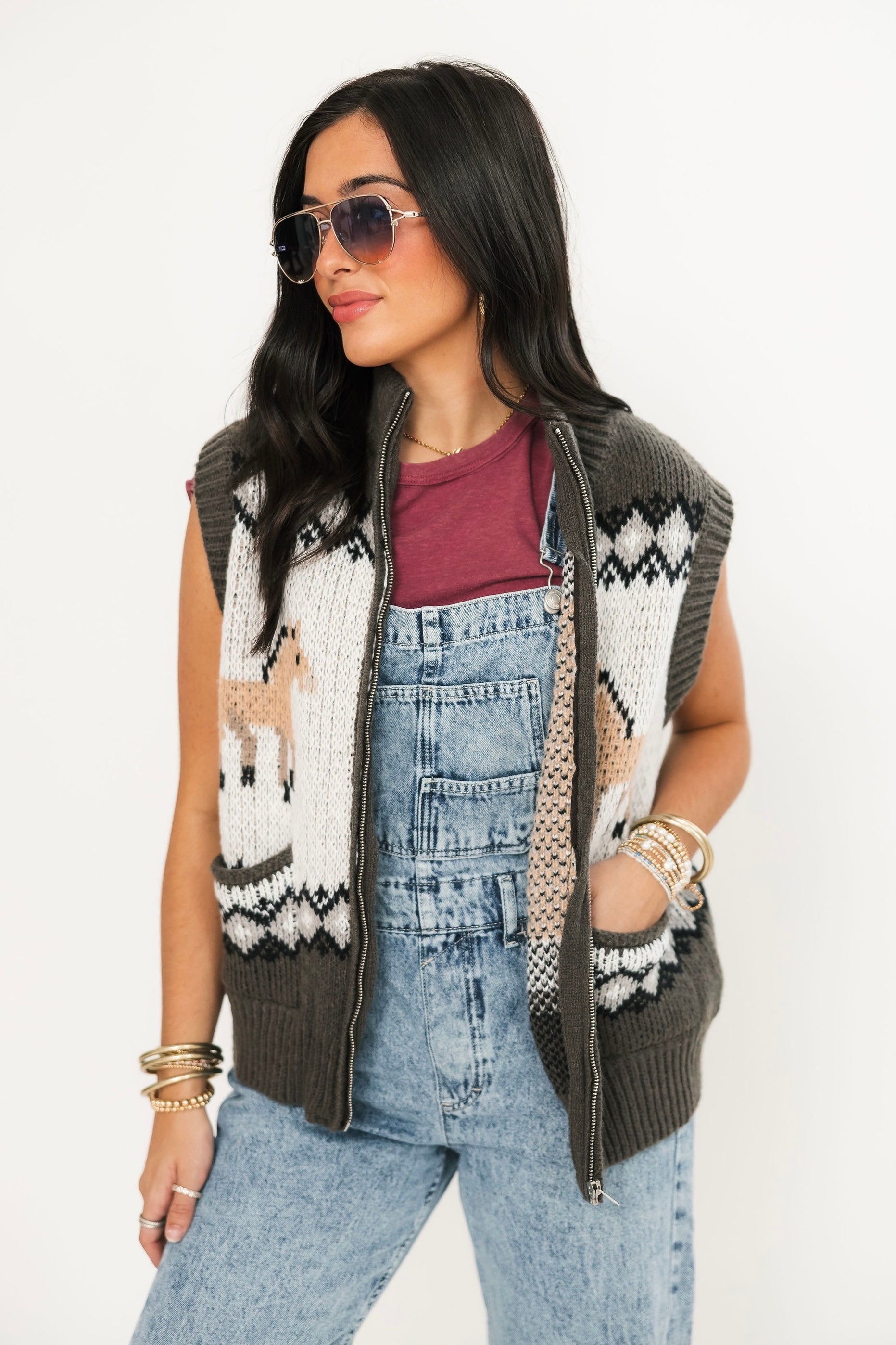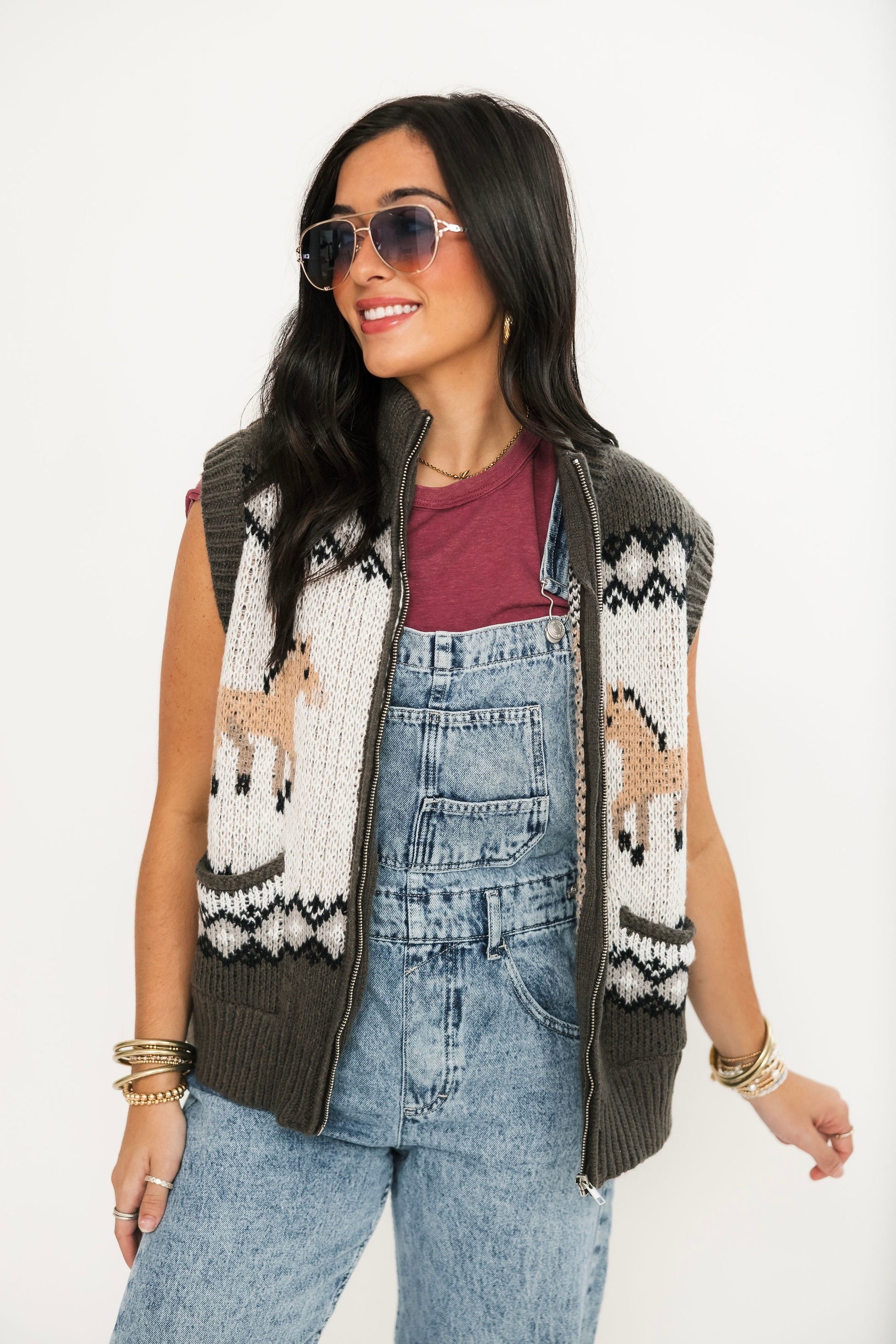 The Prairie Pony Sweater Vest is a fitted, sleeveless style with a front zip closure and whimsical pony graphics. Perfect for layering or wearing on its own, it brings a touch of western-inspired flair to any outfit. A fun and unique piece to freshen up your wardrobe. Lexi and Sage are both wearing an xs.