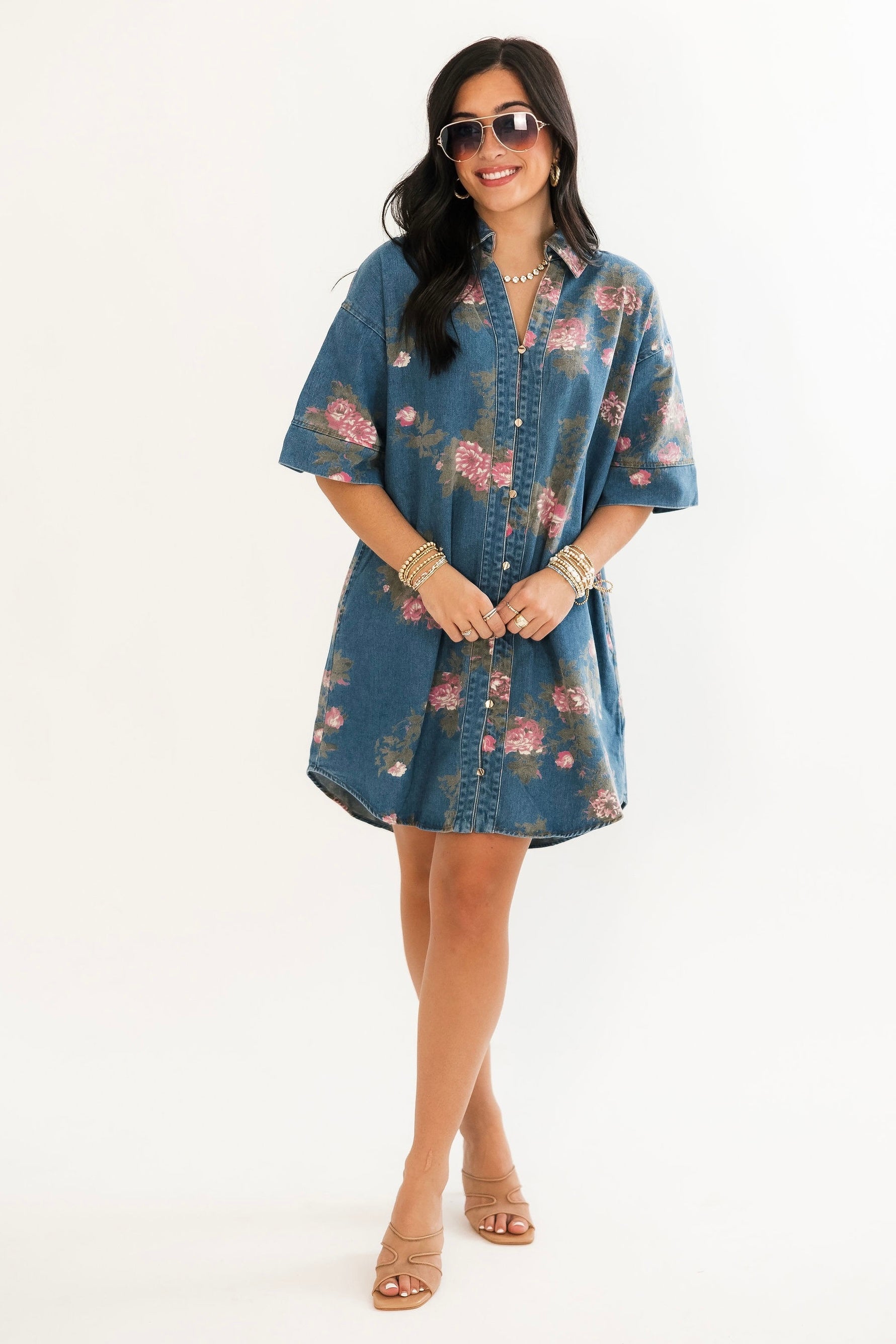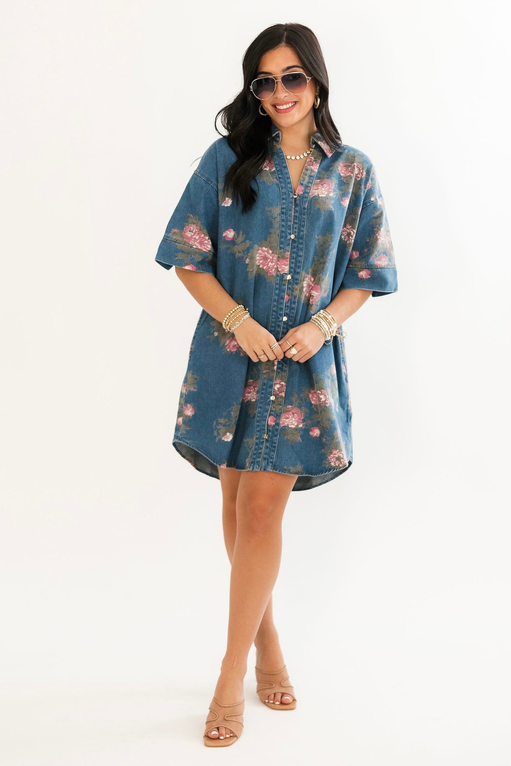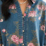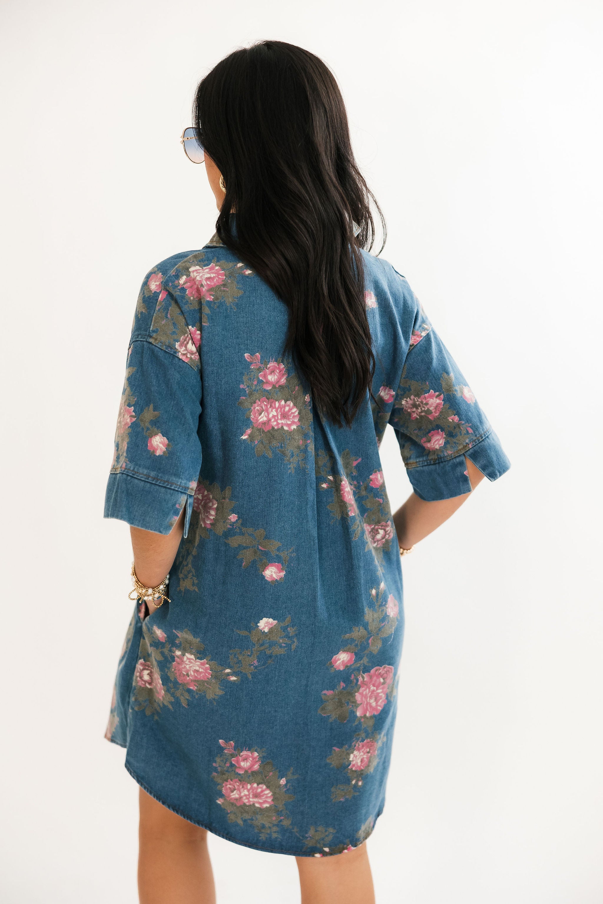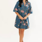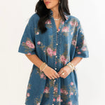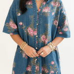 The Prairie Rose Denim Dress blends everyday comfort with timeless charm. Designed with a relaxed fit, it features a delicate floral print over soft denim for a feminine-meets-casual look. With elbow-length sleeves, a flattering v-neckline, and a button-up shirt dress style, it’s easy to dress up or down. Side pockets add a practical finish, making it the perfect go-to piece for effortless style. Sage is wearing a small.