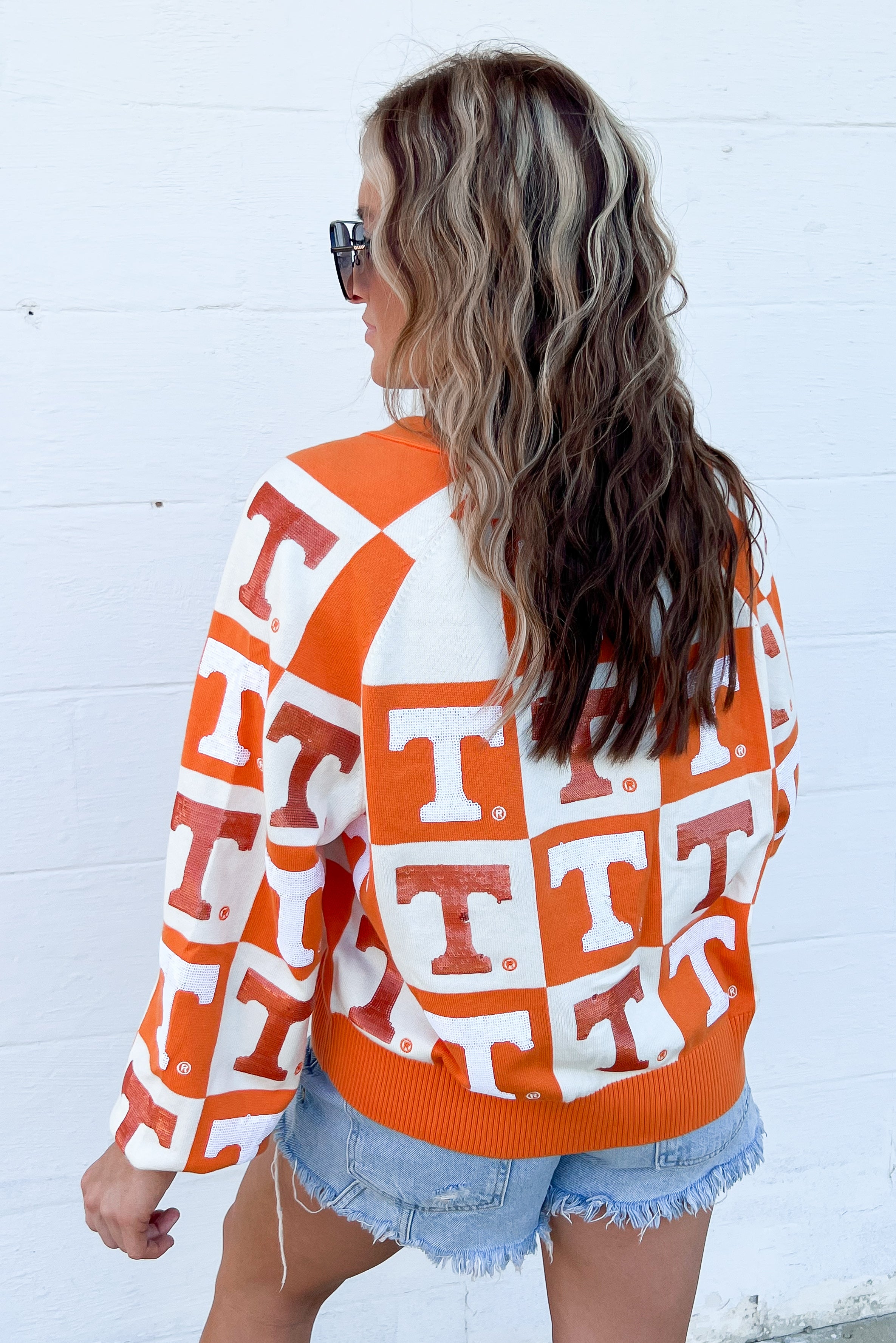 Queen Of Sparkles Orange & White Tennessee Checkered Cardigan