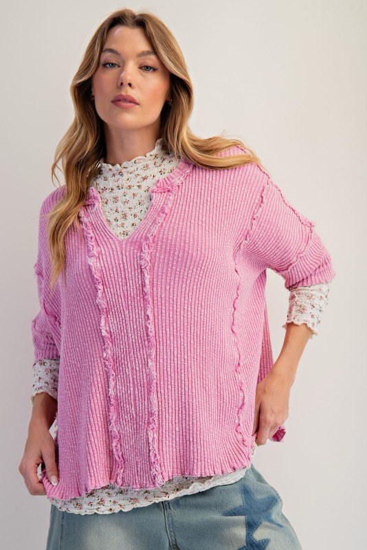 Easy, everyday magic. Washed to perfection in the softest bubblegum pink, this laid-back tee is your new go-to for campus strolls, coffee runs, and everything in between. Designed with a relaxed fit and lived-in texture, it features raw edges, a subtly uneven hem, and a ribbed V-neck that adds a touch of undone charm. Toss it on with denim cutoffs or slouchy cargos—this one's made for those effortlessly cool, out-the-door moments.