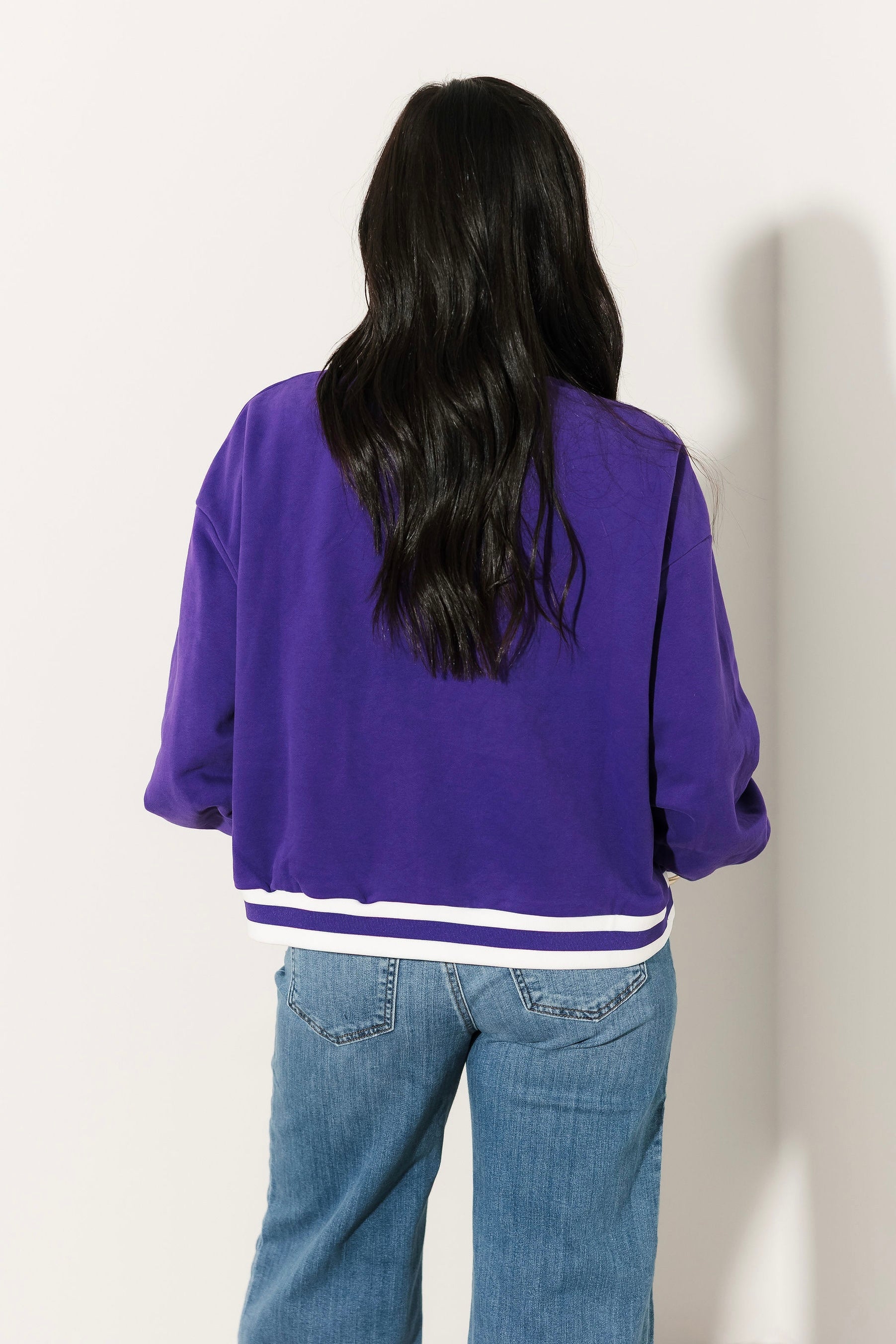 The Queen Of Sparkles Purple Jeweled Basketball Sweatshirt brings cozy comfort and eye-catching glam together in one statement piece. Designed with a relaxed crewneck fit and long sleeves, this sweatshirt is perfect for staying comfy while standing out. The jeweled basketball graphic delivers a playful pop of sparkle, making it just as perfect for cheering courtside as it is for styling into your everyday wardrobe. Pair with denim or leather for a versatile look that goes from casual to chic with ease. Sage is wearing an XS.